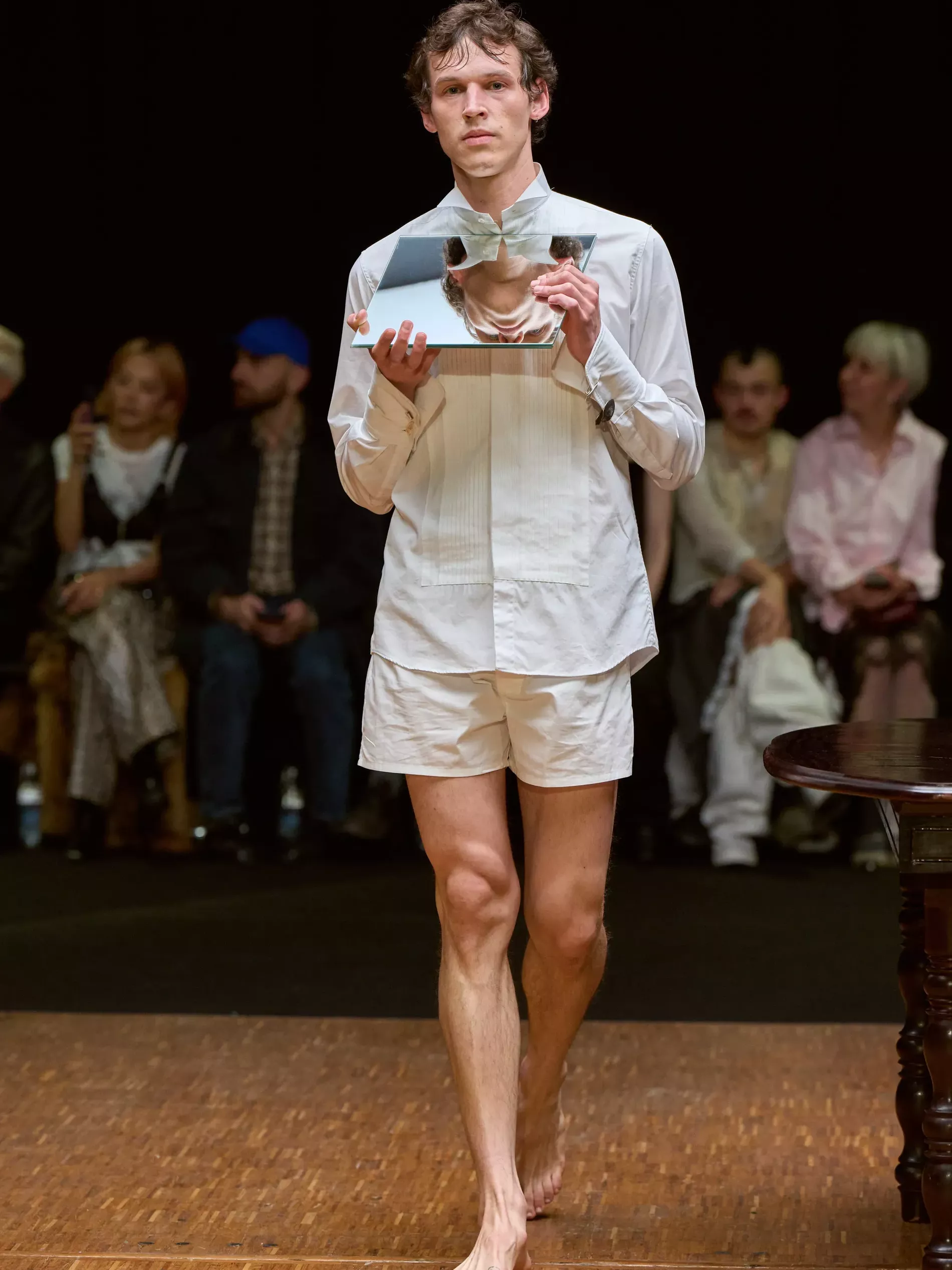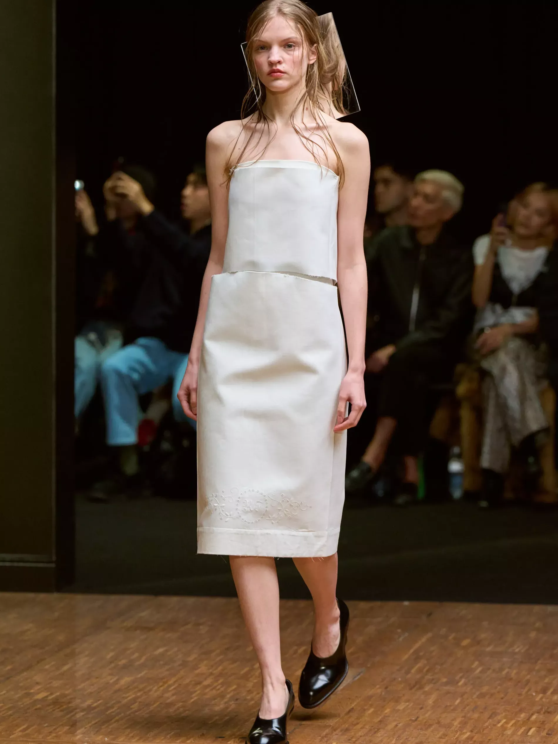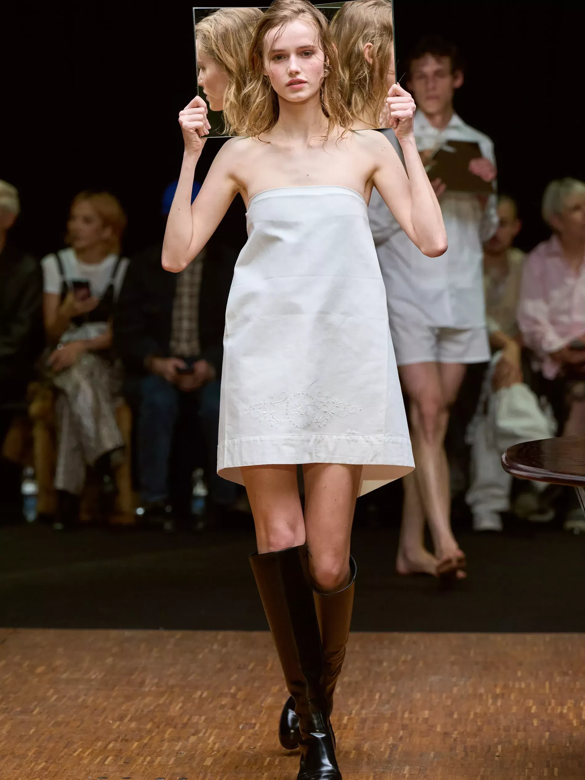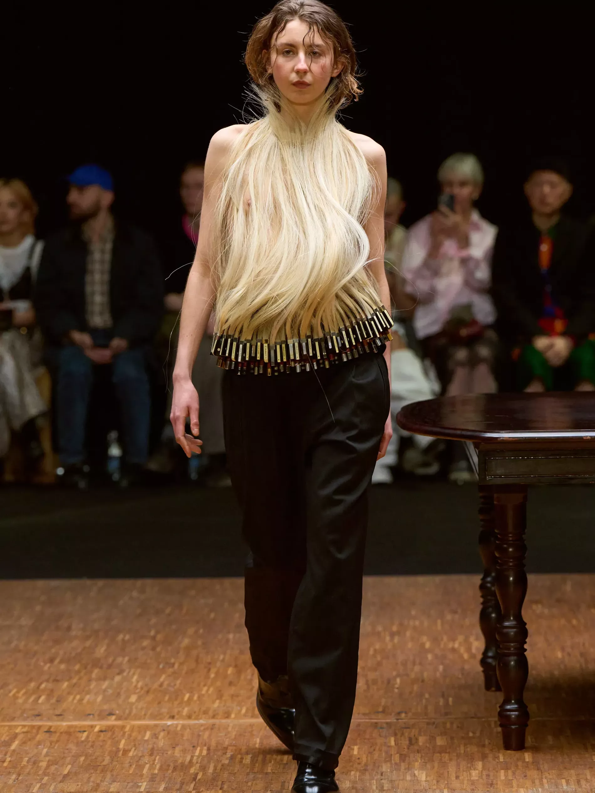 Mirrors were used as props but they were representative of introspection (and in the case of the three-panel one, Last Weekend at Marienbad), rather than interior design. The models with mirrors wore white looks made from bed sheets, perhaps referencing the pure self or the subconscious surfacing in dreams. Larsson alluded to something similar by excavating found objects and repurposing or reframing them within a sartorial context. The silken strands that snaked up the body and linked at the neck (as zippers have in the past) were not shades of blonde hair samples but horsehair violin strings, which tied into Larsson’s beauty reference, “a sweaty pianist.” She imagined the musician being well-dressed for the performance, and then getting lost in the music. The true self, she said, “is created by those actions.”