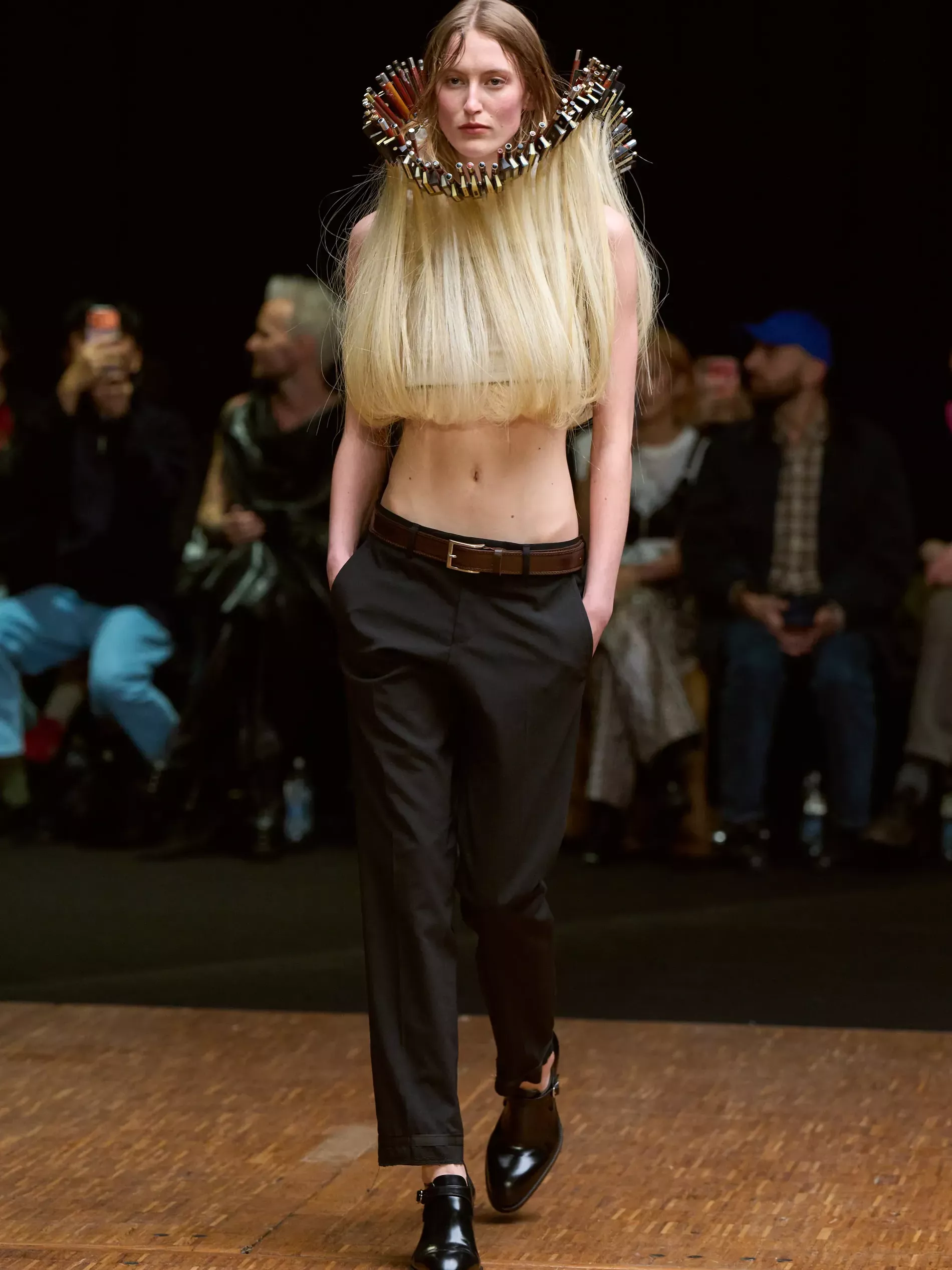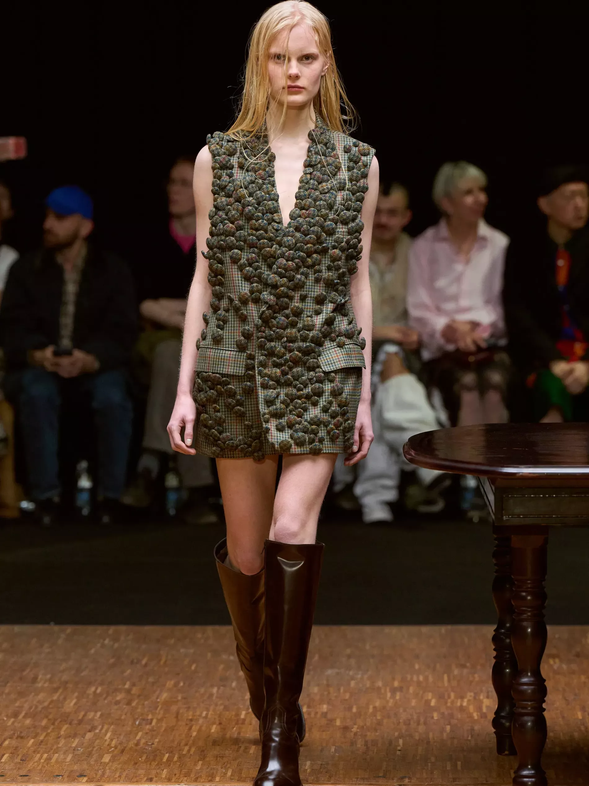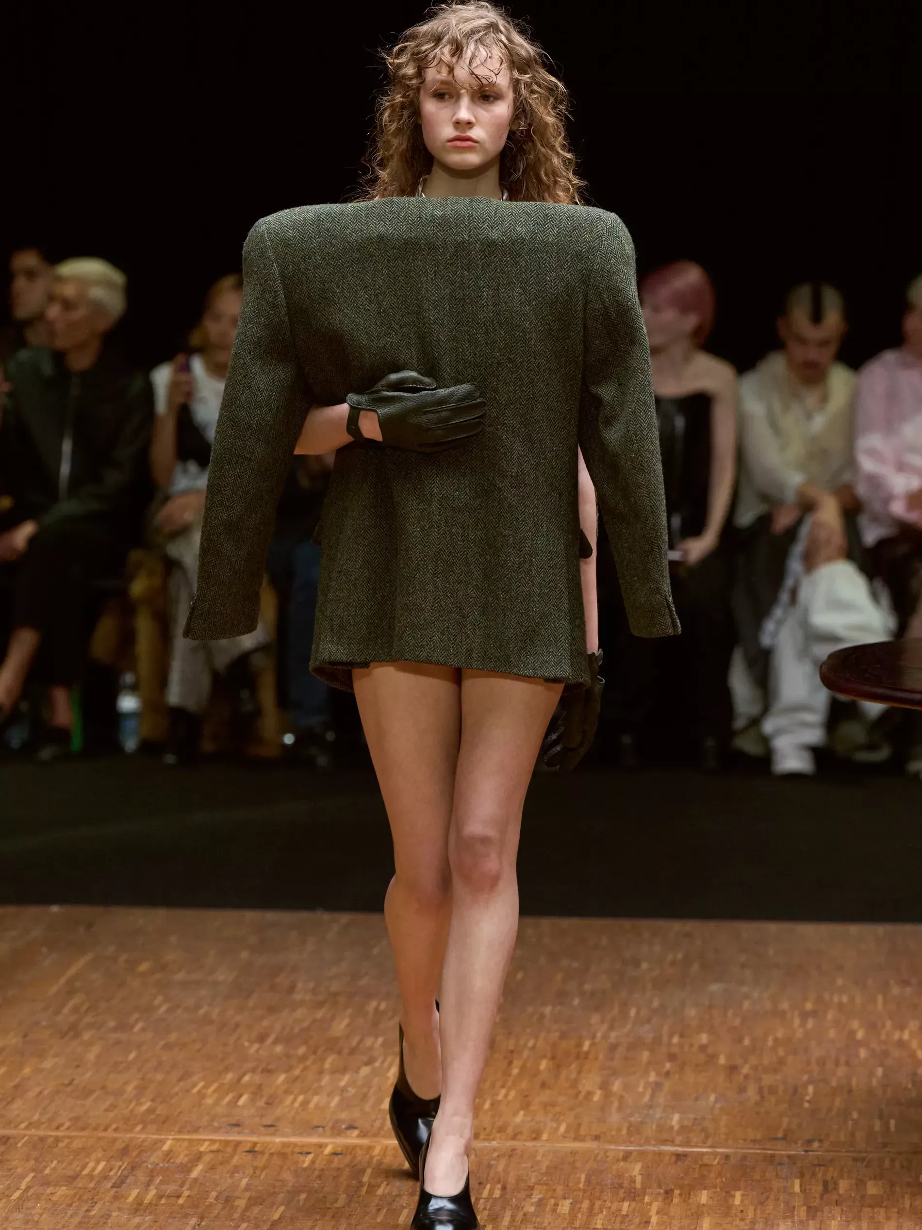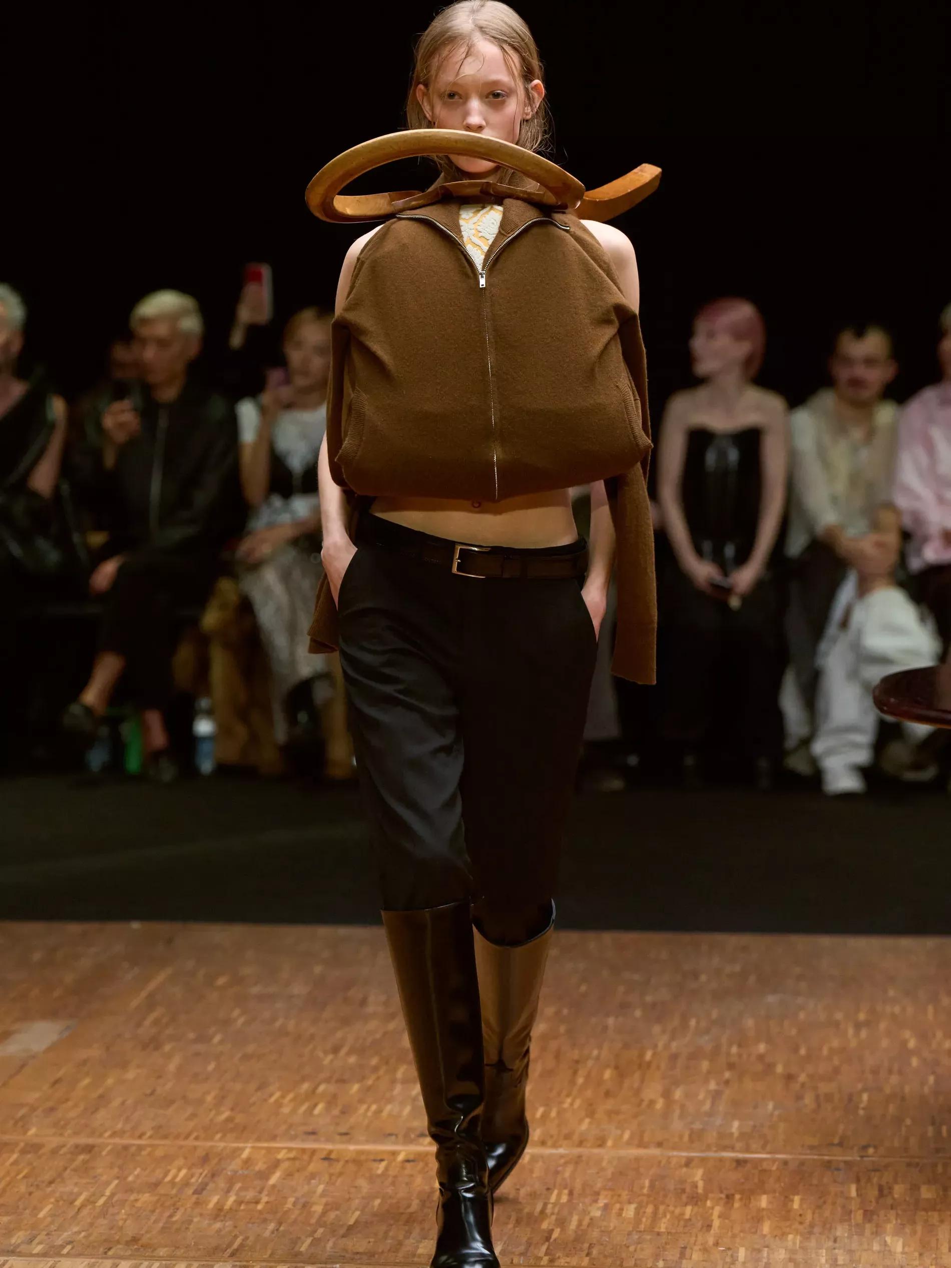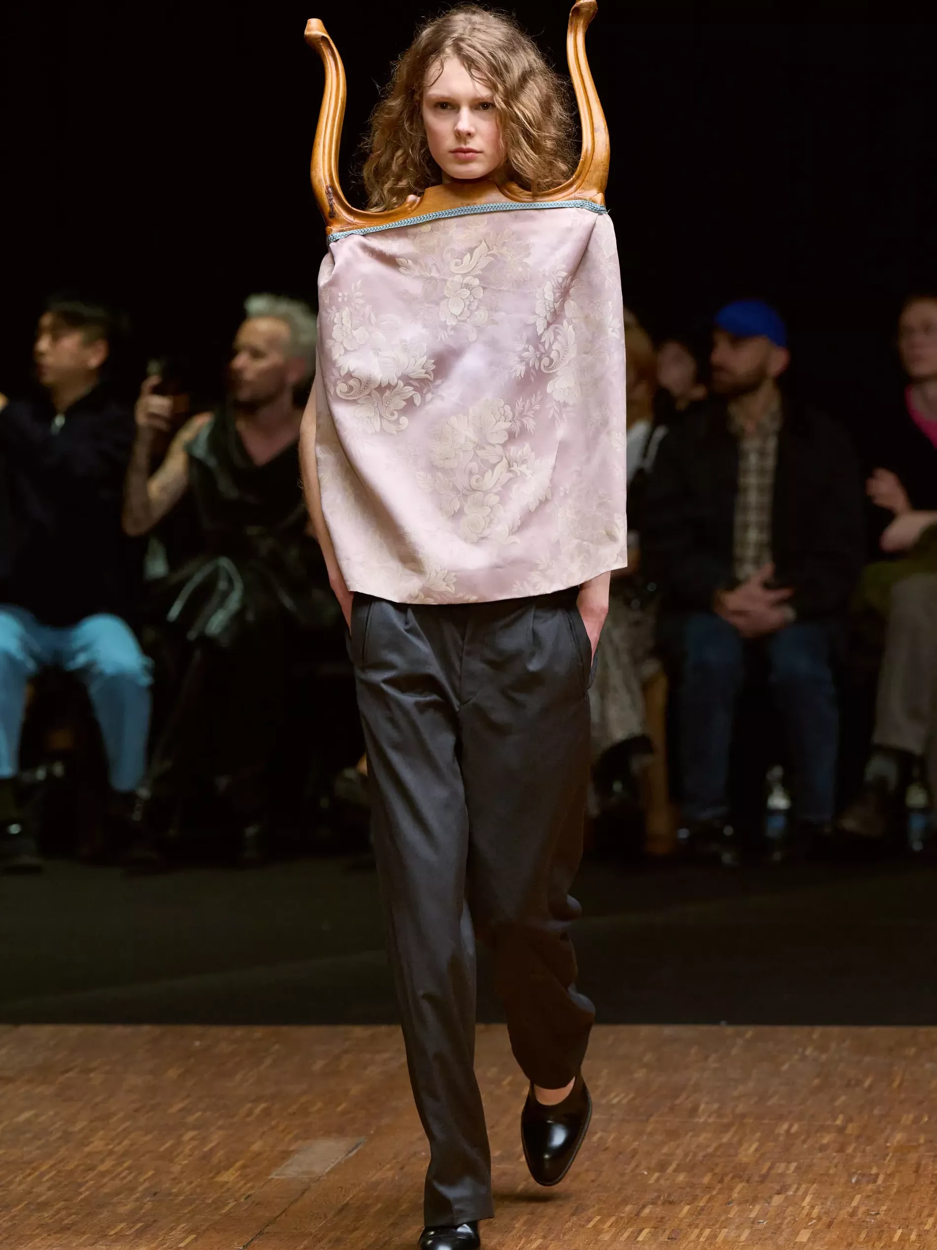 The first half of the collection, which included a collaboration with Harris tweeds, was narrow and pared back. (Now there is a “school of Hodakova,” with many designers following her lead, that neatness and tightness was a kind of reframing of her work.) Things got more conceptual, and less viable as ready-to-wear as the show progressed (would you want to be the person sitting behind a chair top at a show?) Most provocative were the hunchbacked forms that models adopted, clutching their bodies. The idea was that you are dancing with yourself – or selves.