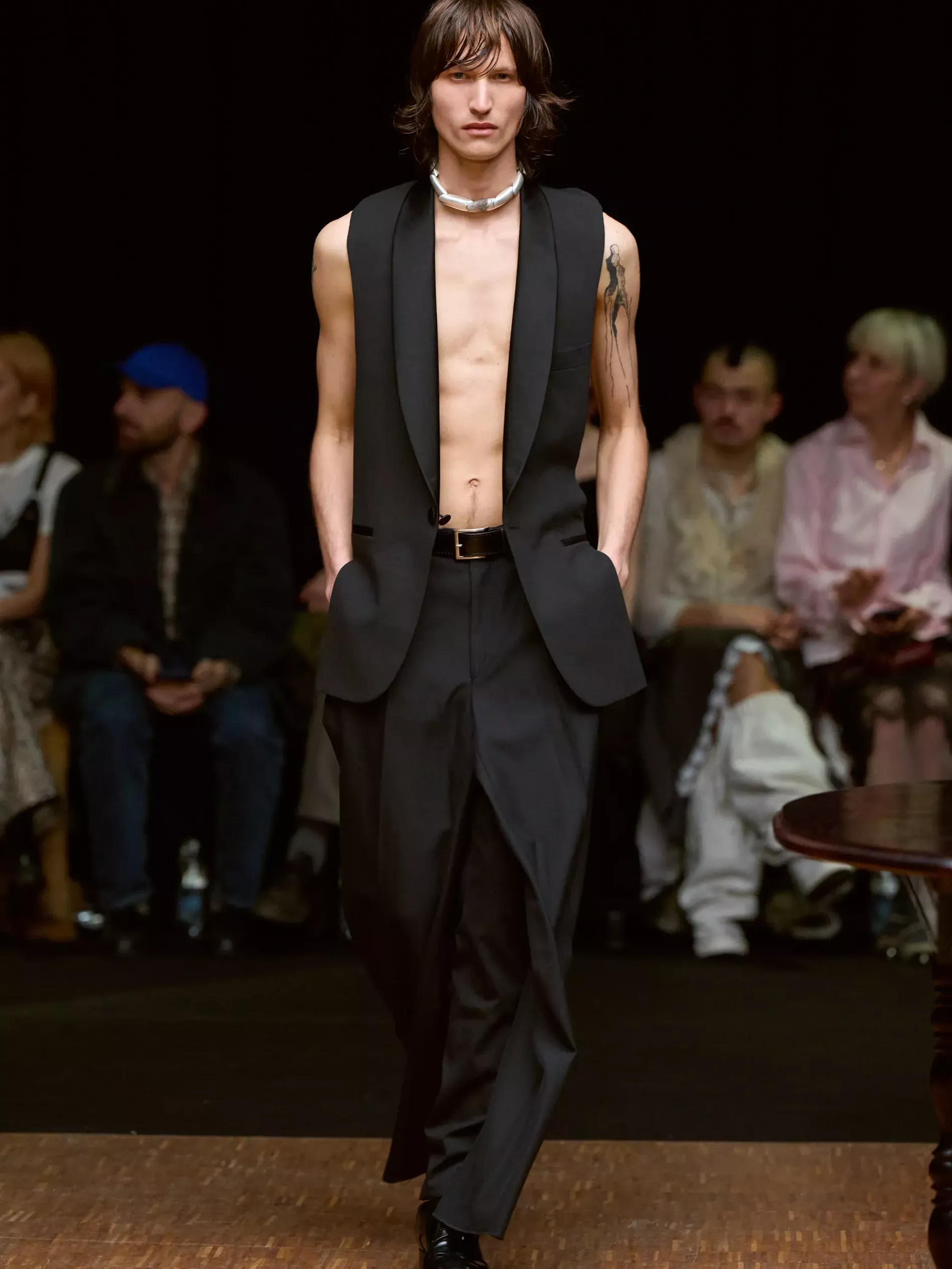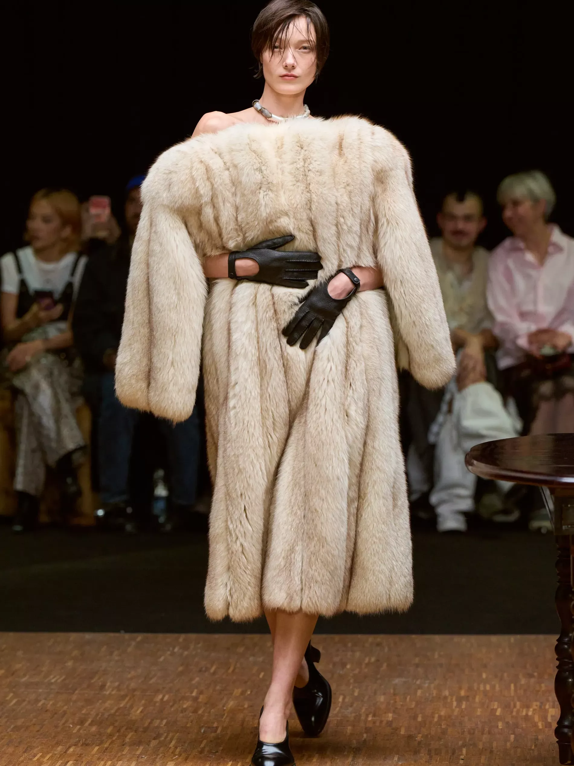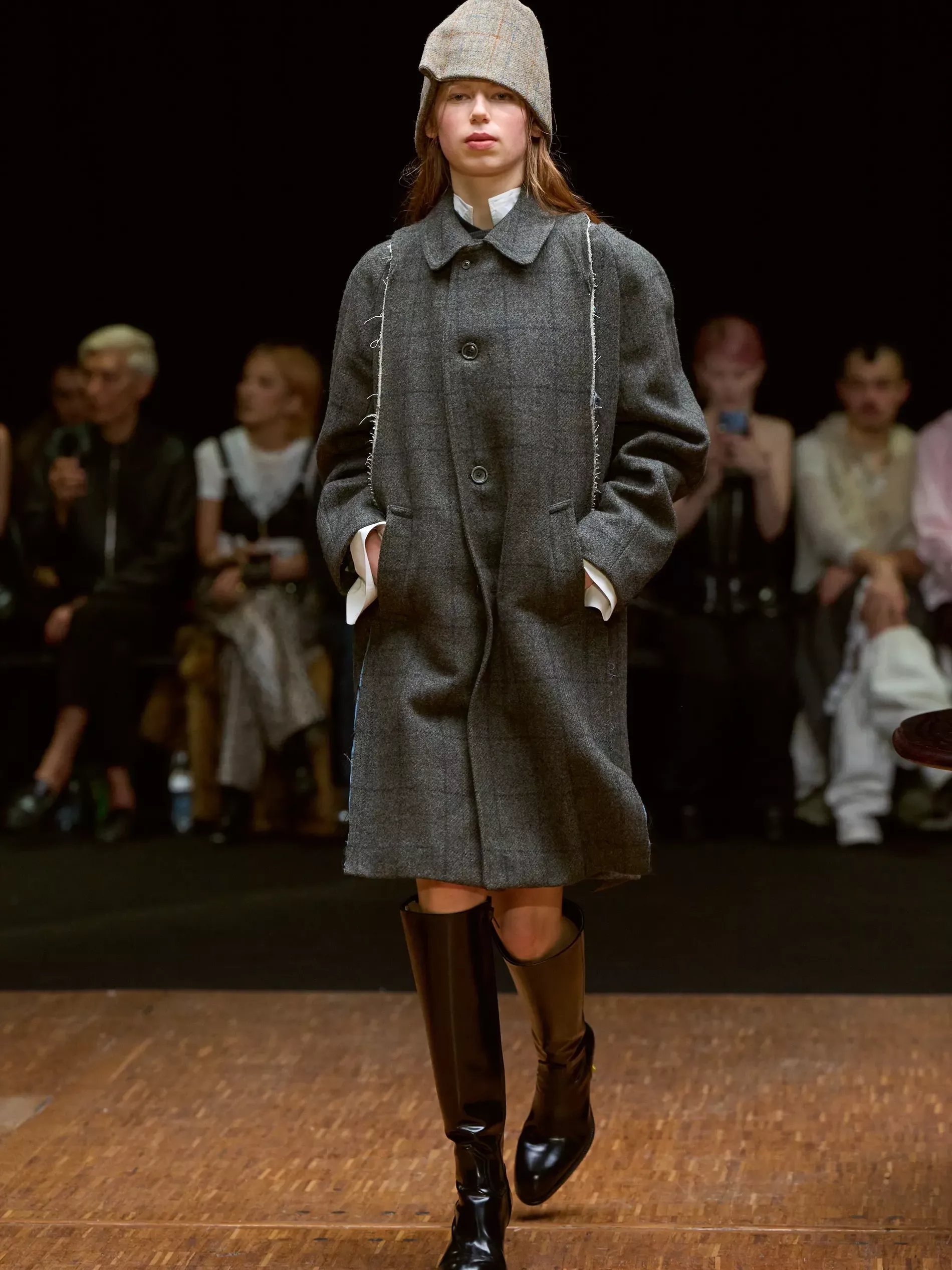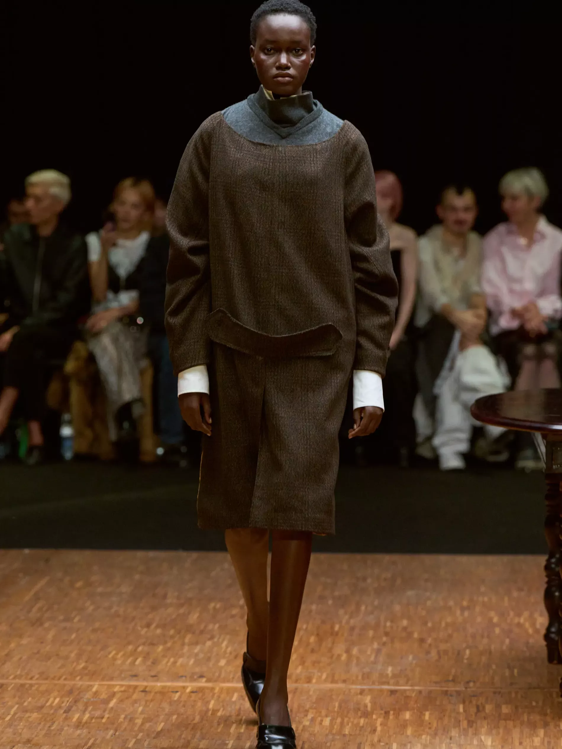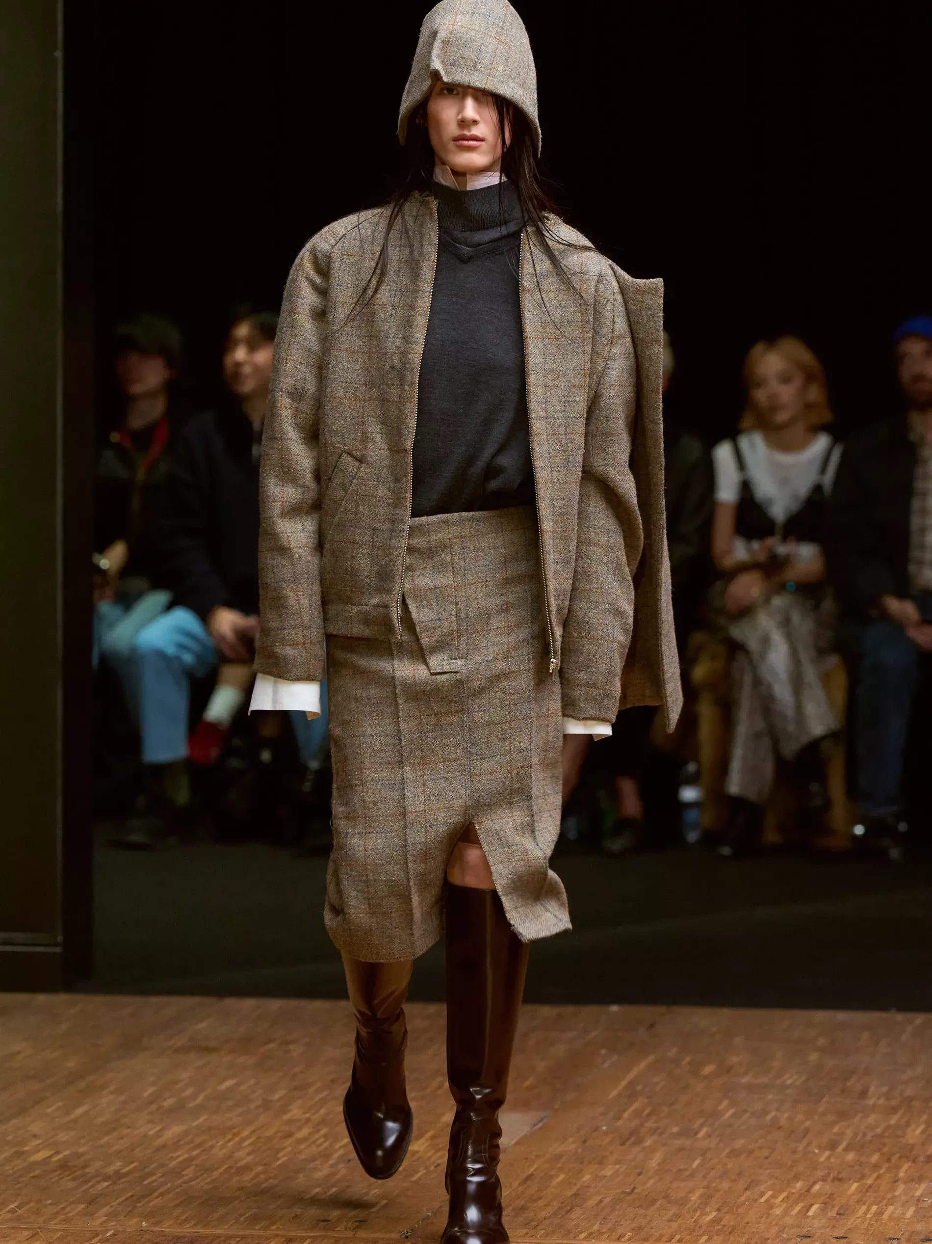 The first half of the collection, which included a collaboration with Harris tweeds, was narrow and pared back. (Now there is a “school of Hodakova,” with many designers following her lead, that neatness and tightness was a kind of reframing of her work.) Things got more conceptual, and less viable as ready-to-wear as the show progressed (would you want to be the person sitting behind a chair top at a show?) Most provocative were the hunchbacked forms that models adopted, clutching their bodies. The idea was that you are dancing with yourself – or selves.