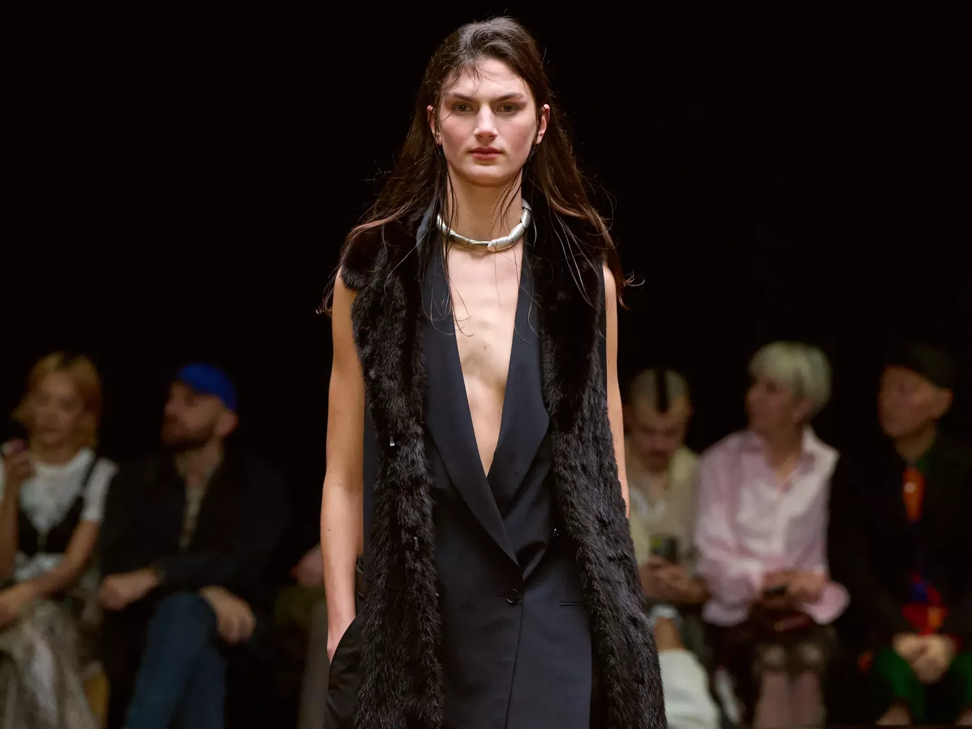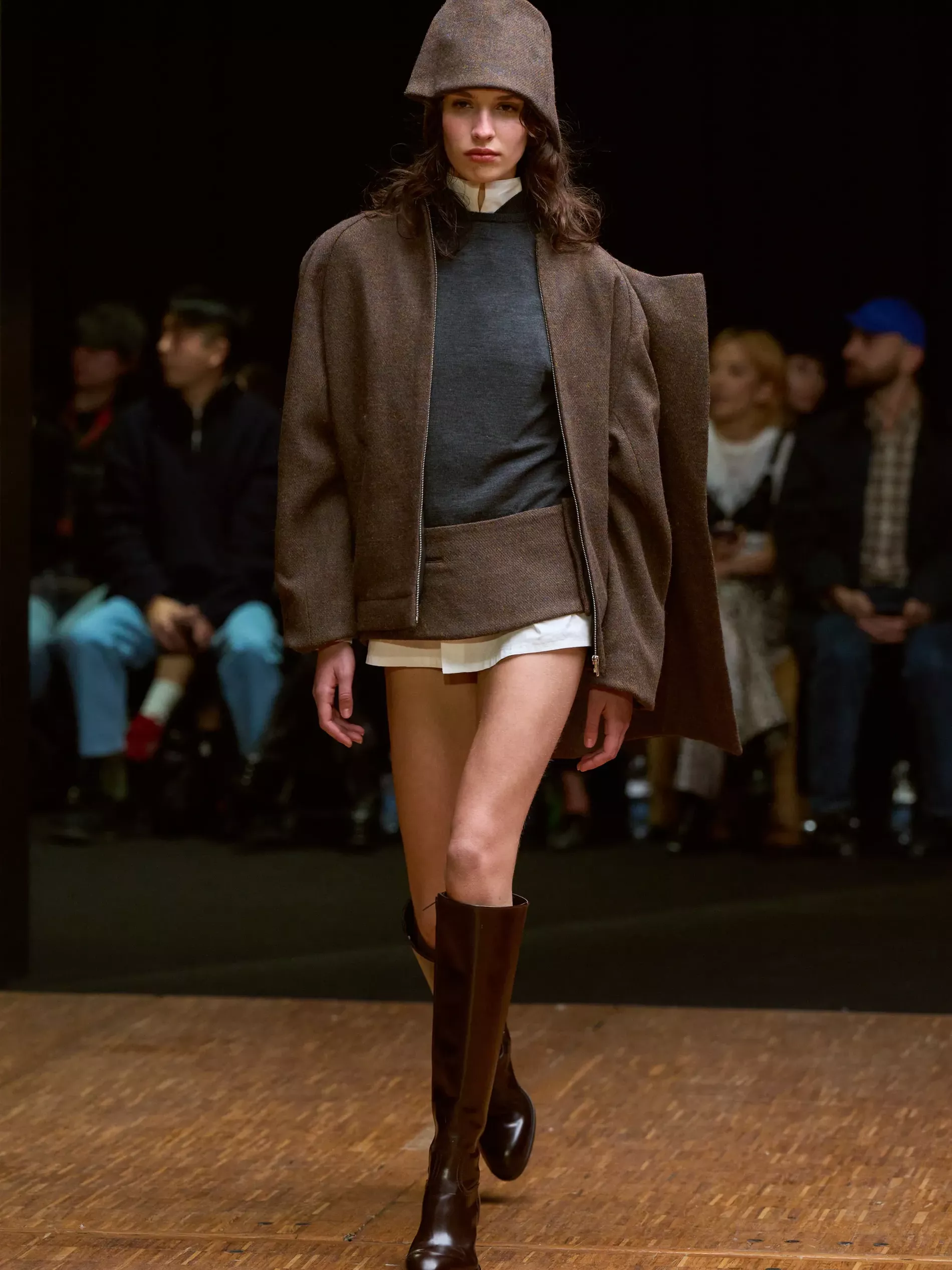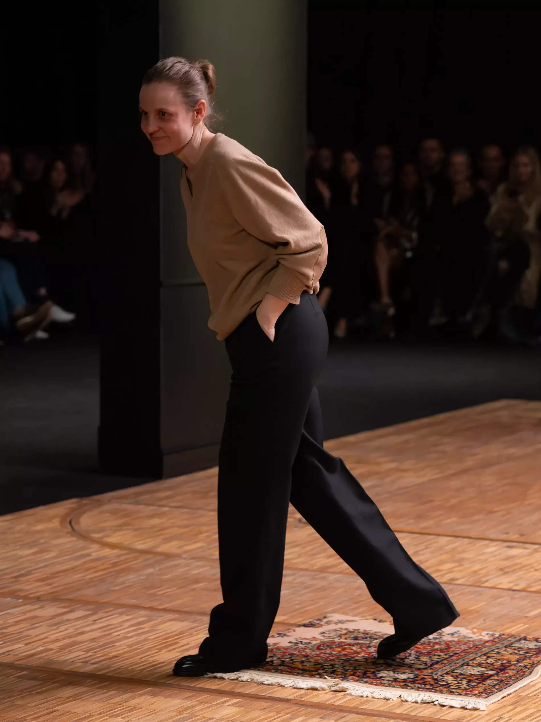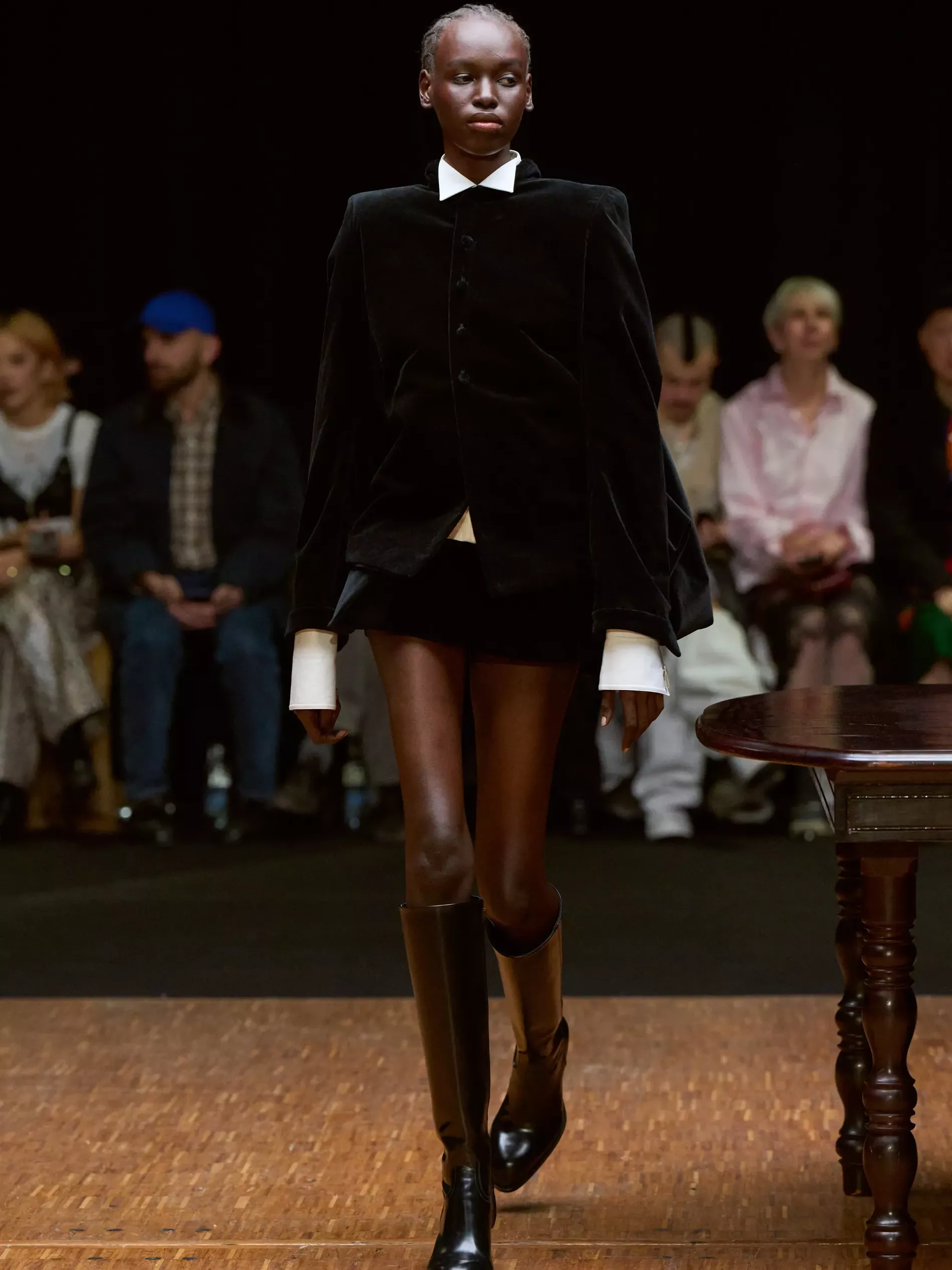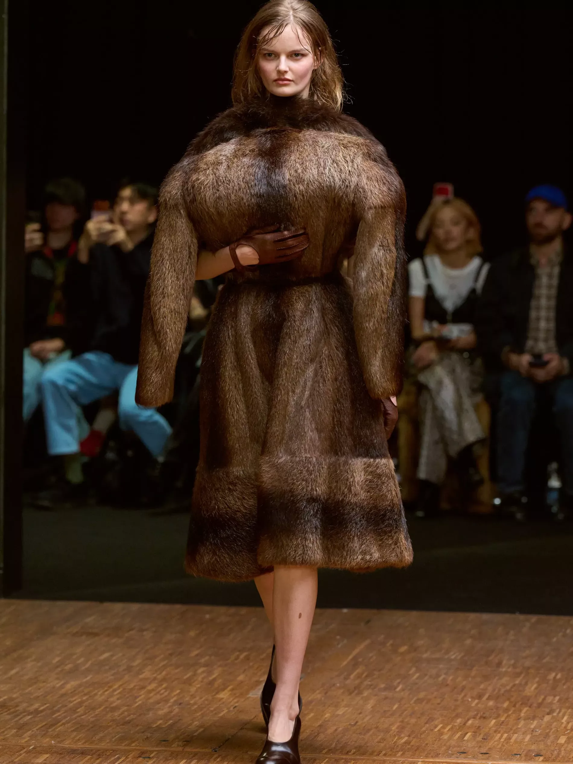 The first half of the collection, which included a collaboration with Harris tweeds, was narrow and pared back. (Now there is a “school of Hodakova,” with many designers following her lead, that neatness and tightness was a kind of reframing of her work.) Things got more conceptual, and less viable as ready-to-wear as the show progressed (would you want to be the person sitting behind a chair top at a show?) Most provocative were the hunchbacked forms that models adopted, clutching their bodies. The idea was that you are dancing with yourself – or selves.