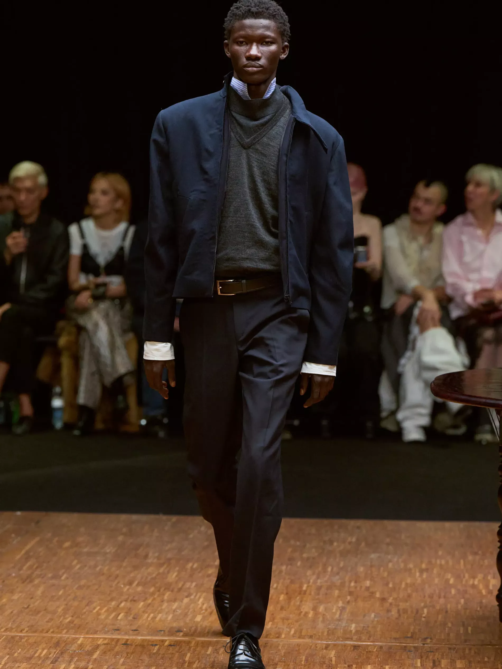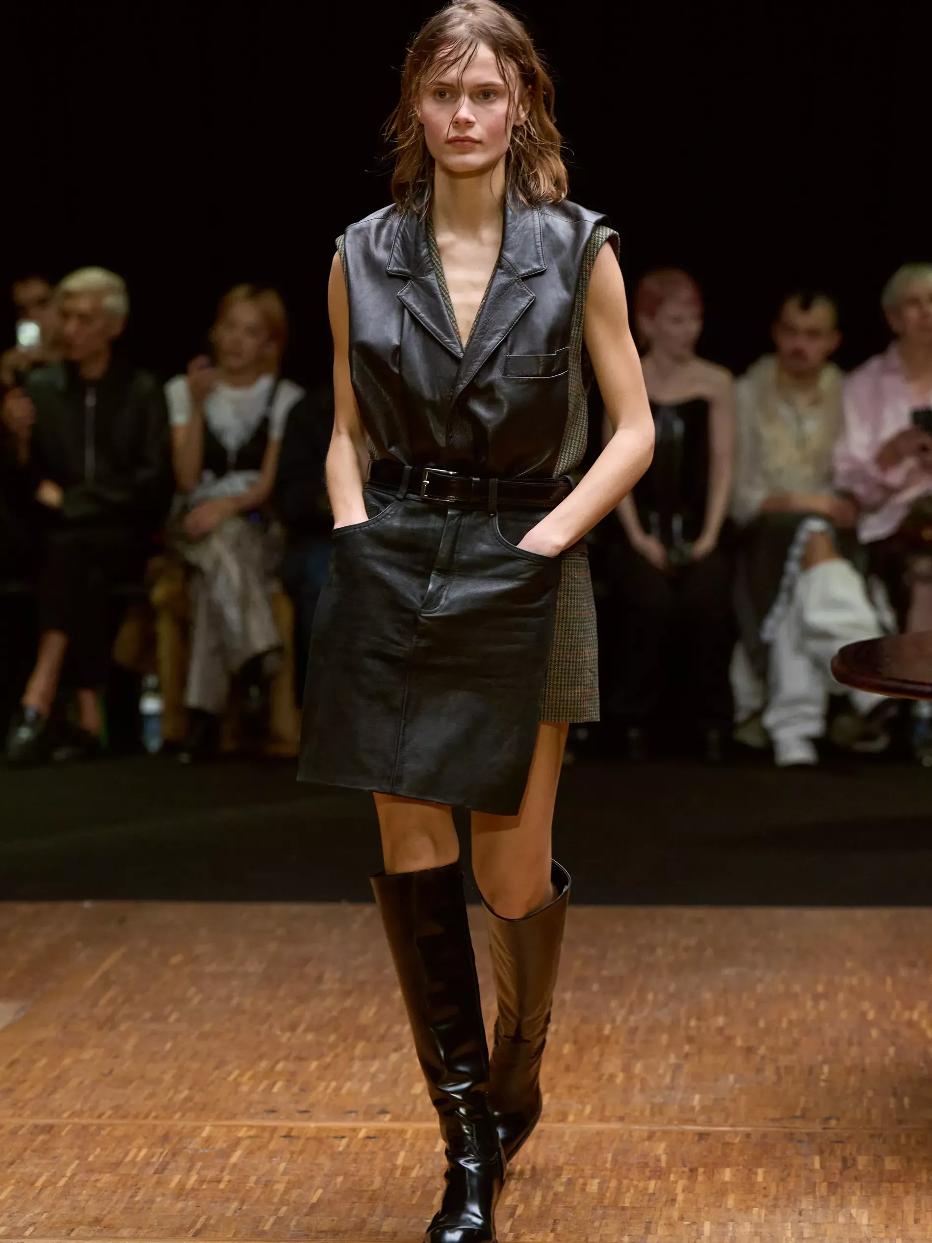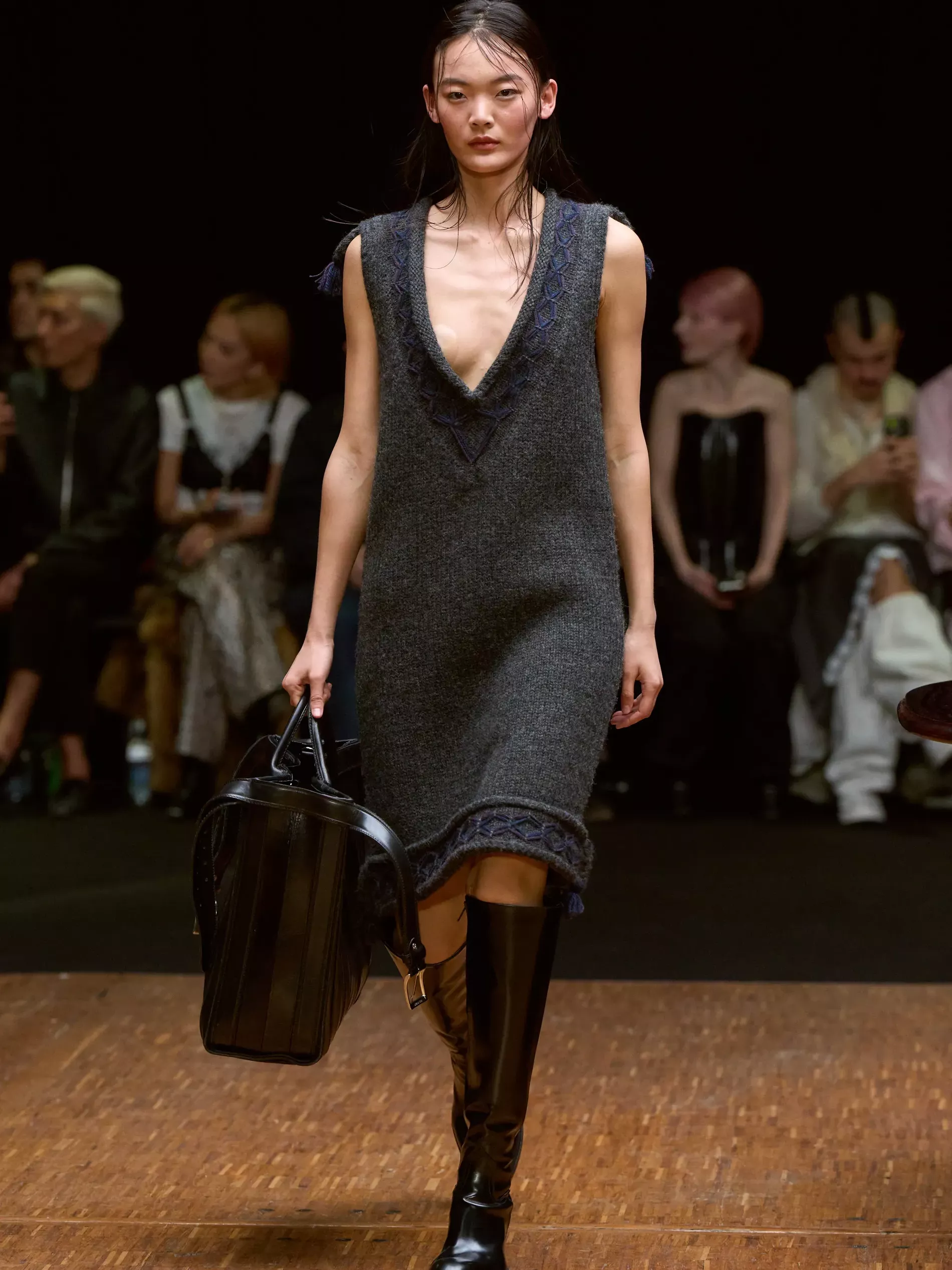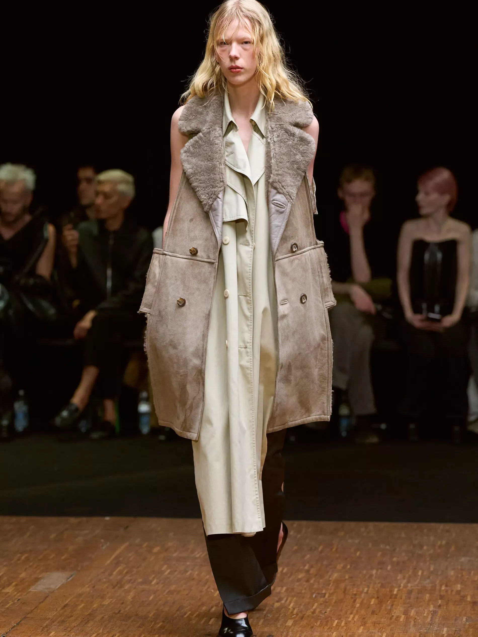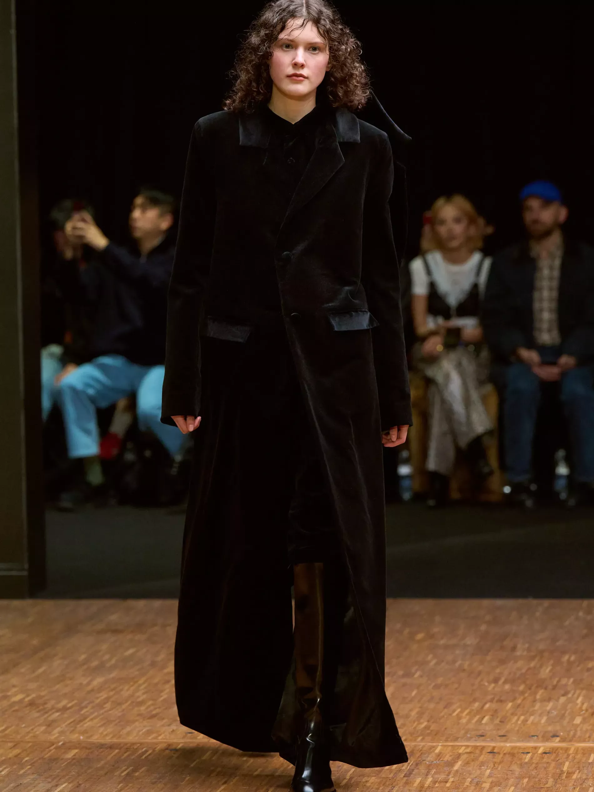 The first half of the collection, which included a collaboration with Harris tweeds, was narrow and pared back. (Now there is a “school of Hodakova,” with many designers following her lead, that neatness and tightness was a kind of reframing of her work.) Things got more conceptual, and less viable as ready-to-wear as the show progressed (would you want to be the person sitting behind a chair top at a show?) Most provocative were the hunchbacked forms that models adopted, clutching their bodies. The idea was that you are dancing with yourself – or selves.