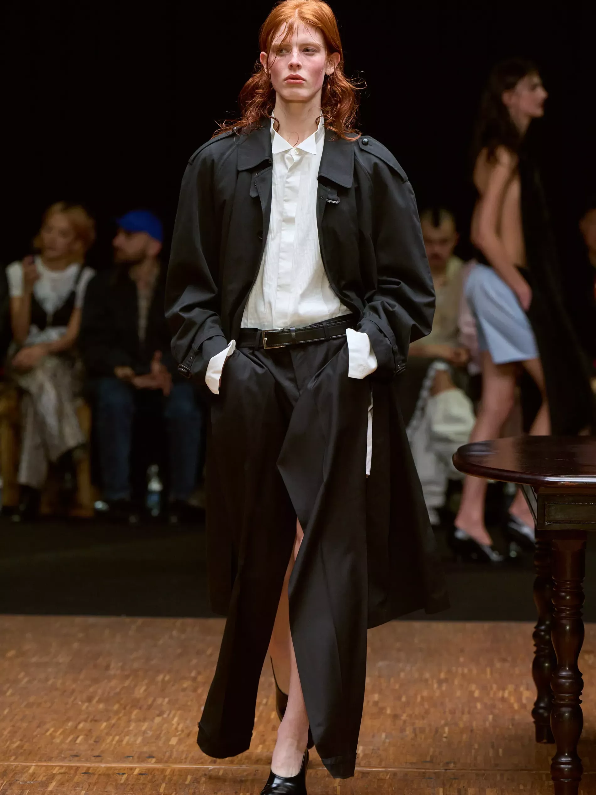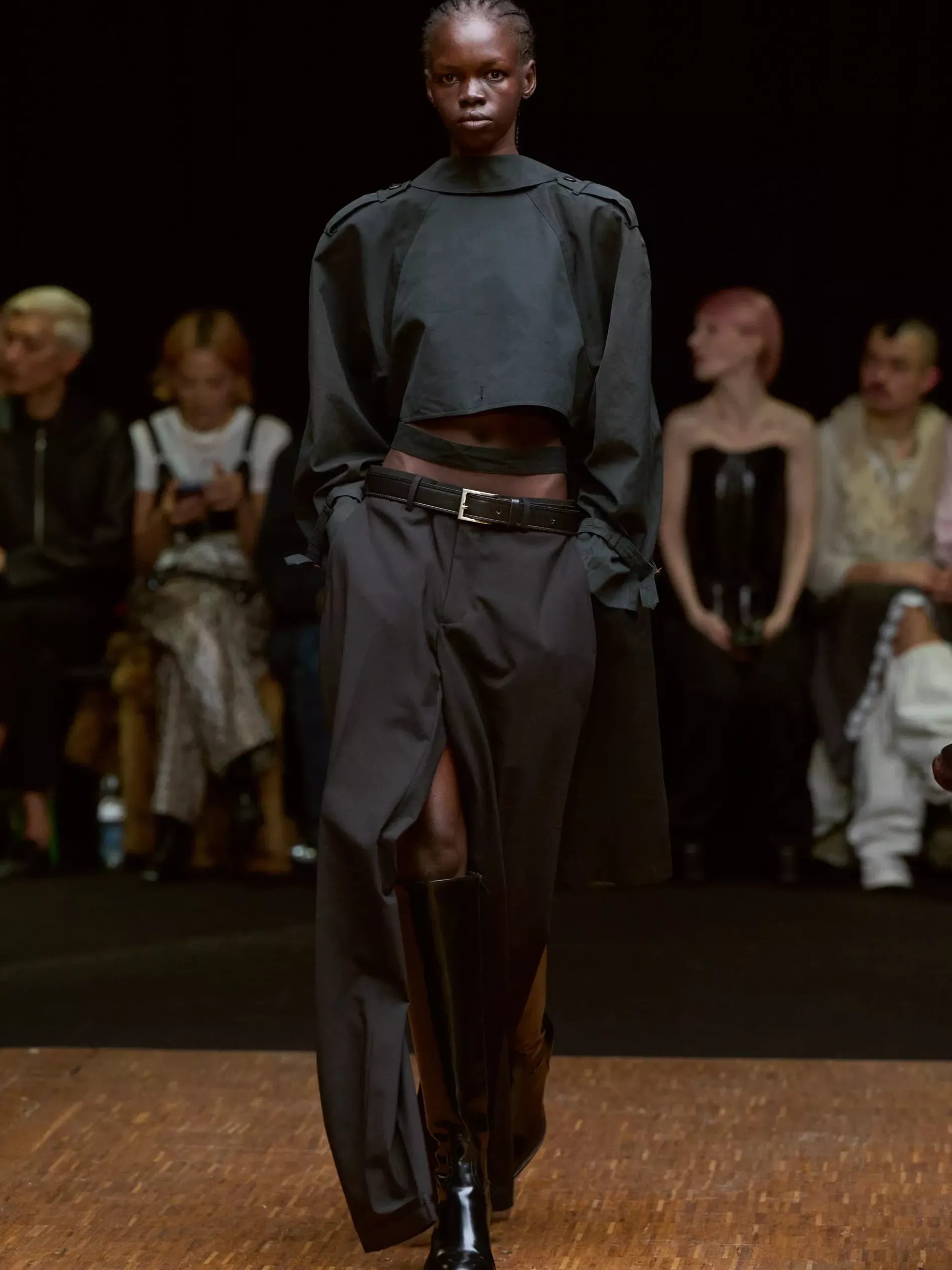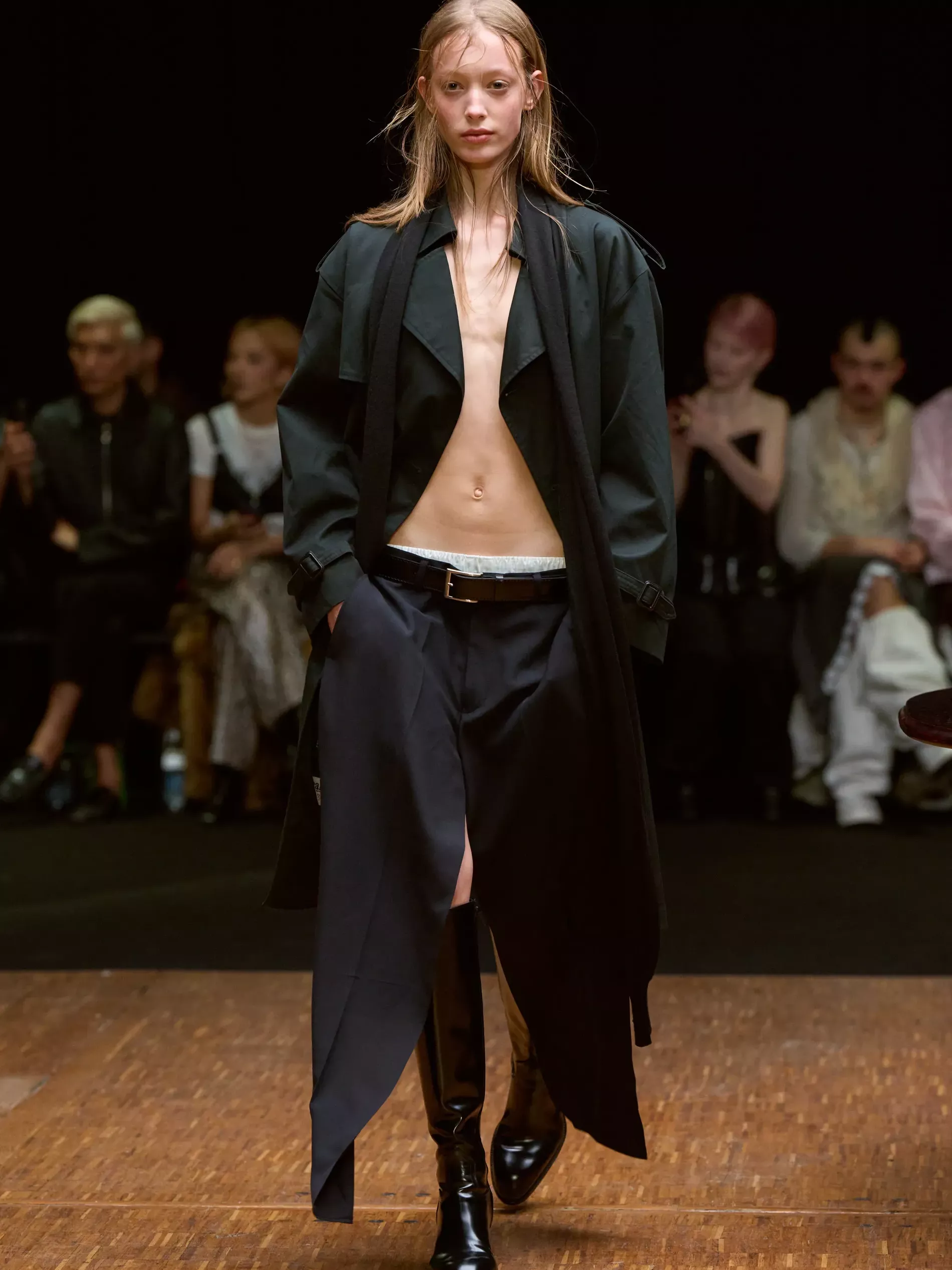 Think decon can’t be sexy? Think again. This was Ellen Hodakova Larsson’s most revealing show, both in terms of skin and self. She described the opening looks as being apron-like: backless coats and pants revealed boxers. At the same time that she is showing more skin, the designer said she’s “moving things inwards a little bit more and [the work] becomes my autobiography in a way.”