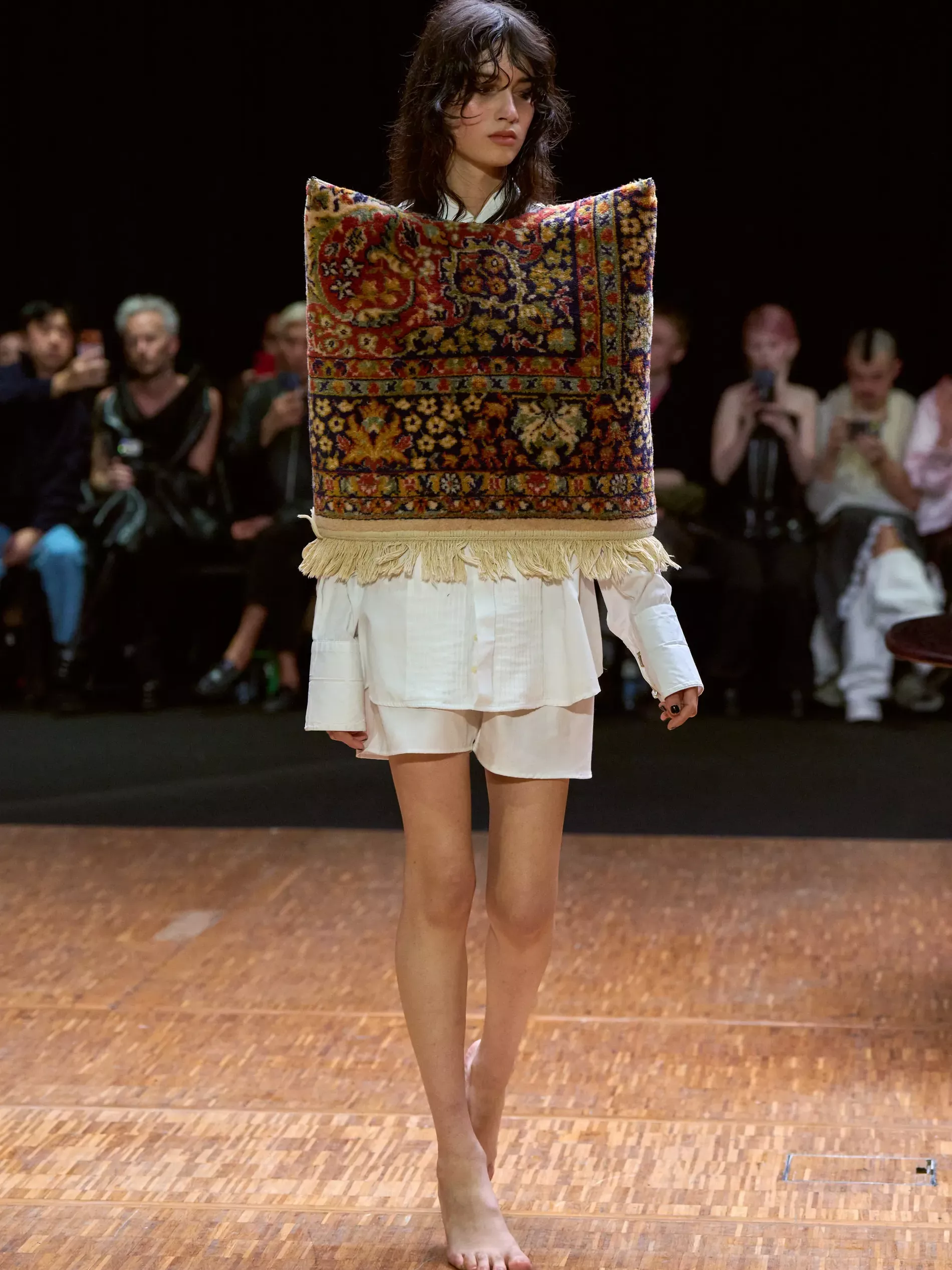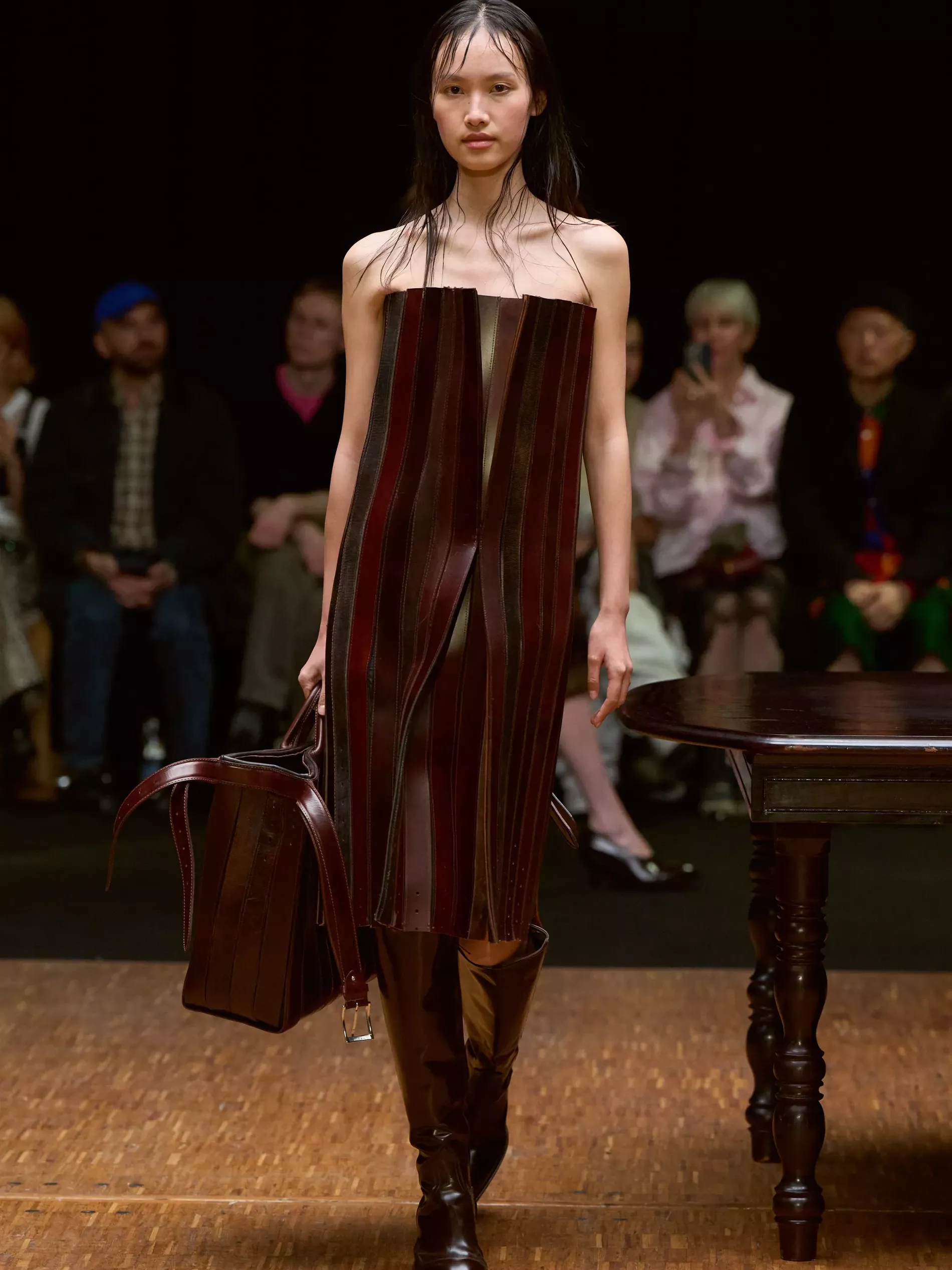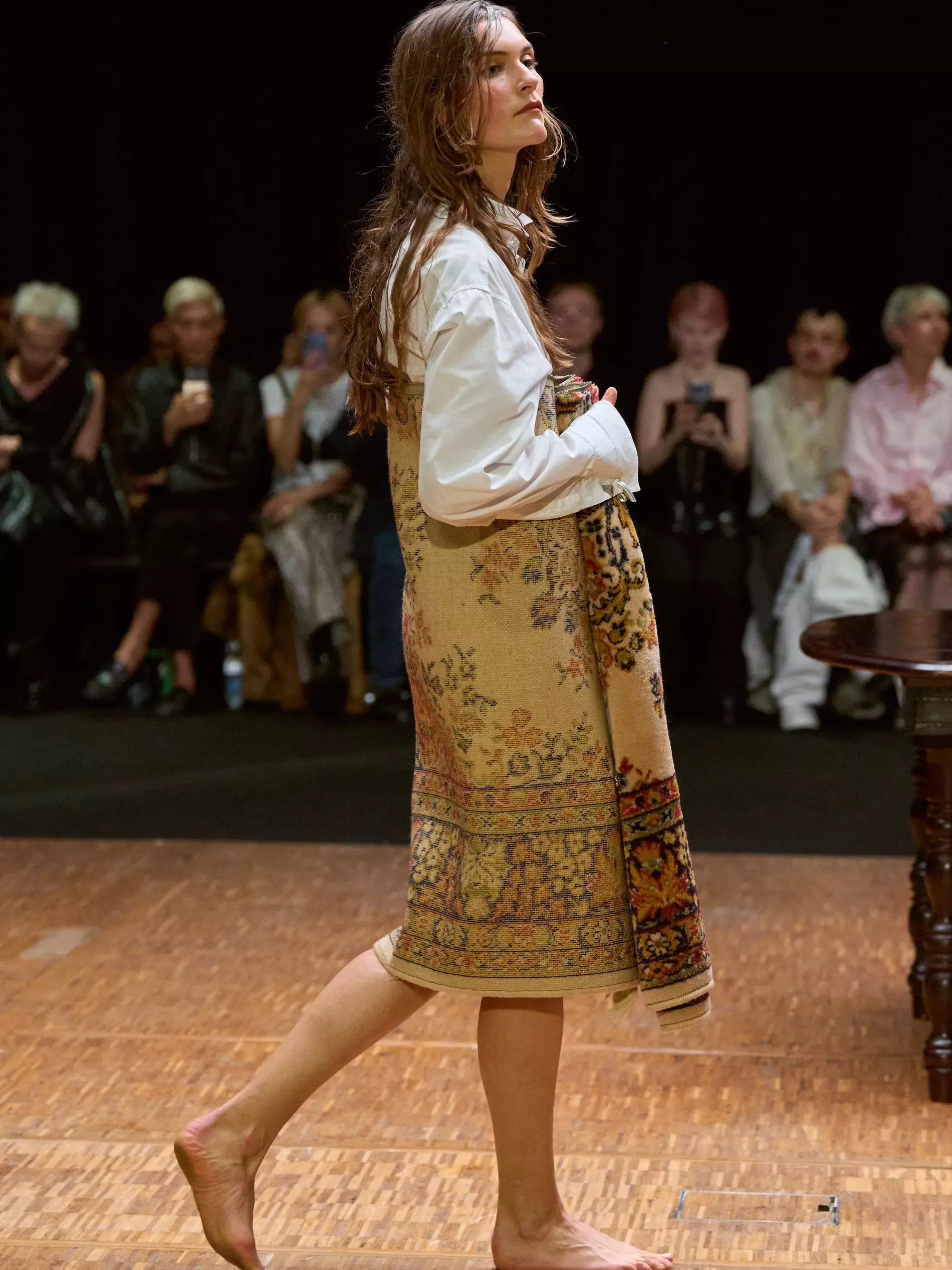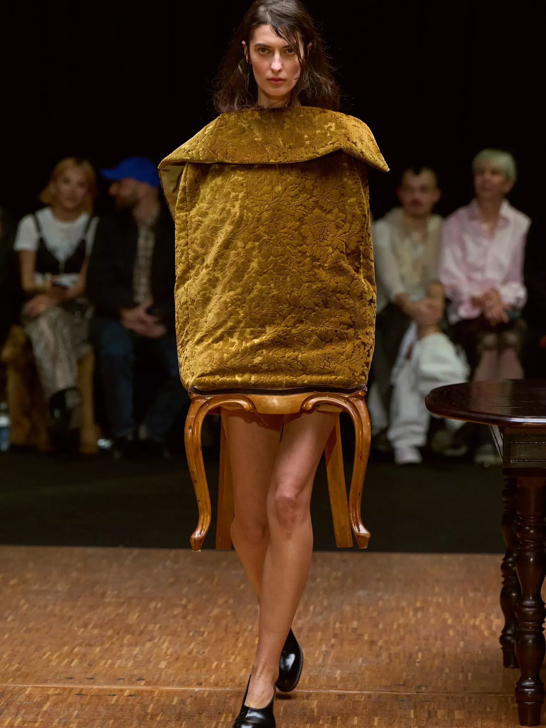 Clothes are one way we reveal ourselves, interior decoration is another. Larsson was thinking of various states of being (social, inner, true selves) and the idea of home. (A building houses a person; clothes are a home for the body; and the body is where the self dwells.) A horsewoman who was raised on a farm, Larsson is deeply tied to the land and a sense of home. She conjured the latter most directly, creating a walled set with models walking by a long dark wood table. There was an itty-bitty bra made of teacups; a rug was crafted into a capelet, and some garments incorporated chair parts.