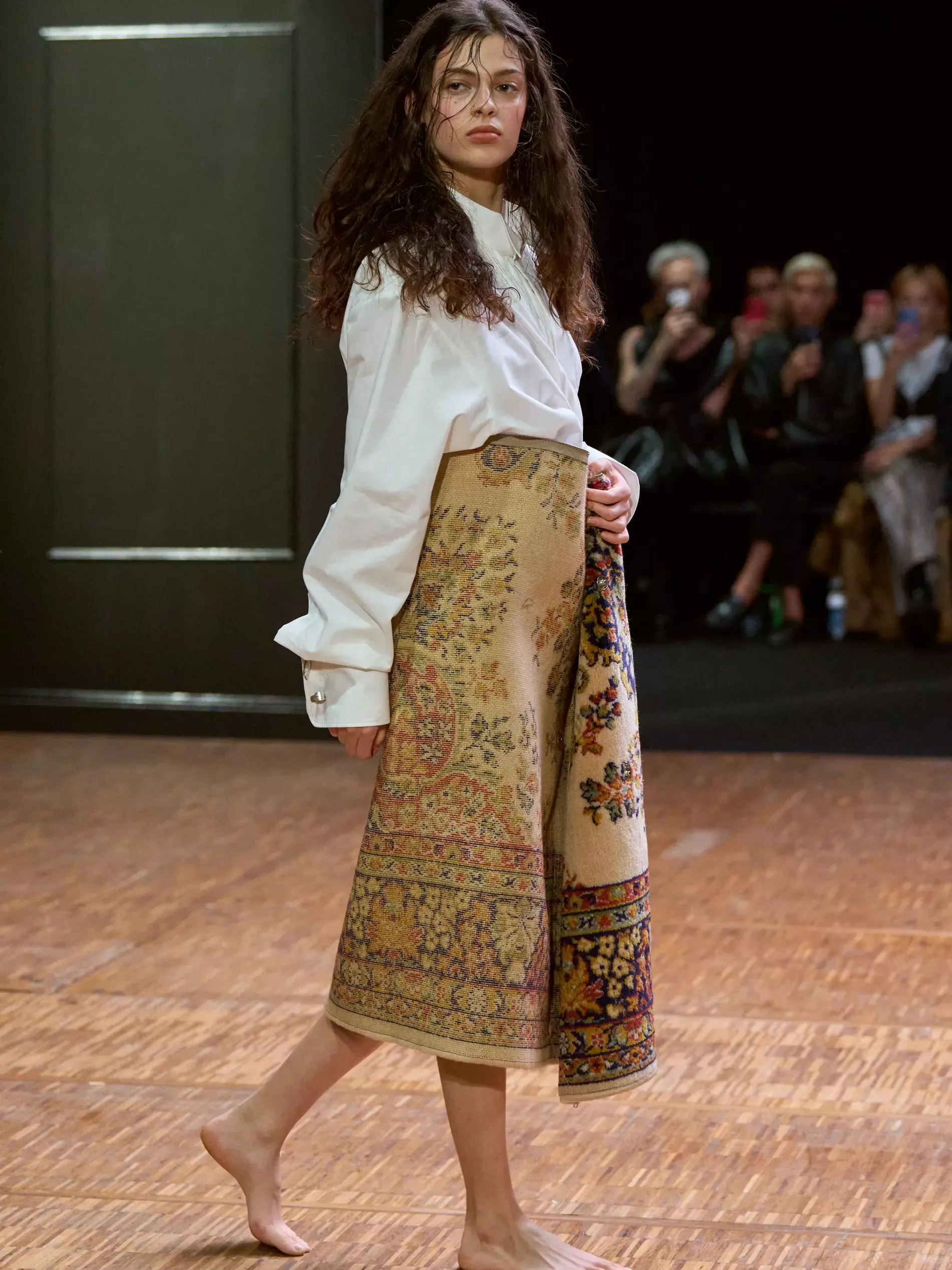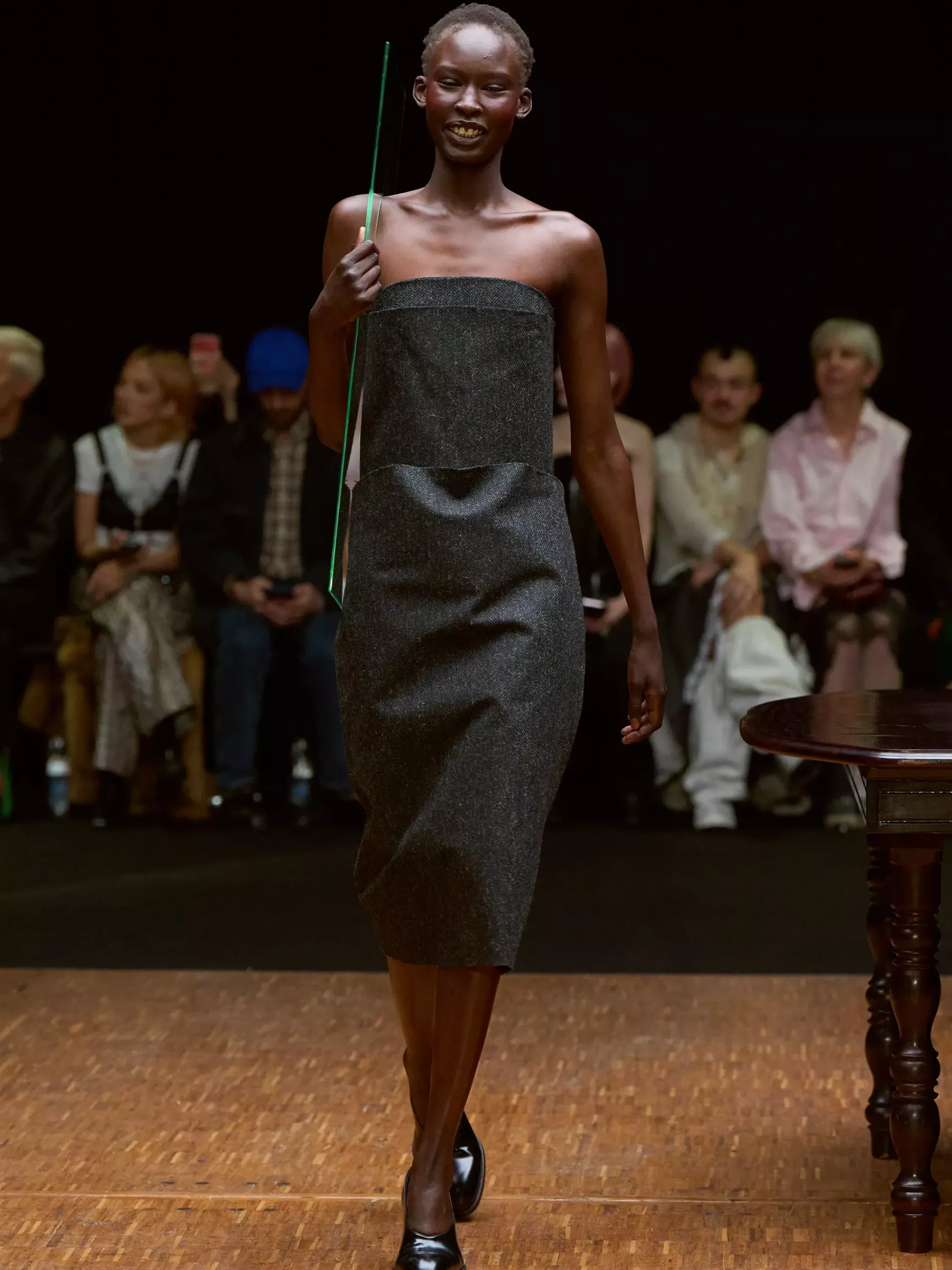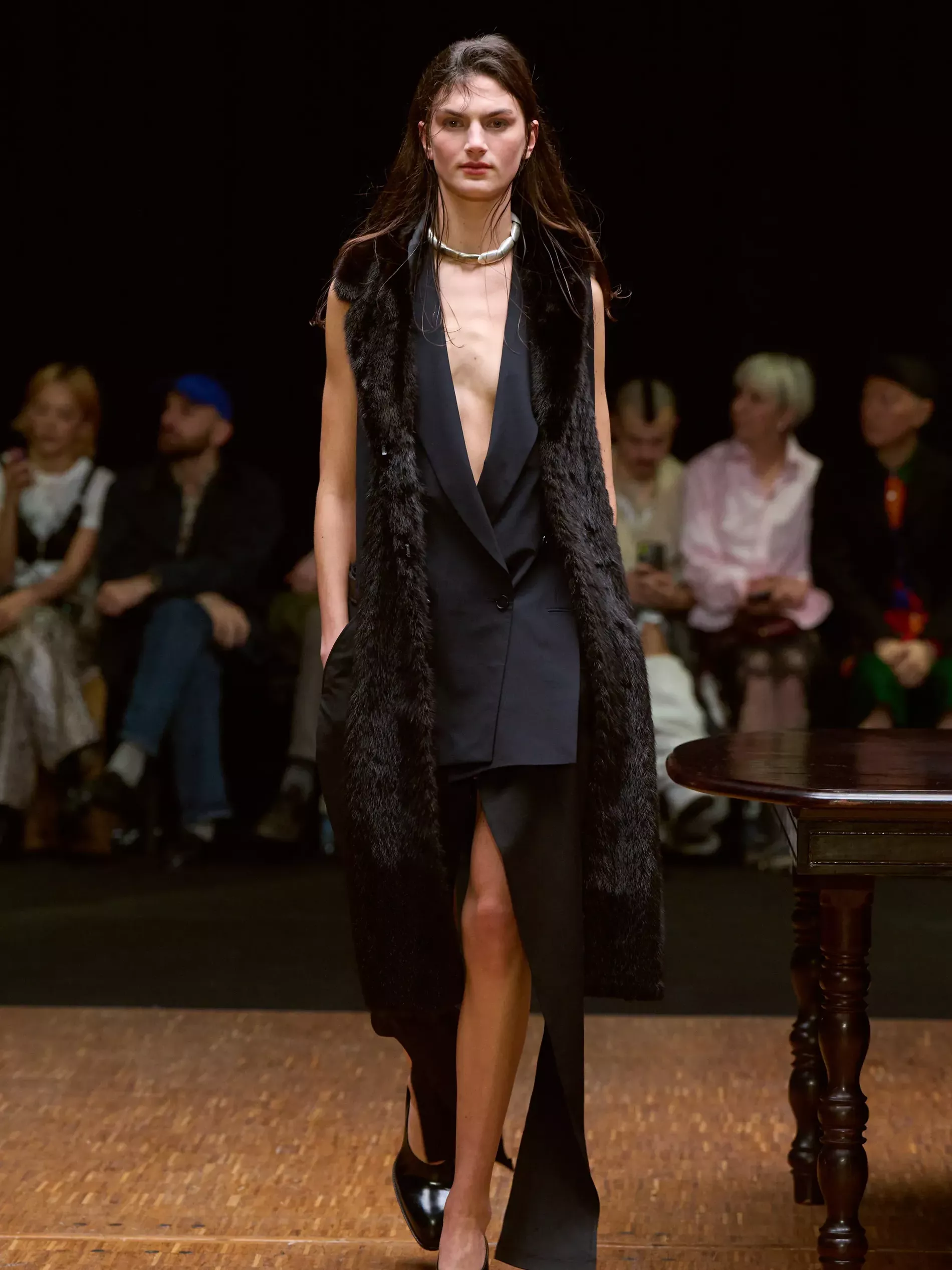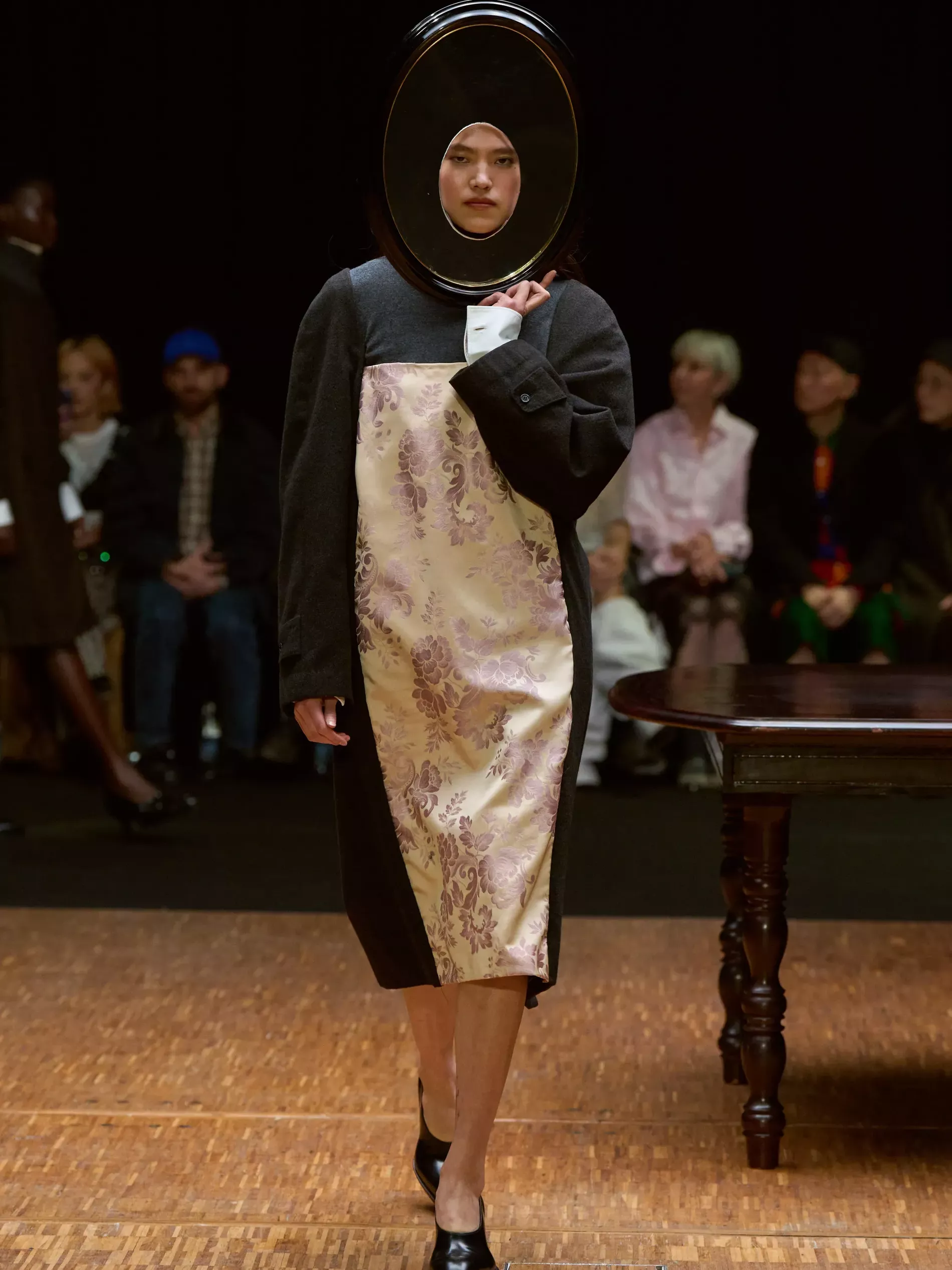 Clothes are one way we reveal ourselves, interior decoration is another. Larsson was thinking of various states of being (social, inner, true selves) and the idea of home. (A building houses a person; clothes are a home for the body; and the body is where the self dwells.) A horsewoman who was raised on a farm, Larsson is deeply tied to the land and a sense of home. She conjured the latter most directly, creating a walled set with models walking by a long dark wood table. There was an itty-bitty bra made of teacups; a rug was crafted into a capelet, and some garments incorporated chair parts.