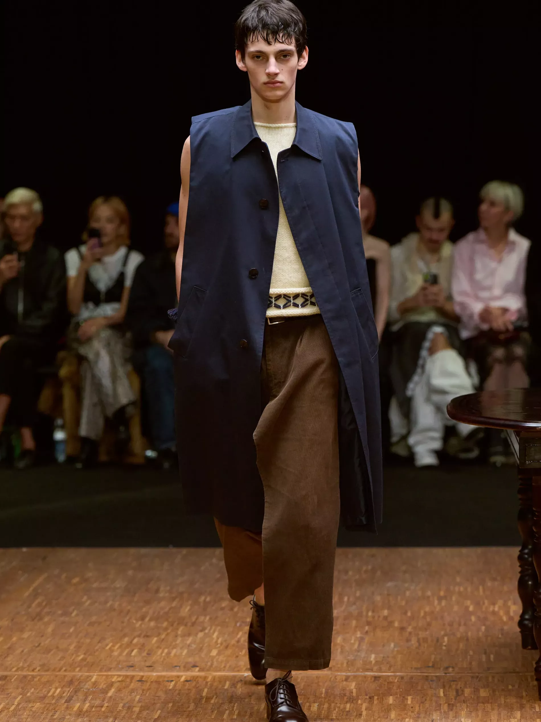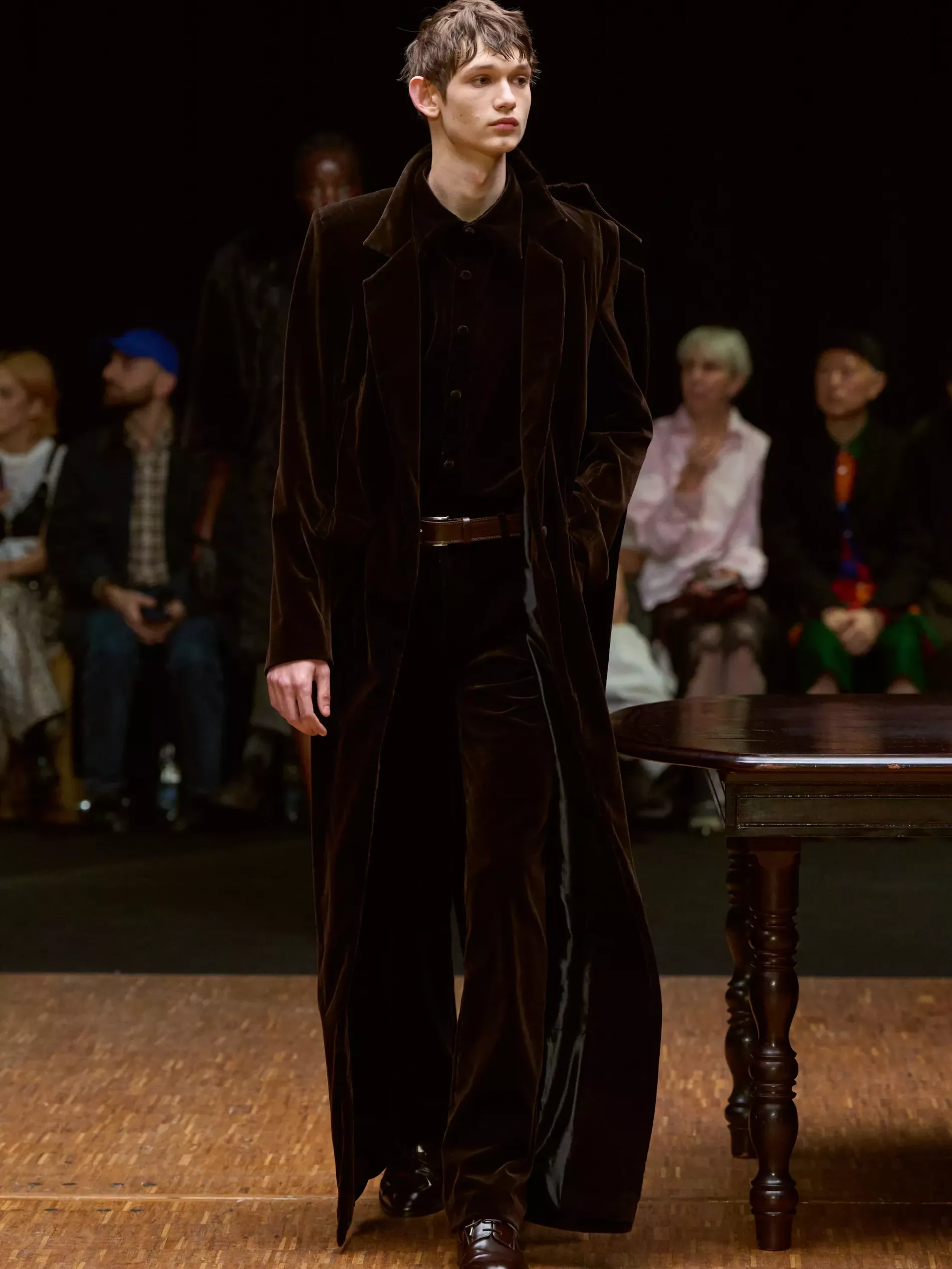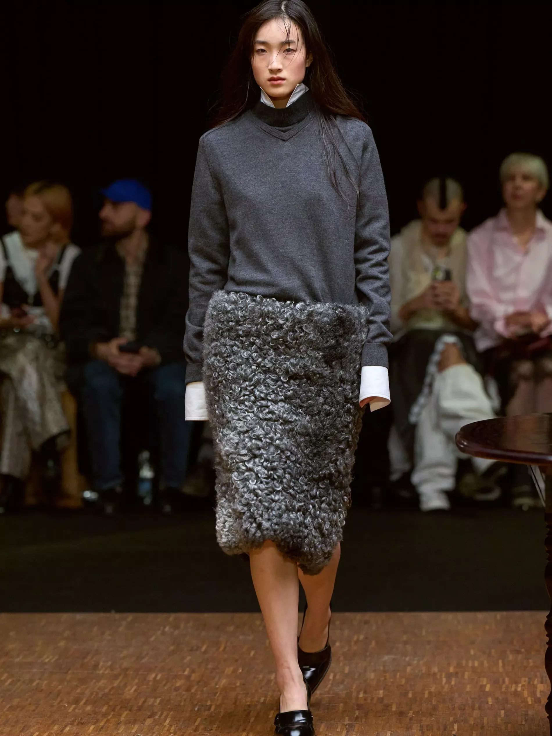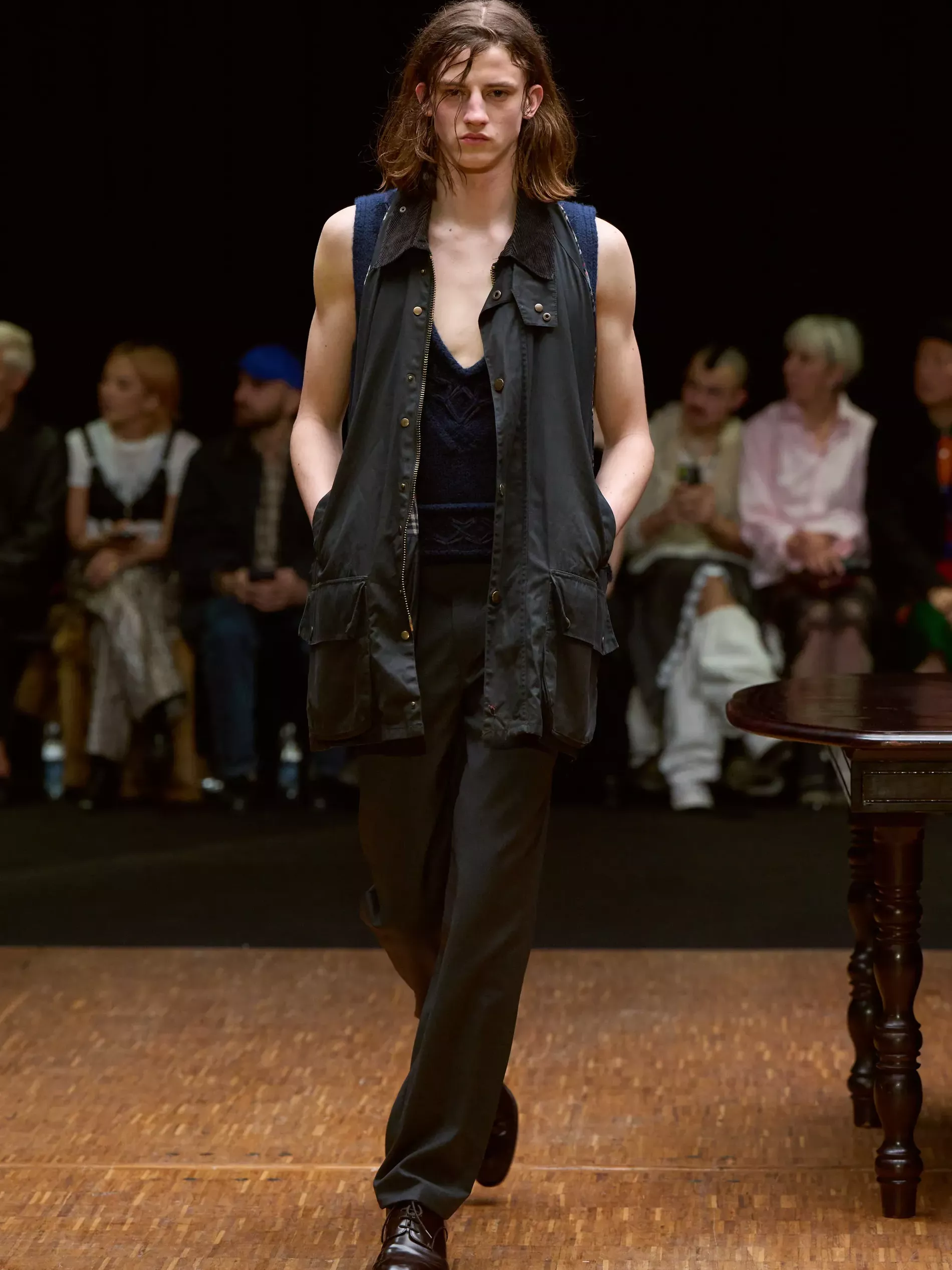 Clothes are one way we reveal ourselves, interior decoration is another. Larsson was thinking of various states of being (social, inner, true selves) and the idea of home. (A building houses a person; clothes are a home for the body; and the body is where the self dwells.) A horsewoman who was raised on a farm, Larsson is deeply tied to the land and a sense of home. She conjured the latter most directly, creating a walled set with models walking by a long dark wood table. There was an itty-bitty bra made of teacups; a rug was crafted into a capelet, and some garments incorporated chair parts.