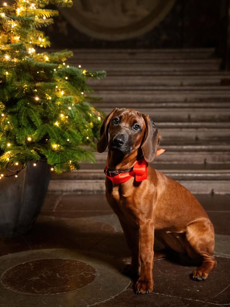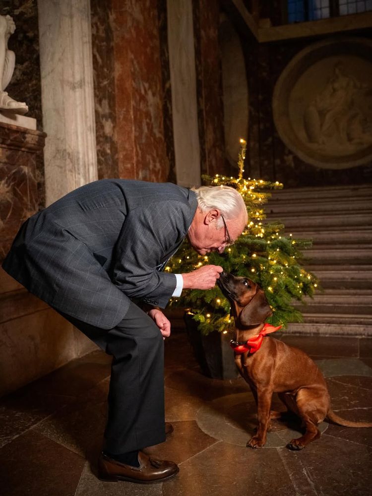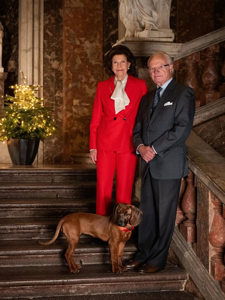 This year's Christmas portrait of the Swedish royal family introduced a delightful new member. Standing on the grand staircase, King Carl XVI Gustaf and Queen Silvia posed alongside Bonnie, their playful new puppy. The adorable pup, sporting a festive red ribbon, appeared ready to add a charming touch of chaos to the palace's holiday celebrations. The King and Queen themselves looked impeccably elegant as always; His Majesty wore a sharply tailored suit, while Her Majesty opted for a sophisticated two-piece ensemble in a rich, seasonal red.