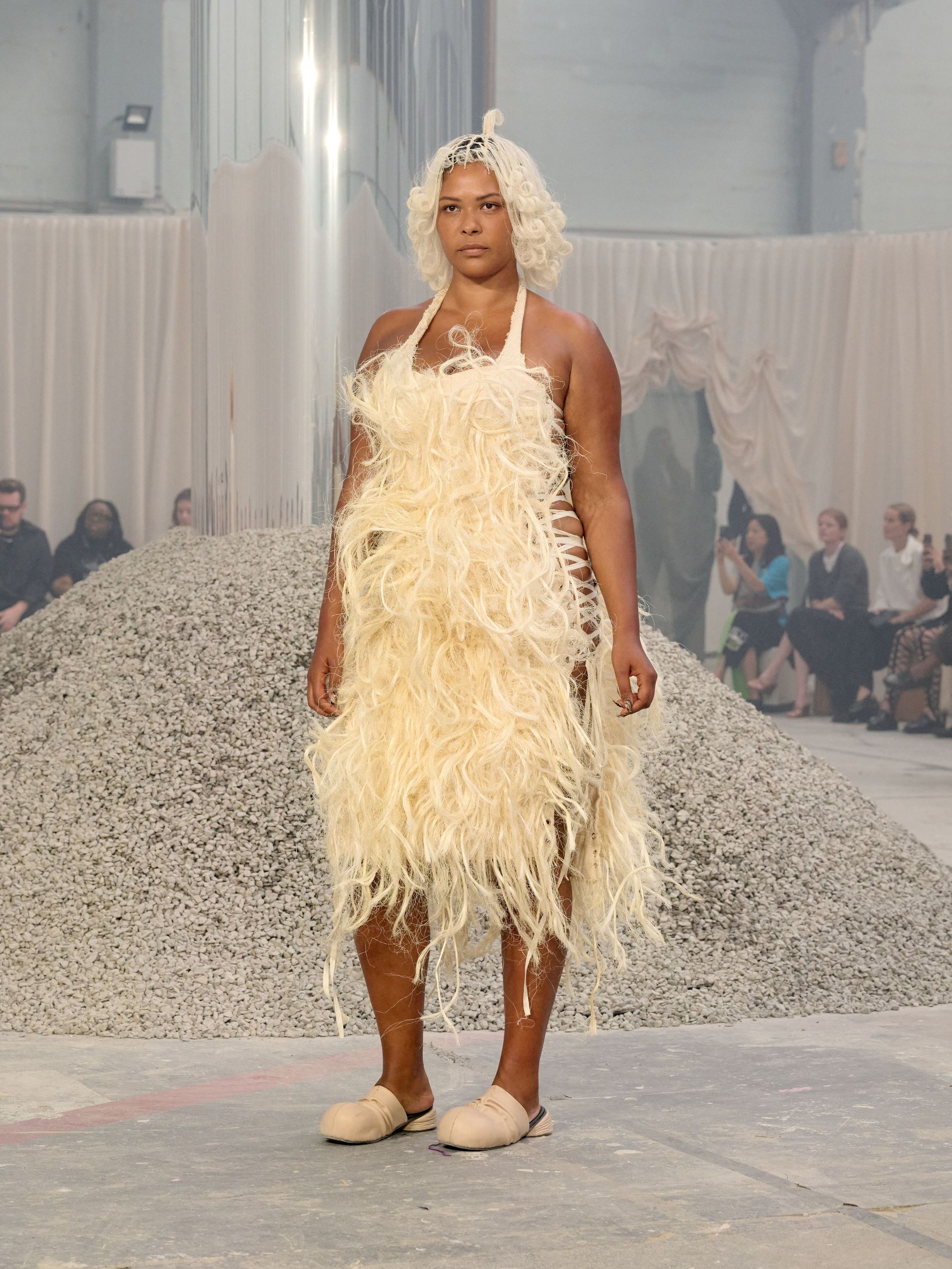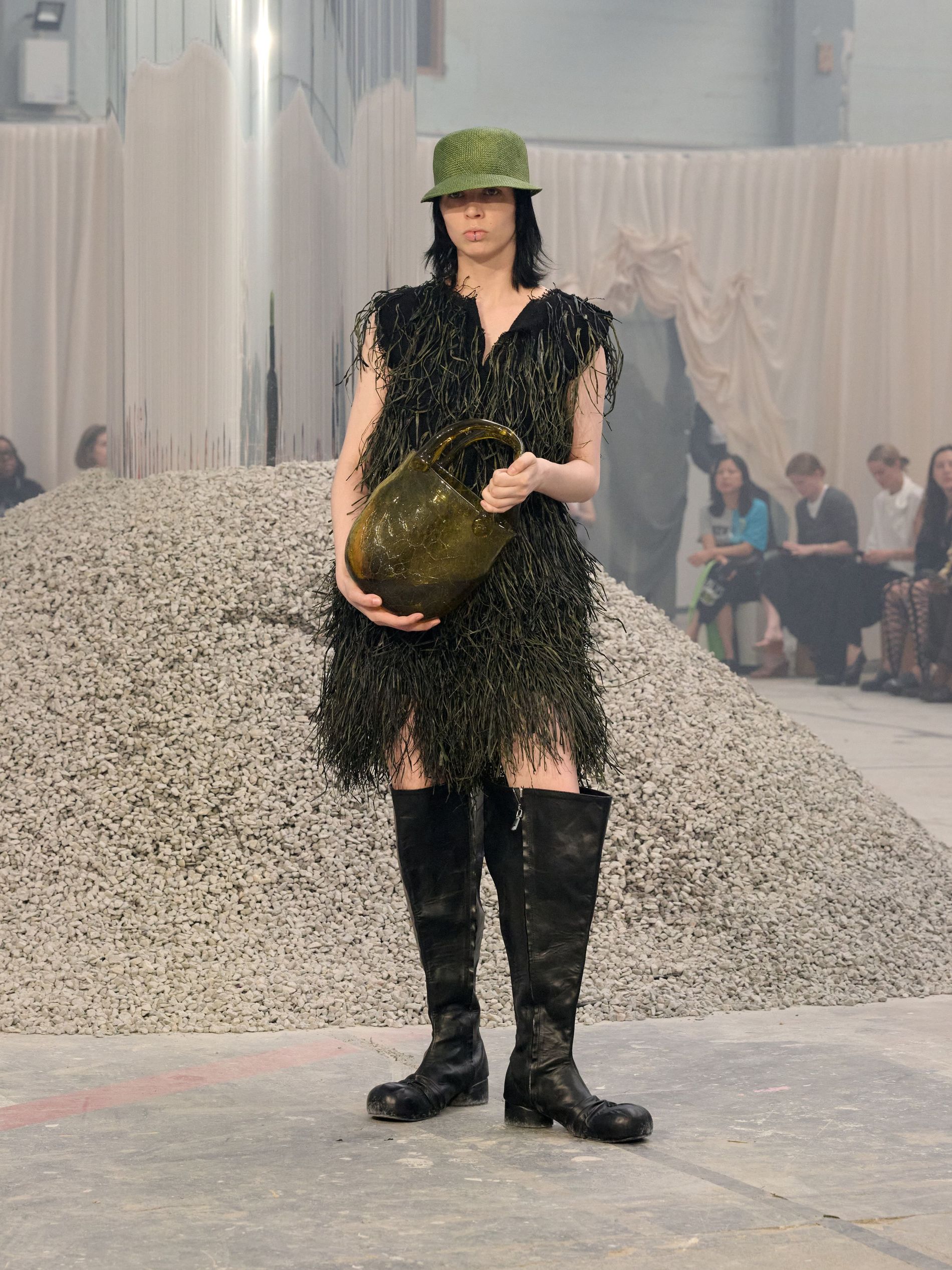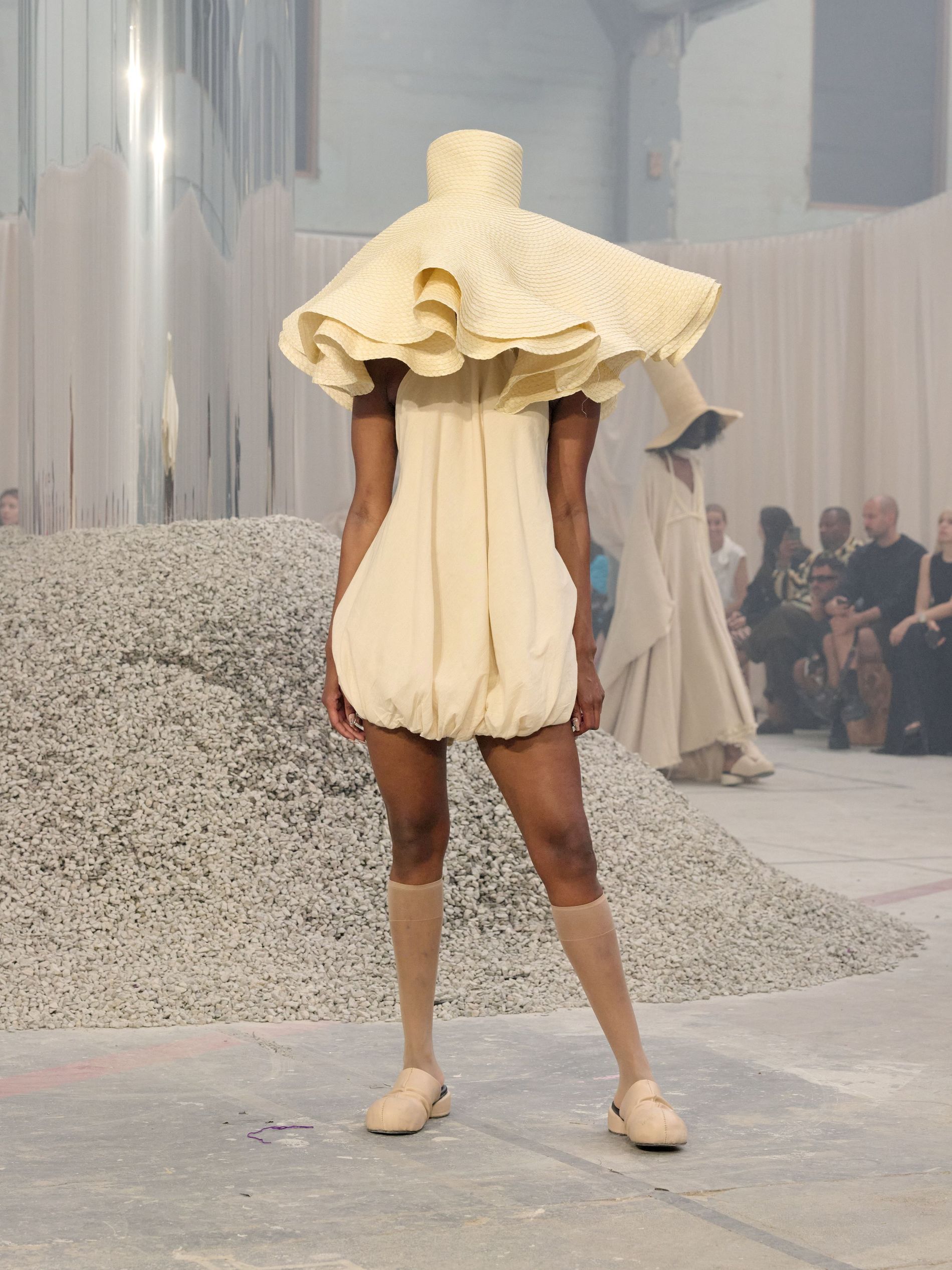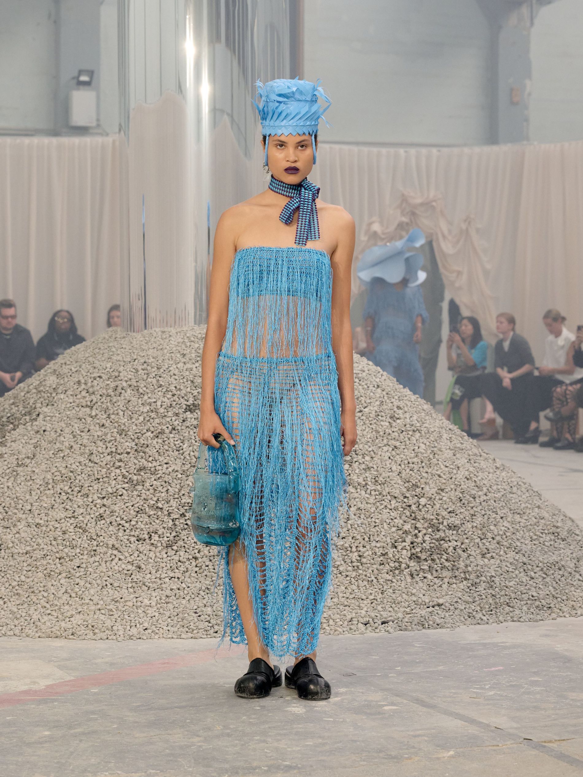 Take, for instance, a show-stopping sculptural raffia piece that took weeks to come together (“It vibrates,” says Ogisi, proudly, a descriptor that could be applied to many of the swaying, living pieces). “It reminds me that the body is its own terrain, and that adornment can hold that,” says the designer. Another standout: a barkcloth and glass-embedded coat that refracts and reflects the gleaming show lights as it comes down the runway. “It holds shadow and reflection in the same breath,” says Ogisi. “Both pieces speak to the duality at the heart of the collection: presence and prayer.” Models held glass bags that doubled as sculpture (in fact, they were filled with water) and vibrant woven bags doubled as hats.