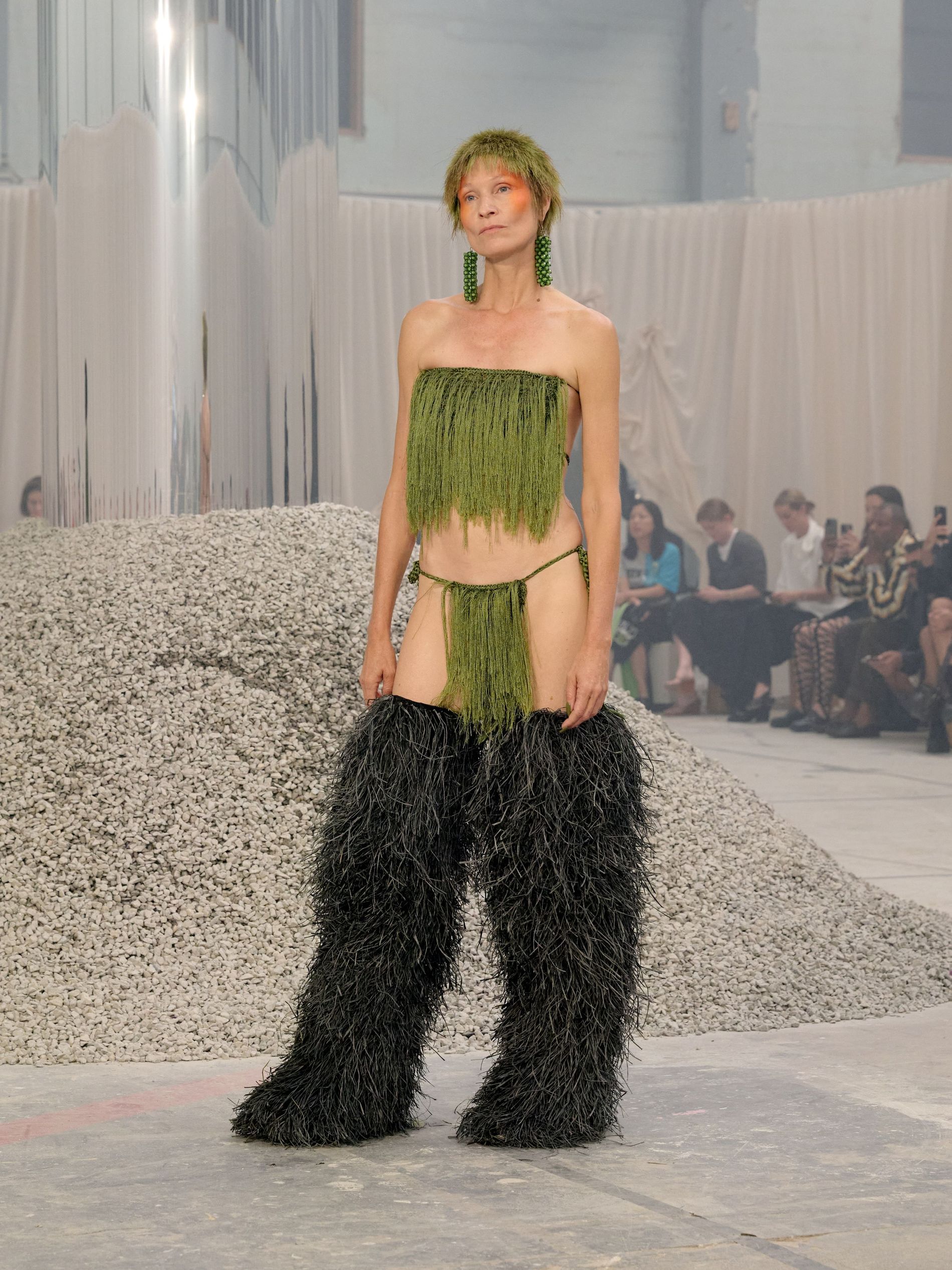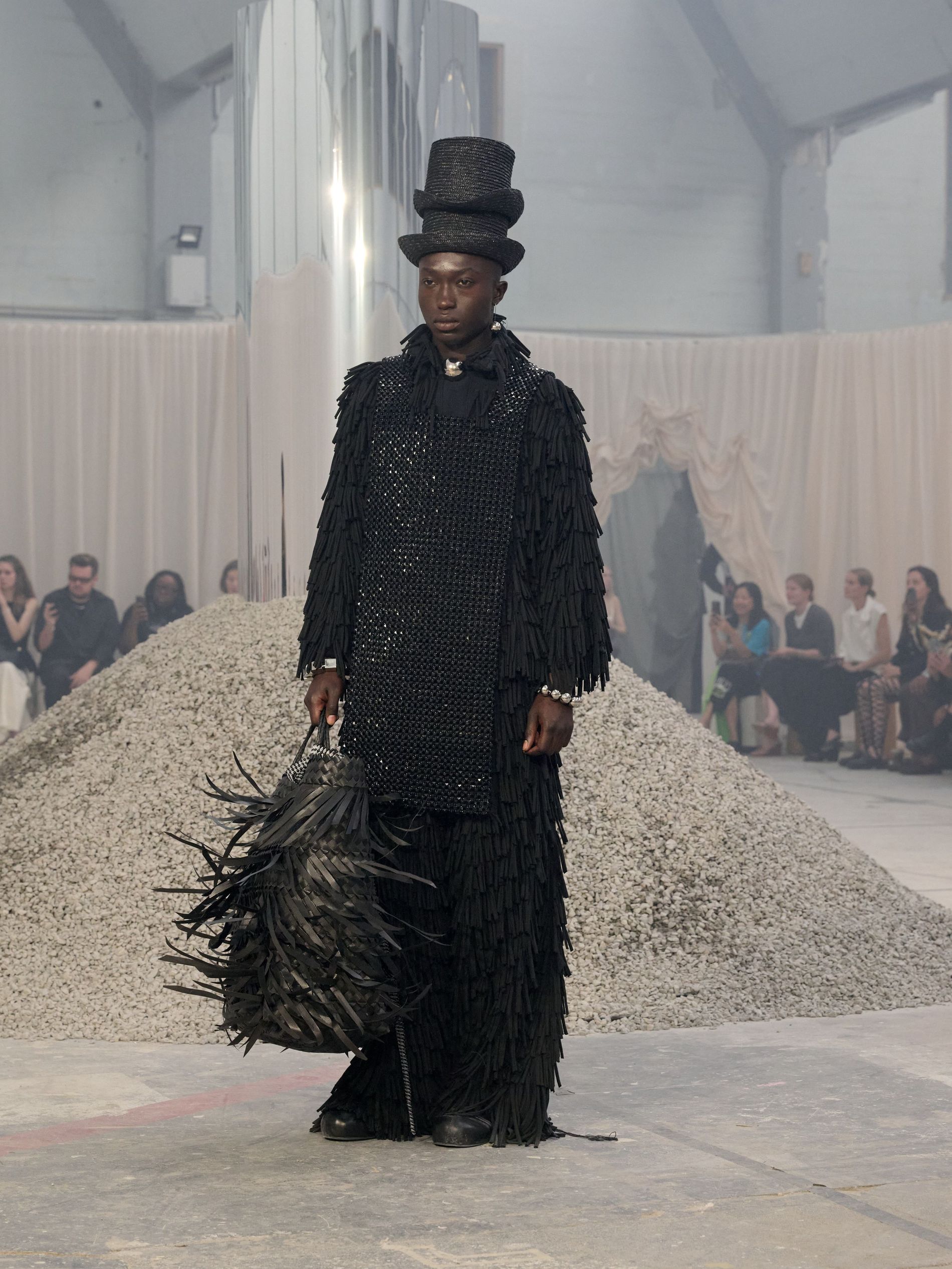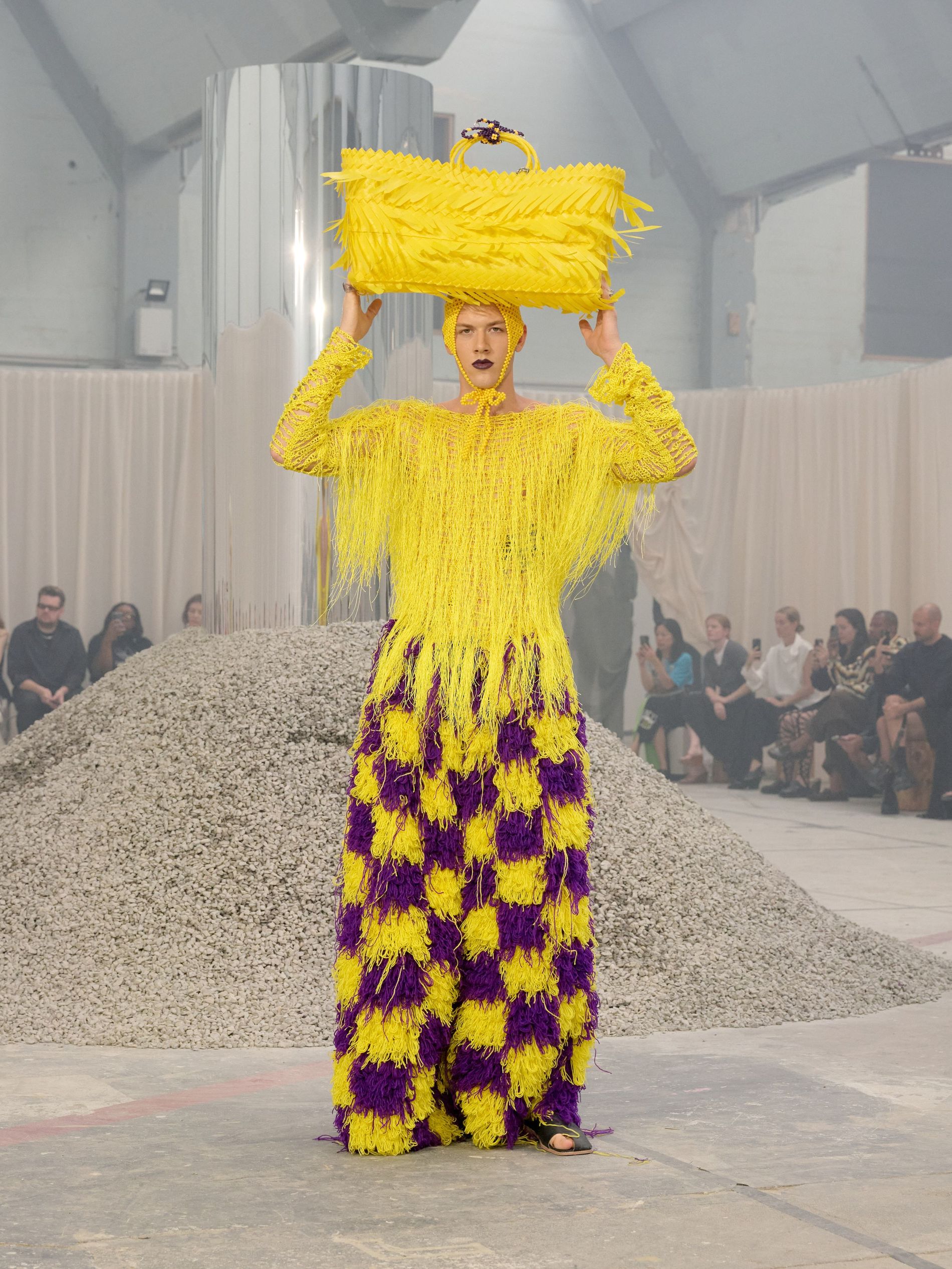 Take, for instance, a show-stopping sculptural raffia piece that took weeks to come together (“It vibrates,” says Ogisi, proudly, a descriptor that could be applied to many of the swaying, living pieces). “It reminds me that the body is its own terrain, and that adornment can hold that,” says the designer. Another standout: a barkcloth and glass-embedded coat that refracts and reflects the gleaming show lights as it comes down the runway. “It holds shadow and reflection in the same breath,” says Ogisi. “Both pieces speak to the duality at the heart of the collection: presence and prayer.” Models held glass bags that doubled as sculpture (in fact, they were filled with water) and vibrant woven bags doubled as hats.