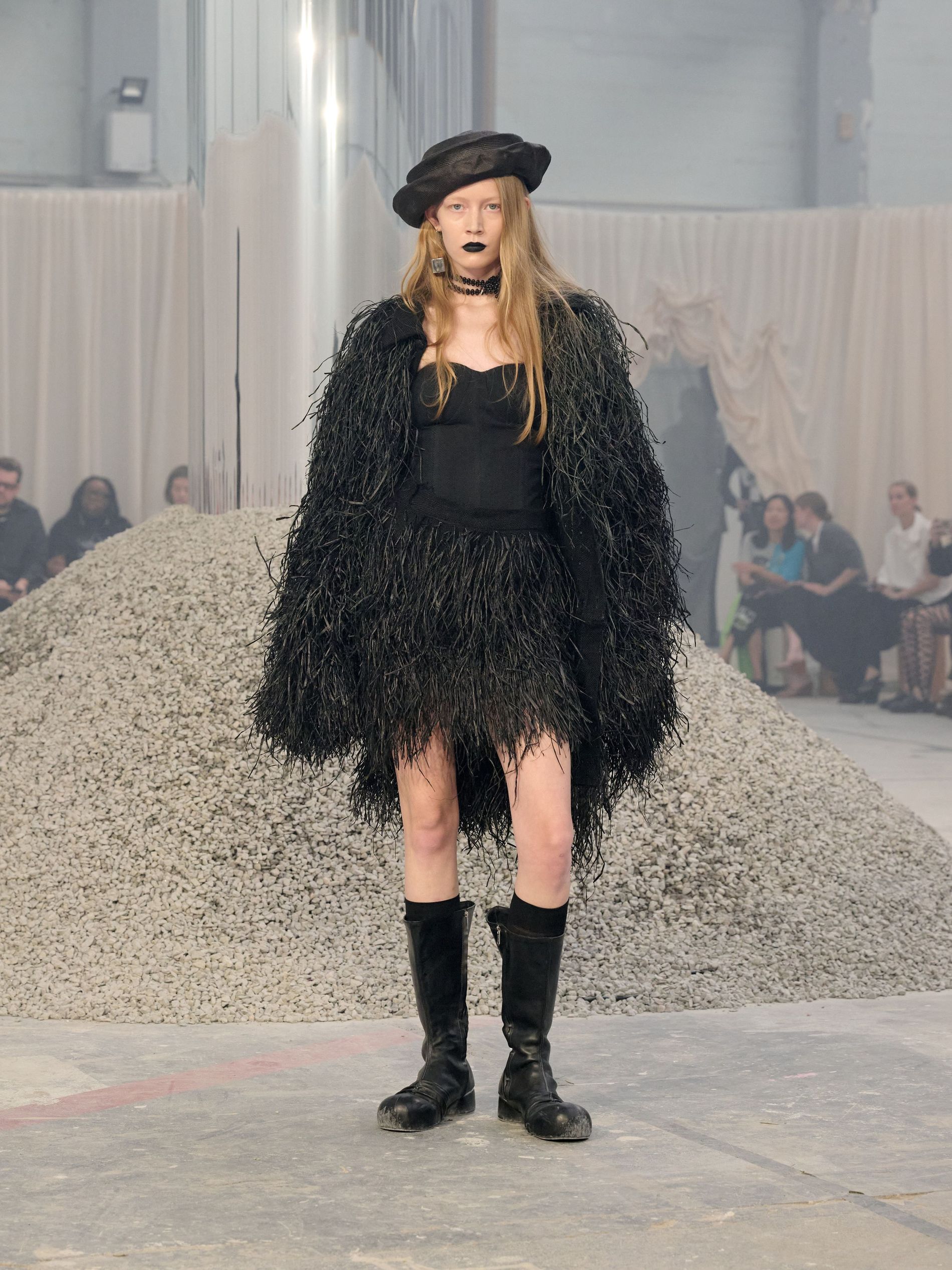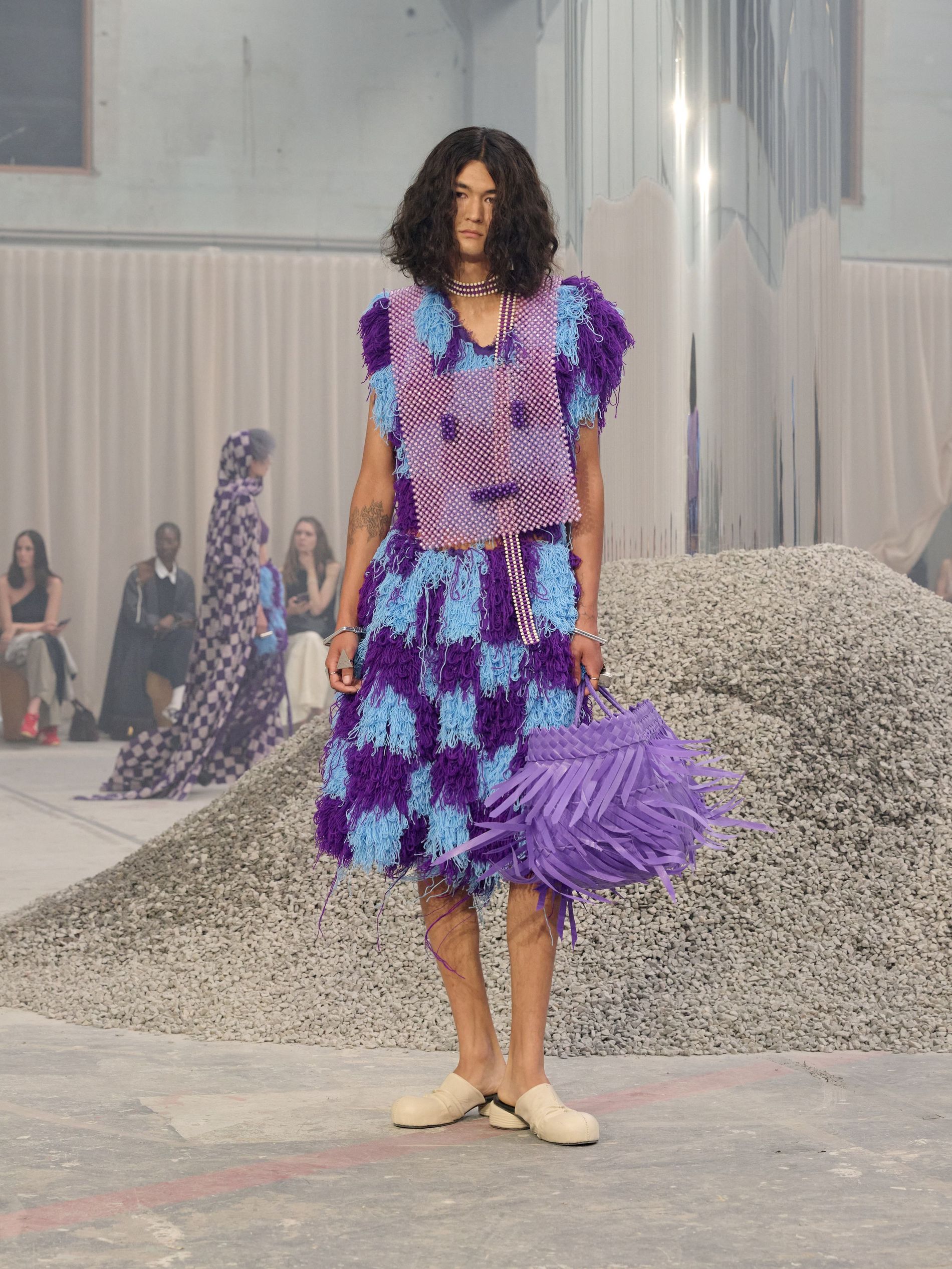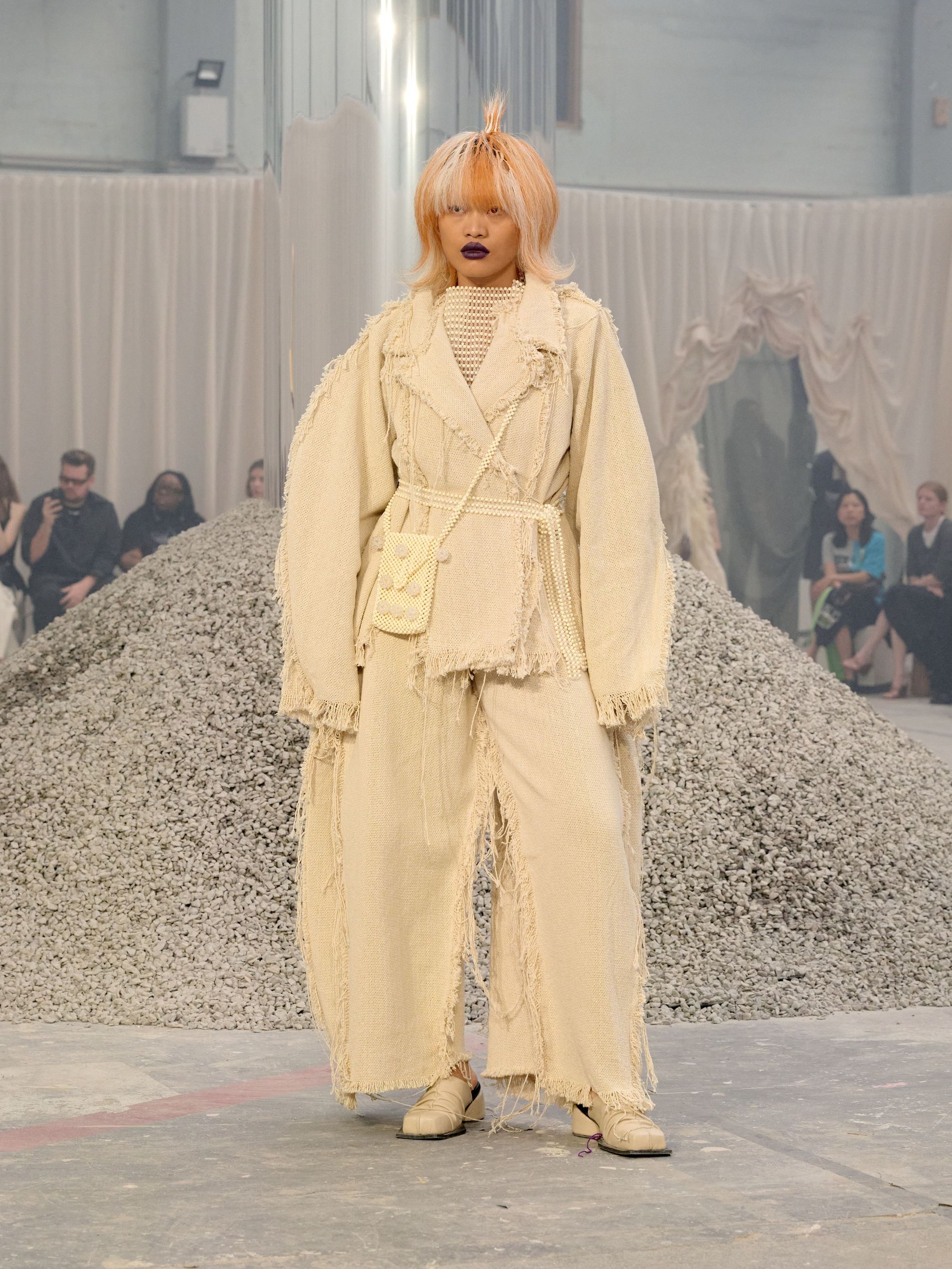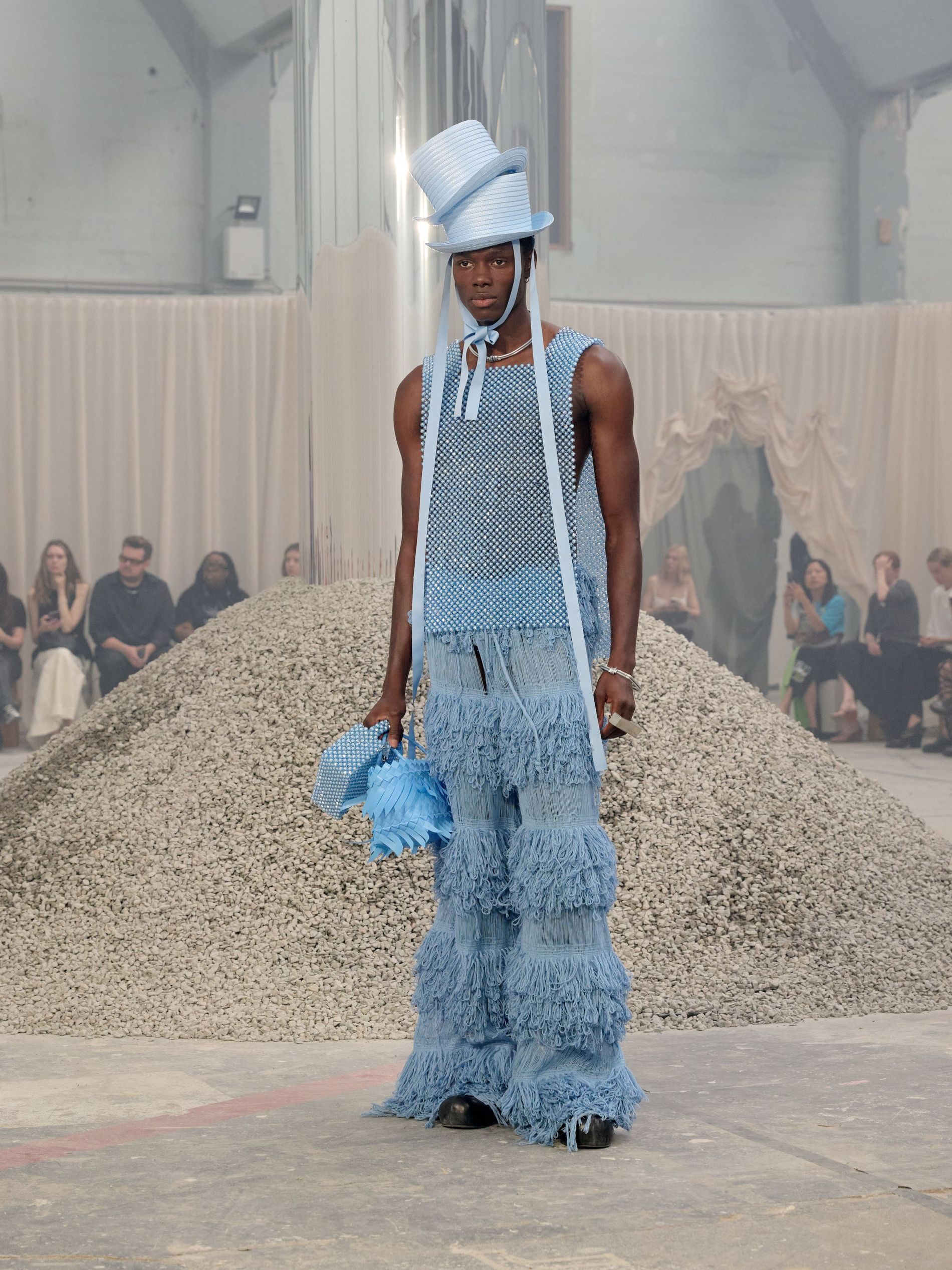 Take, for instance, a show-stopping sculptural raffia piece that took weeks to come together (“It vibrates,” says Ogisi, proudly, a descriptor that could be applied to many of the swaying, living pieces). “It reminds me that the body is its own terrain, and that adornment can hold that,” says the designer. Another standout: a barkcloth and glass-embedded coat that refracts and reflects the gleaming show lights as it comes down the runway. “It holds shadow and reflection in the same breath,” says Ogisi. “Both pieces speak to the duality at the heart of the collection: presence and prayer.” Models held glass bags that doubled as sculpture (in fact, they were filled with water) and vibrant woven bags doubled as hats.
