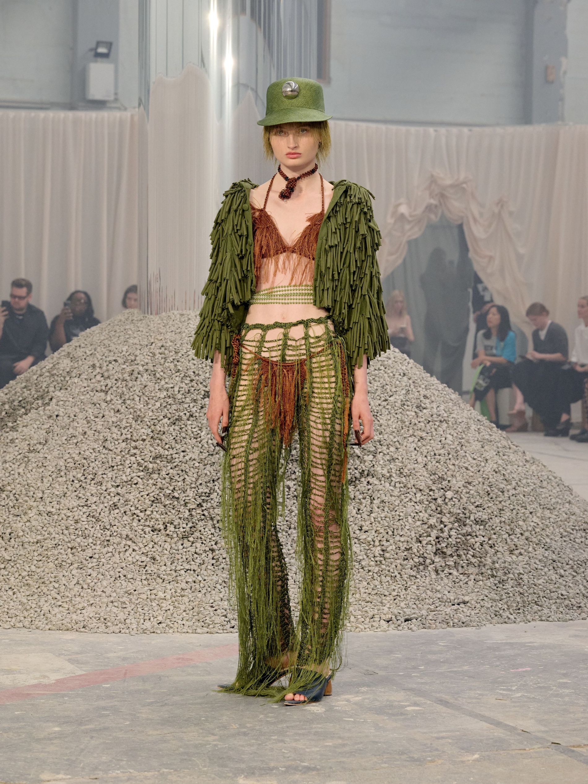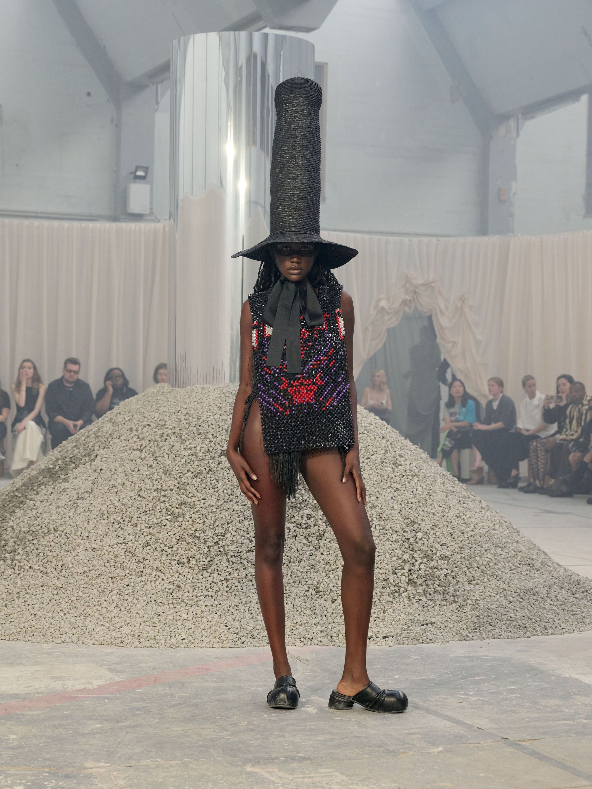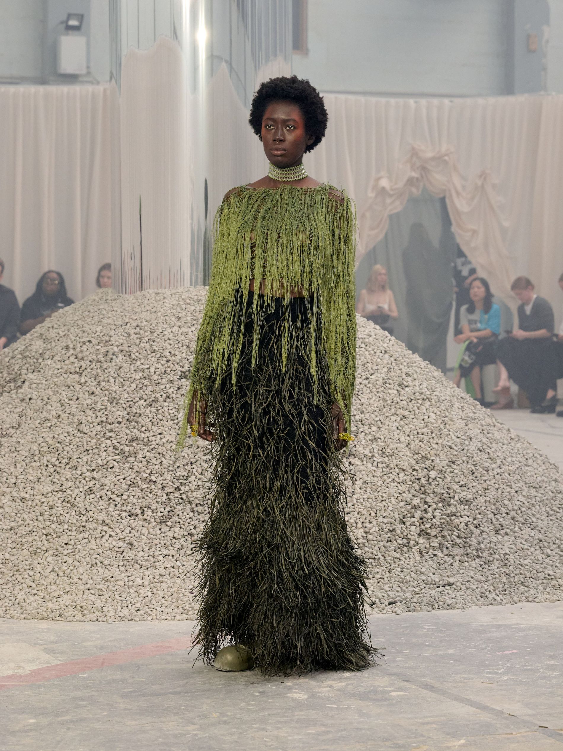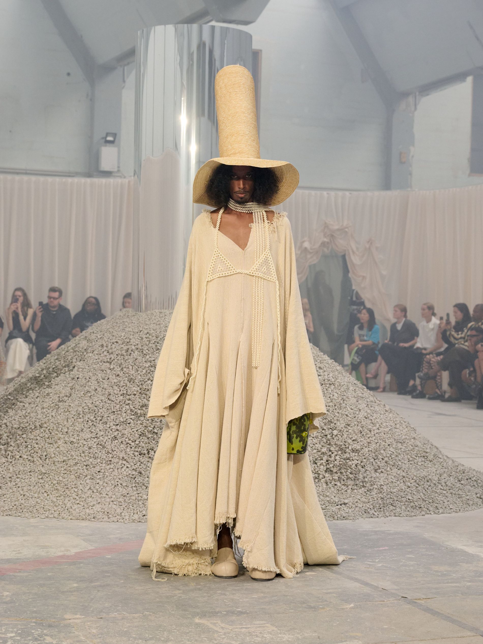 The collection may not have been about spectacle, but it was certainly about beauty and craft. Drawing on the brand’s roots in Lagos, Nairobi, and Accra, the garments are a symphony of material: cotton from Uganda and Kenya, raffia and jute from Nigeria, sisal from Tanzania. But, as Ogisi puts it, these materials are only “half the story”. “The real magic is in how they’re transformed,” she says, listing off hand-weaving, chainmail forging, fibre knotting and glass blowing as four techniques on view on the runway. IAMISIGO collaborated with artisans from across Africa (Kenya and Nigeria in particular) to “reclaim pre-colonial and indigenous techniques as ancestral technologies”. “These aren’t decorative,” Ogisi adds. “They’re functional, spiritual, encoded with memory.”