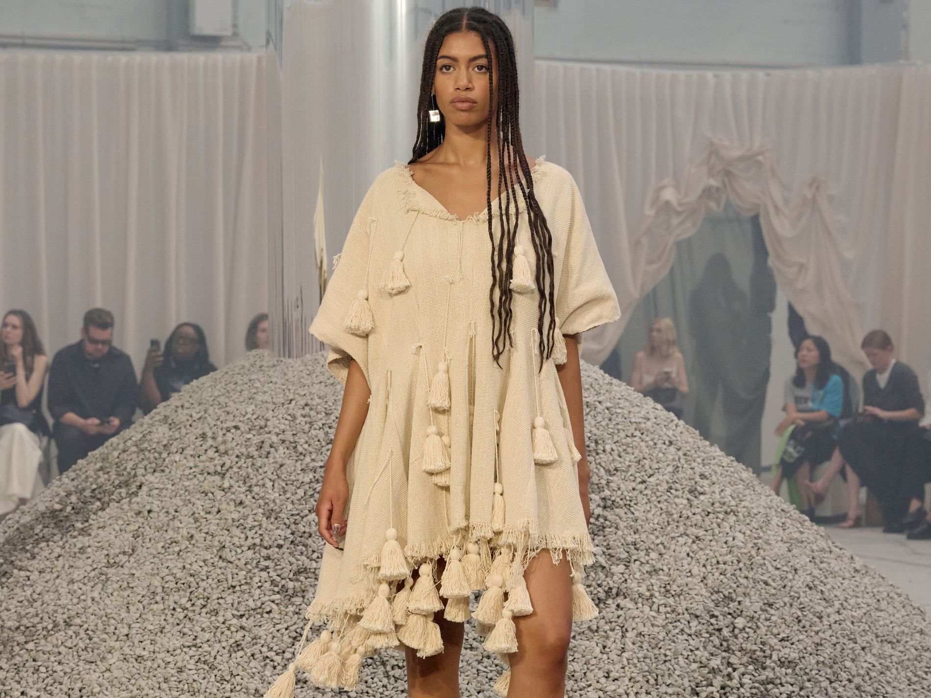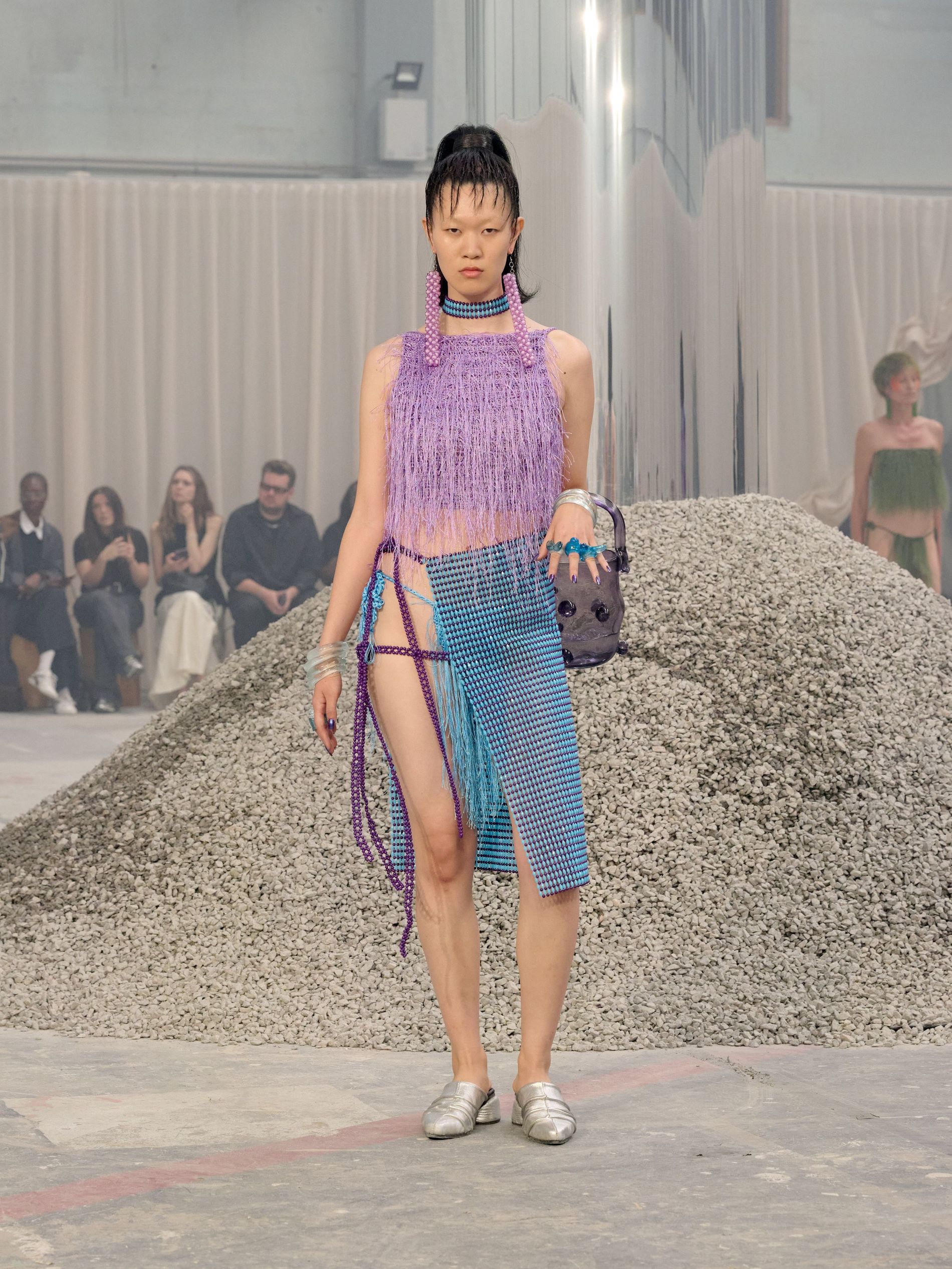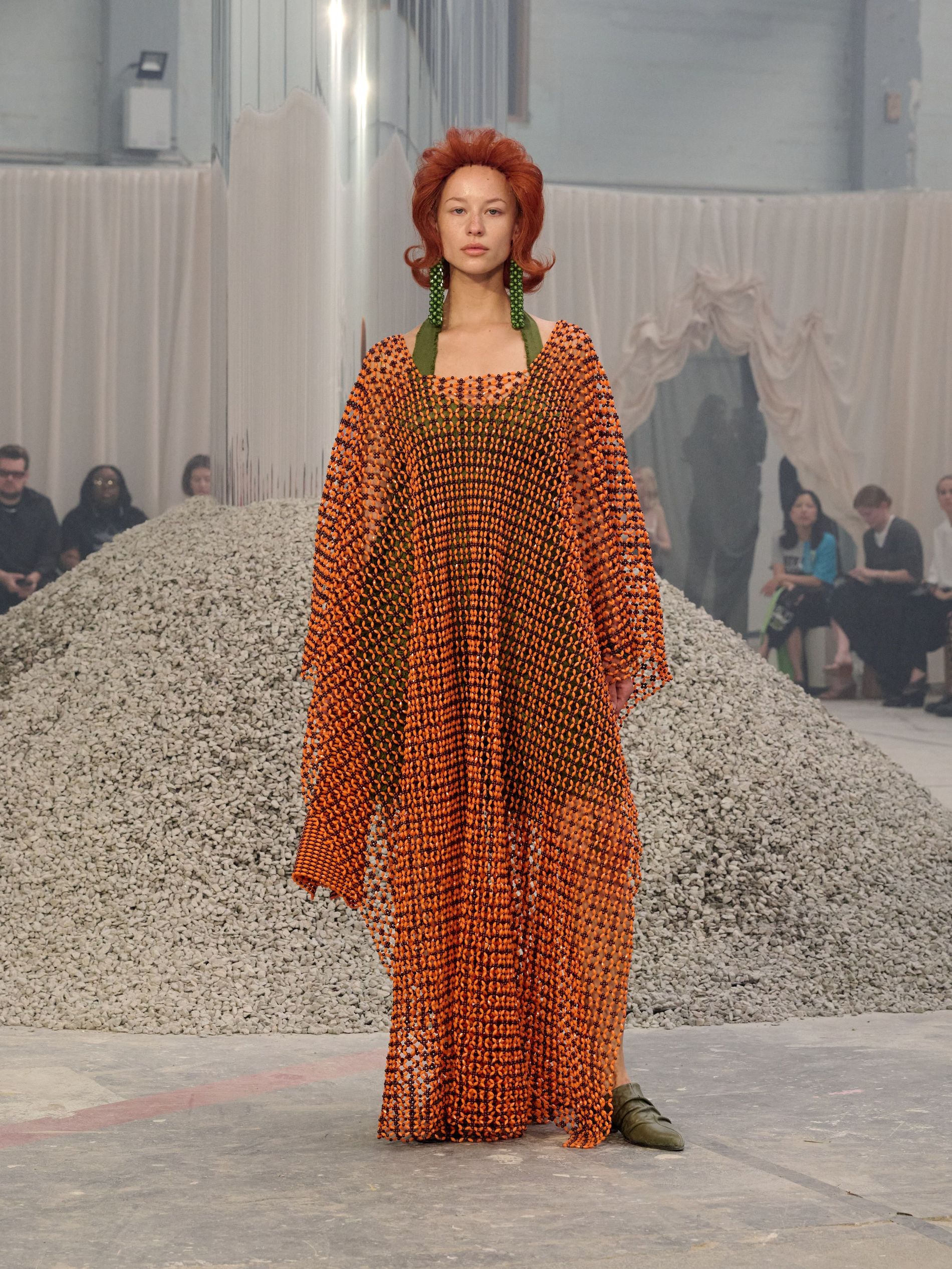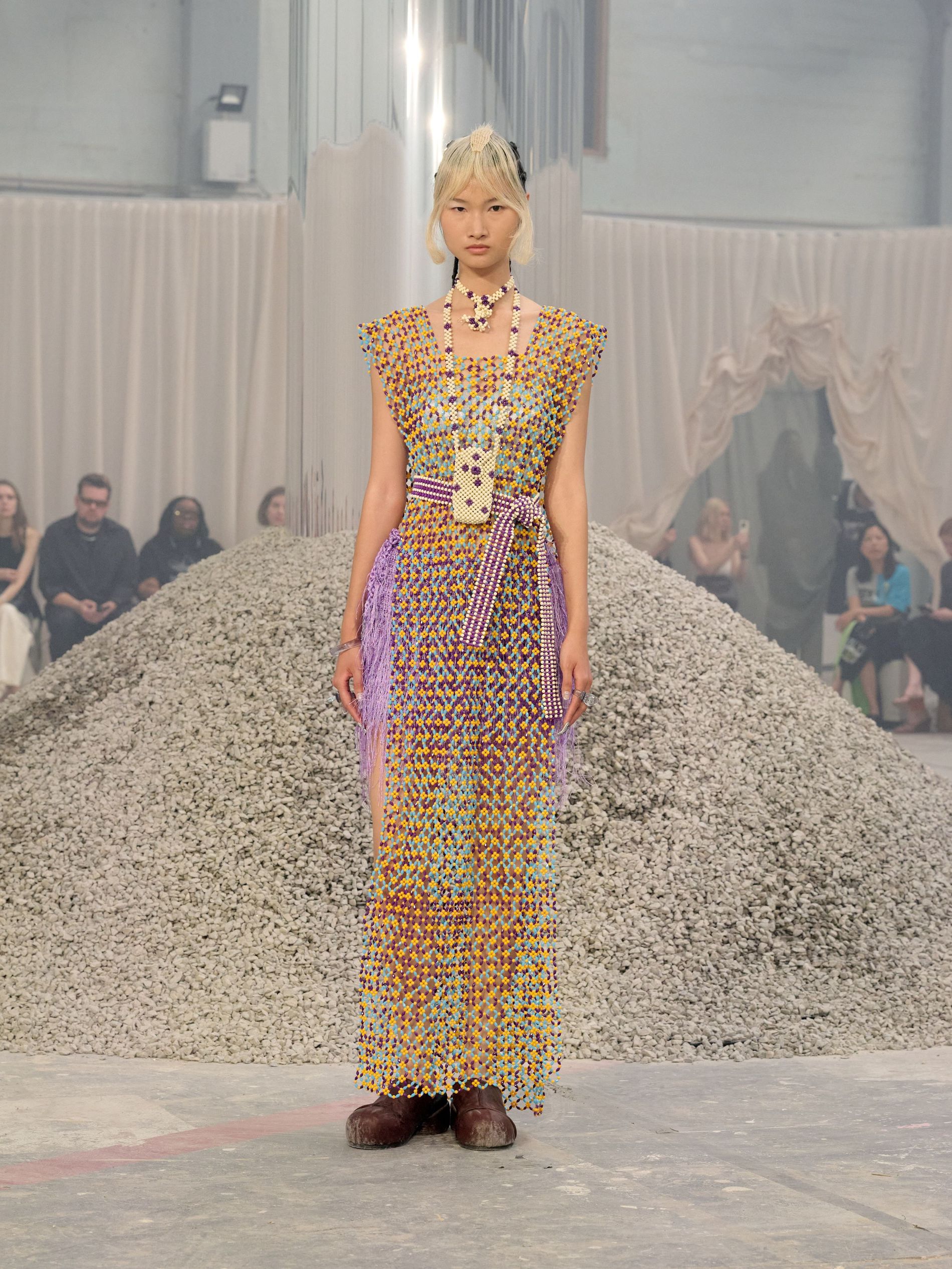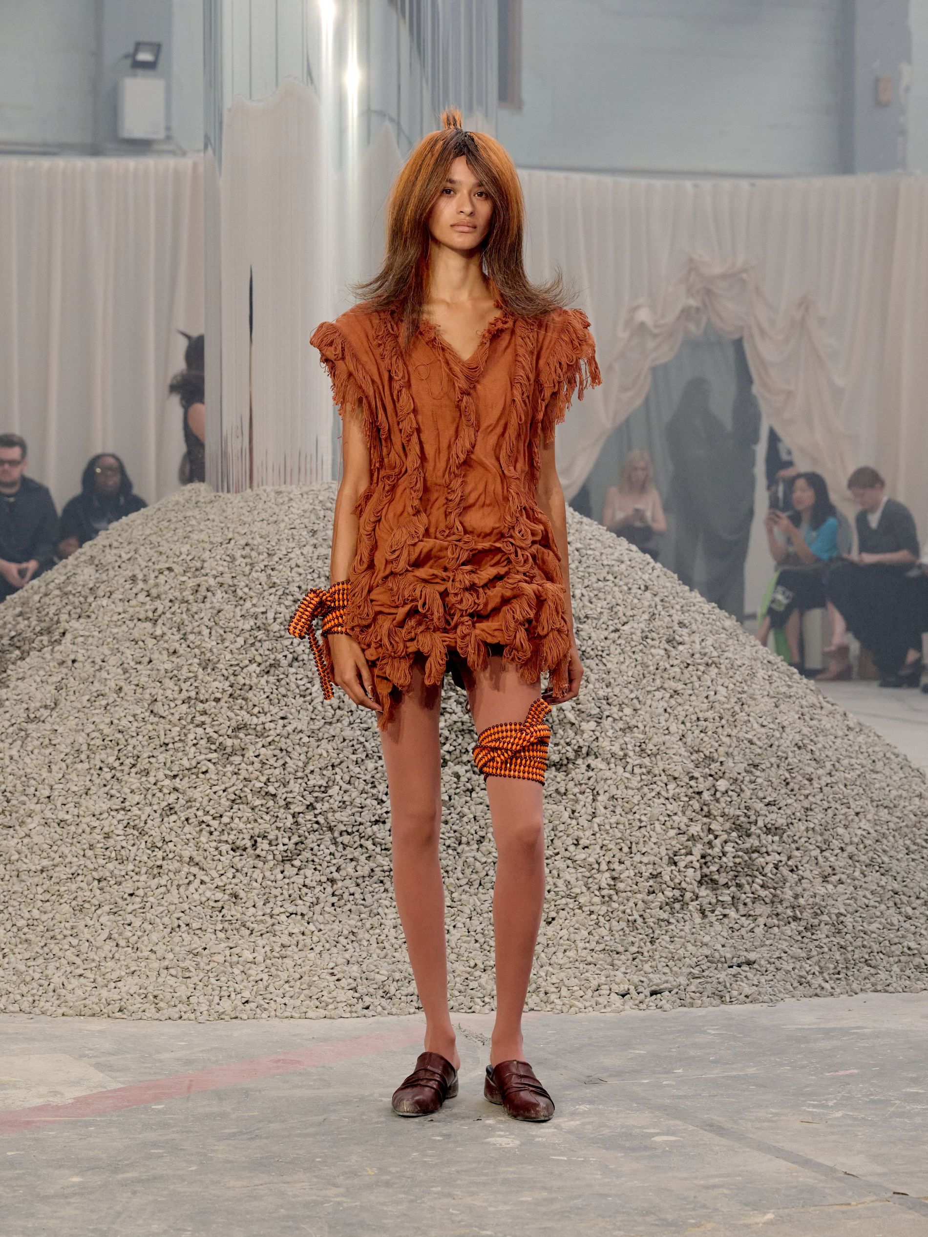 The collection may not have been about spectacle, but it was certainly about beauty and craft. Drawing on the brand’s roots in Lagos, Nairobi, and Accra, the garments are a symphony of material: cotton from Uganda and Kenya, raffia and jute from Nigeria, sisal from Tanzania. But, as Ogisi puts it, these materials are only “half the story”. “The real magic is in how they’re transformed,” she says, listing off hand-weaving, chainmail forging, fibre knotting and glass blowing as four techniques on view on the runway. IAMISIGO collaborated with artisans from across Africa (Kenya and Nigeria in particular) to “reclaim pre-colonial and indigenous techniques as ancestral technologies”. “These aren’t decorative,” Ogisi adds. “They’re functional, spiritual, encoded with memory.”
