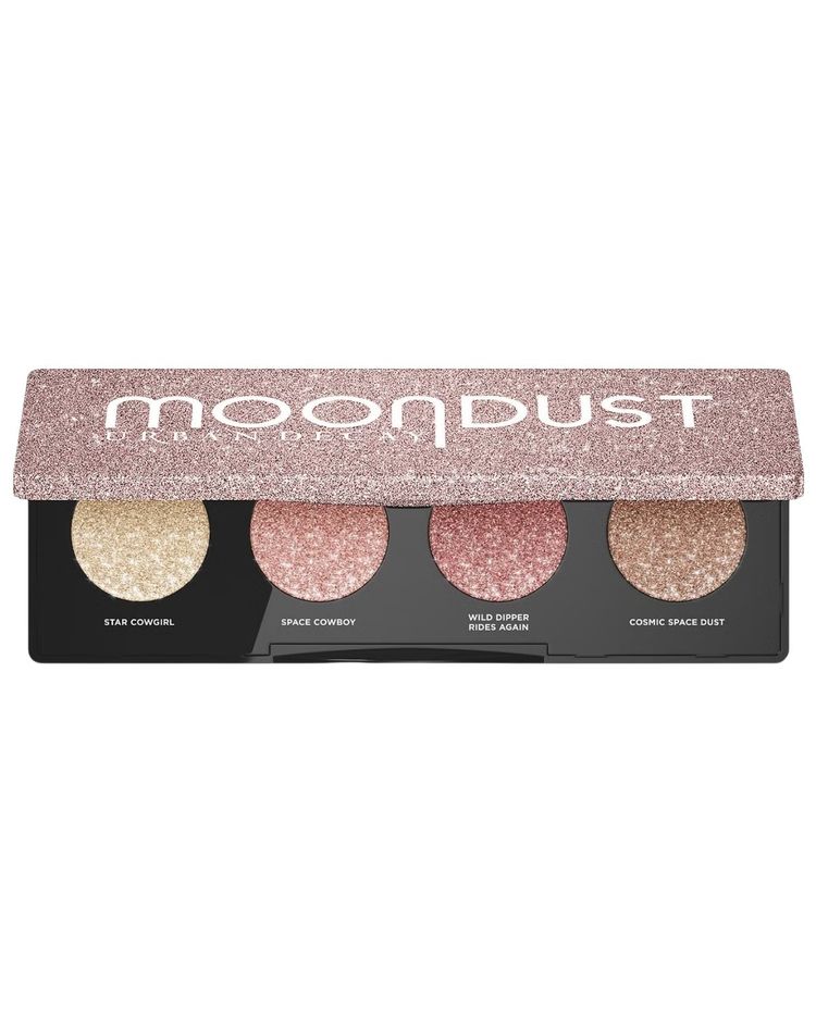 Start with bold pink blush, swept well beyond the apples of the cheeks and up to the temples. Add electric blue eyeshadow and don’t be afraid to layer glitter wherever it catches the light.