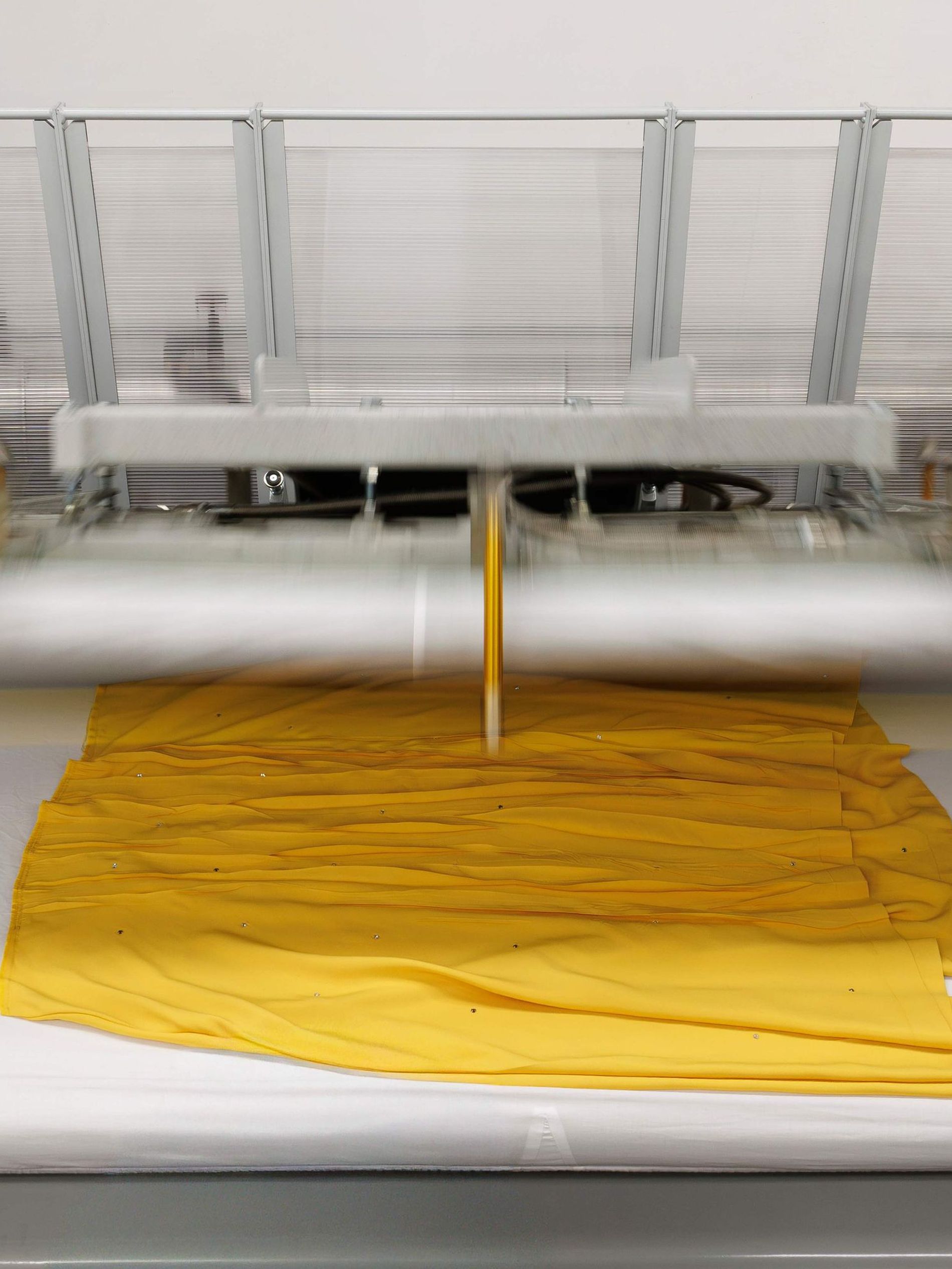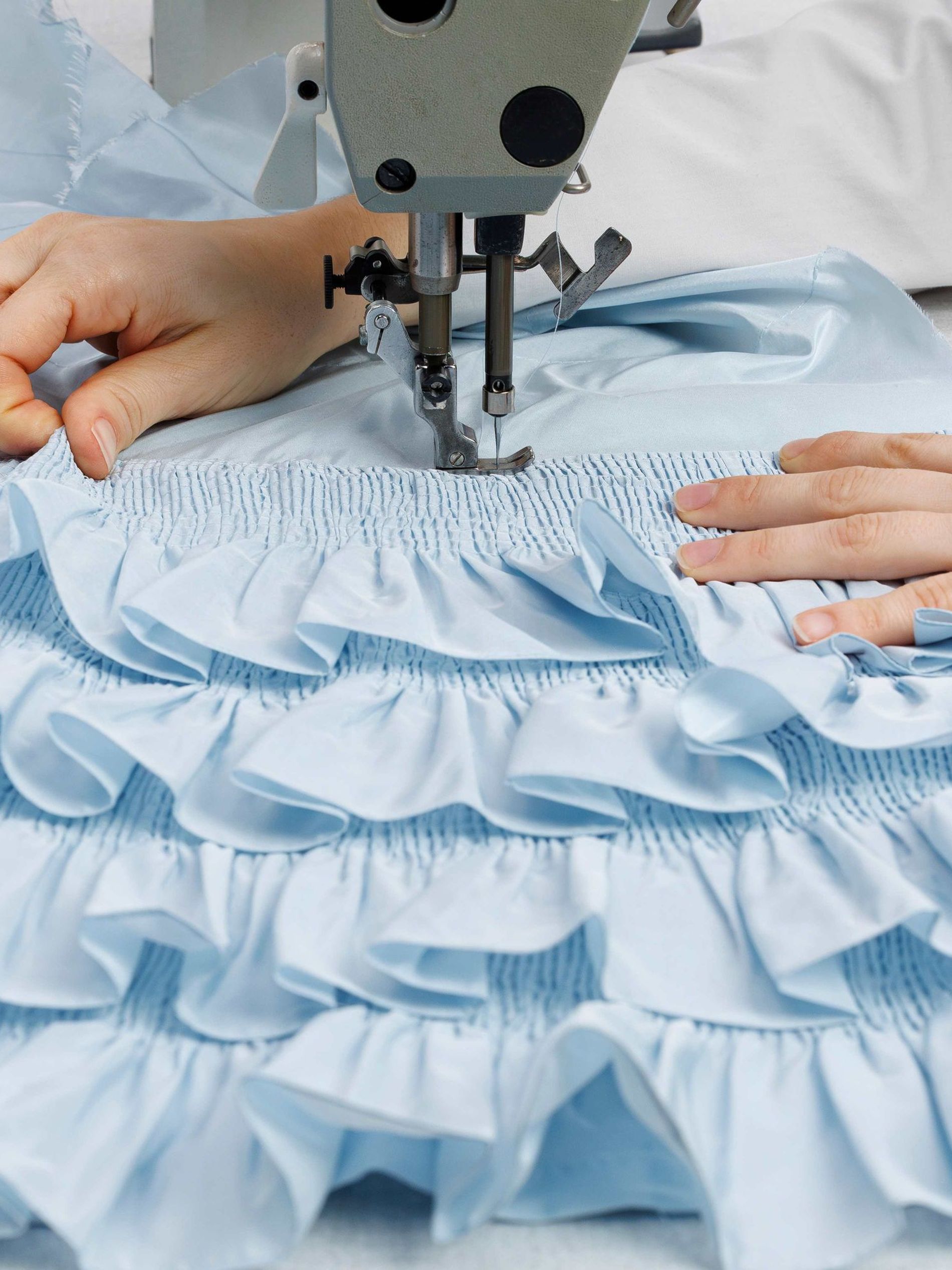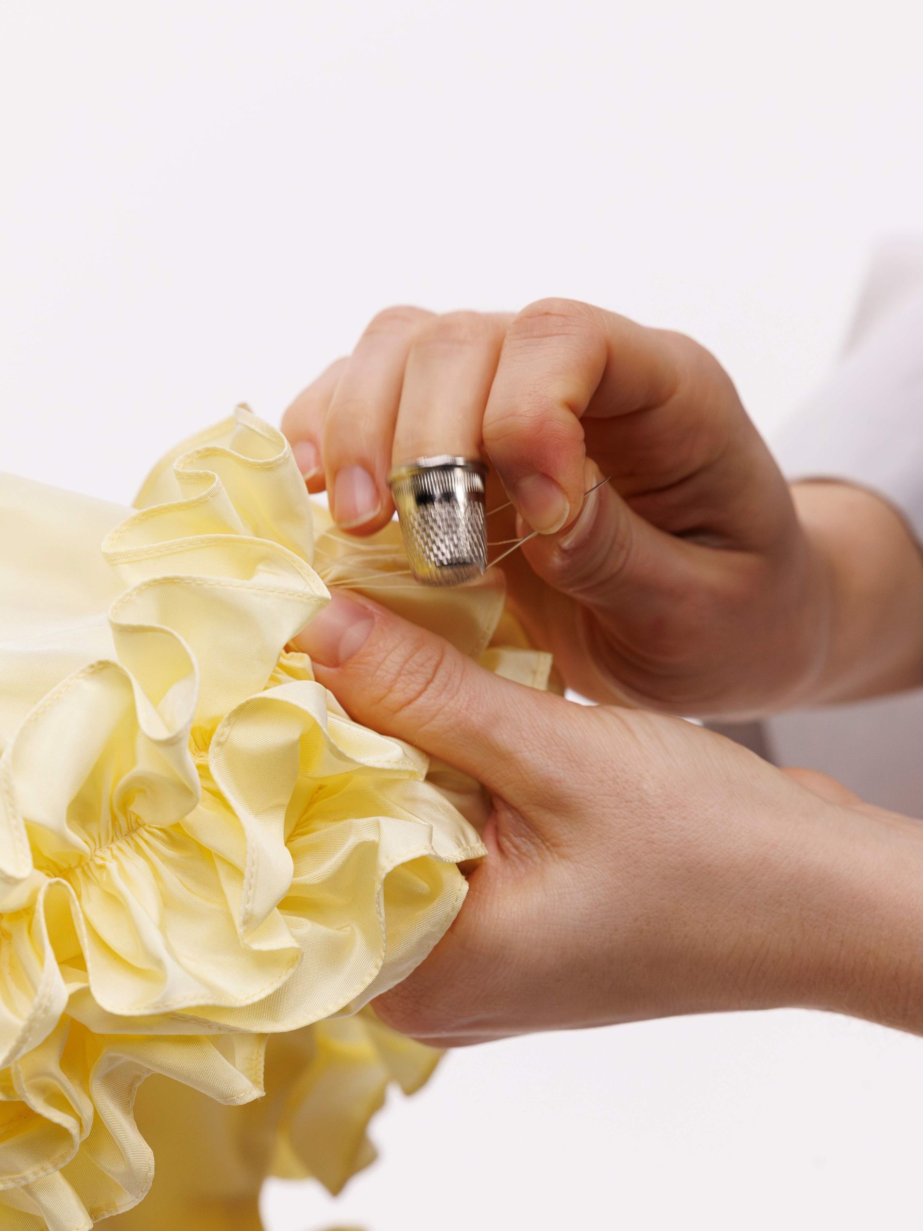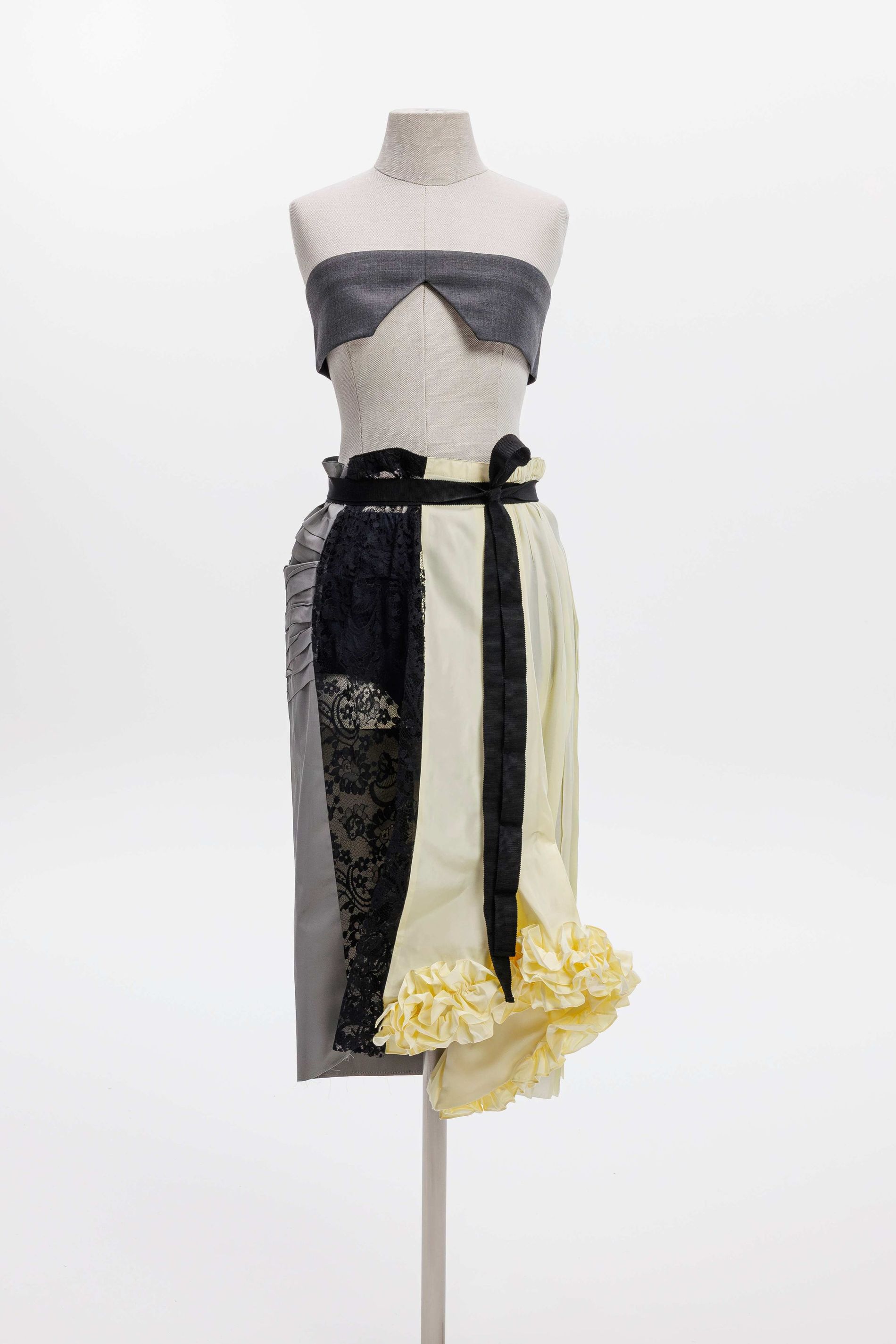 The back section introduces volume through a three-tier construction in taffeta. A structural base layer supports successive rows of gathered ruffles, culminating in seven embroidered bands applied by hand. The effect is not simply decorative but architectural, building dimension gradually across the garment. A grosgrain belt defines the waist and stabilises the composition. In total, the skirt required 27 hours of work to complete in the atelier.
