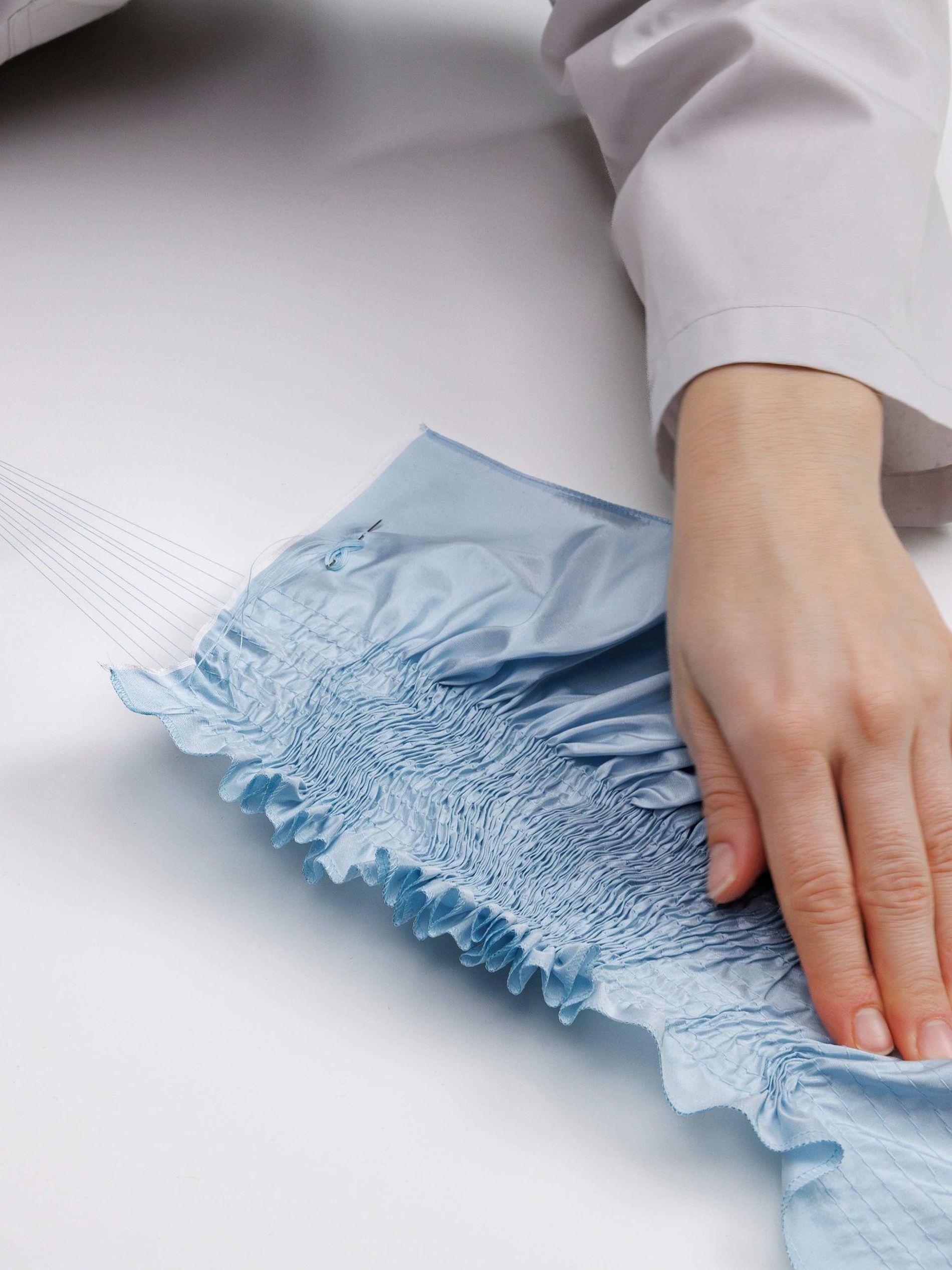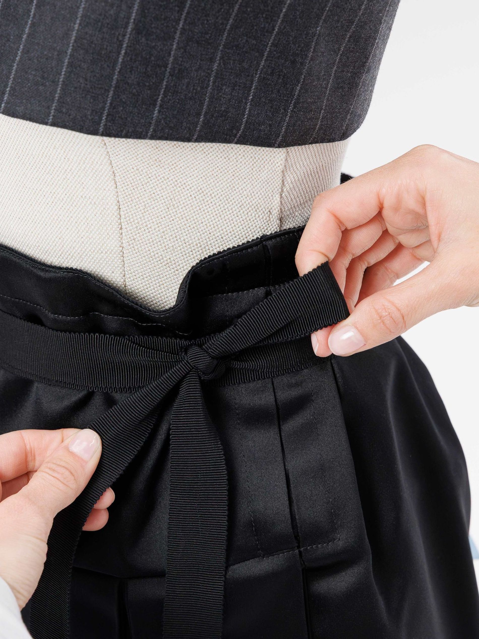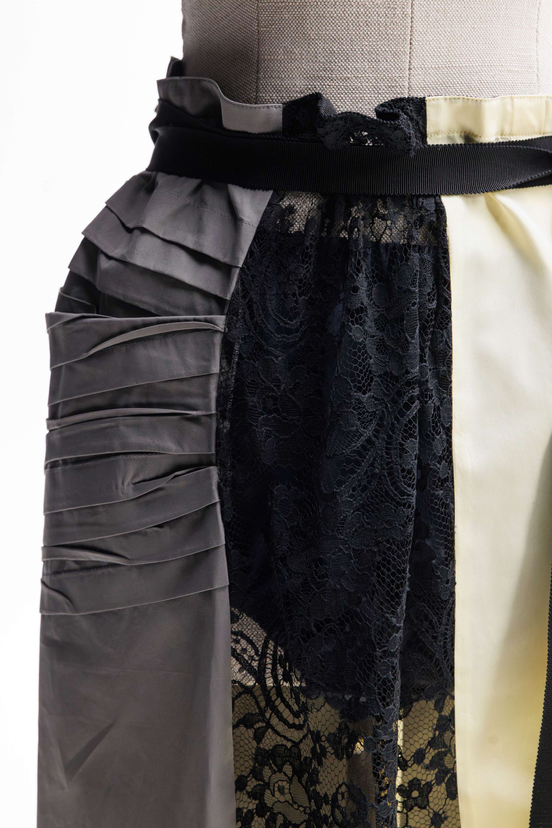 Elsewhere, a crepe de Chine back panel introduces softness and continuity, while at the hip a pleated poplin insert is deliberately worked to create an irregular crinkled surface. Each pleat is first topstitched by hand before being pressed into place, producing unexpected geometries that shift subtly as the wearer moves. As with Look 8, a grosgrain waistband acts as a fixed point within an otherwise changing structure. This version required 19 hours of work to complete.
