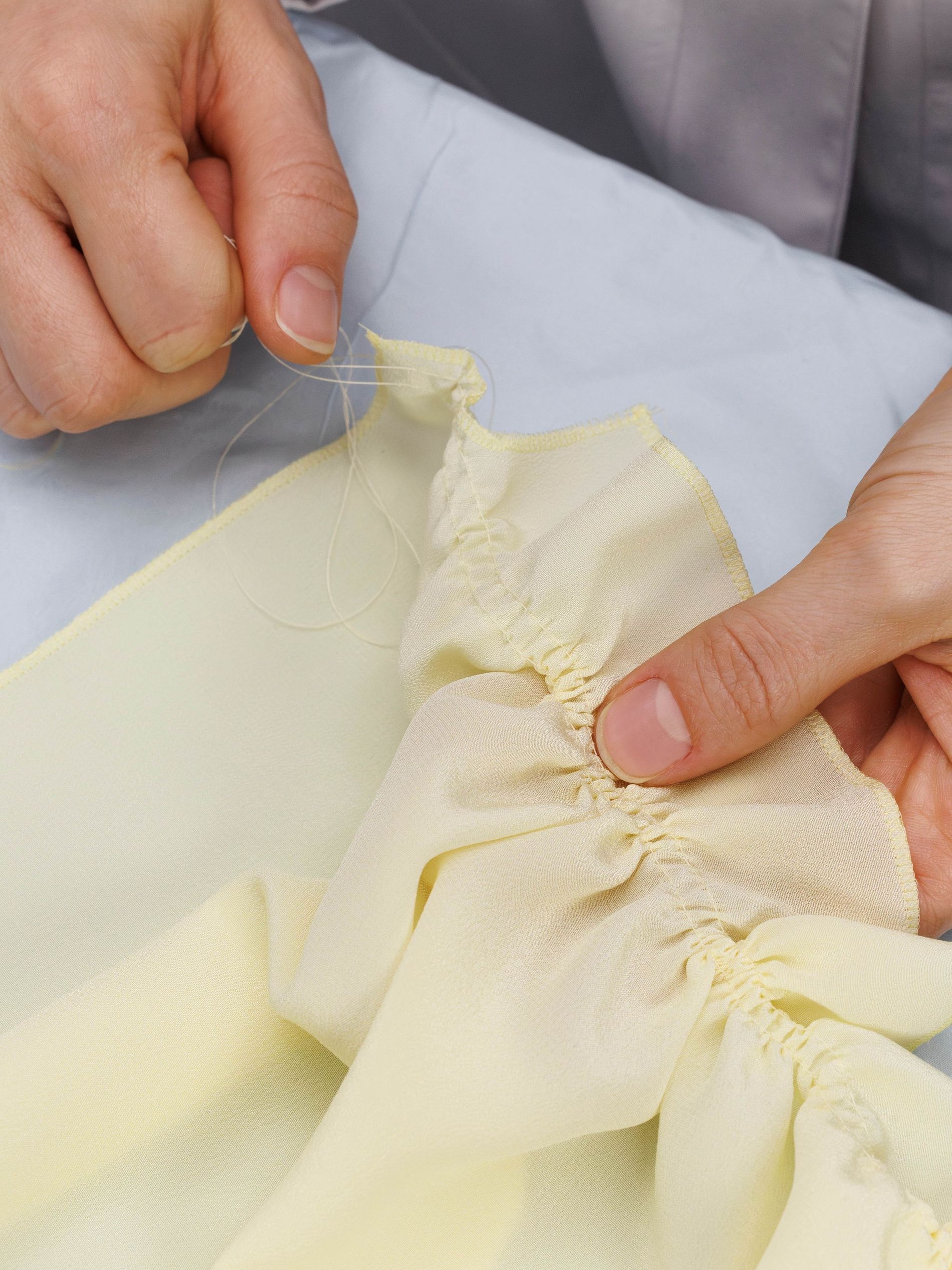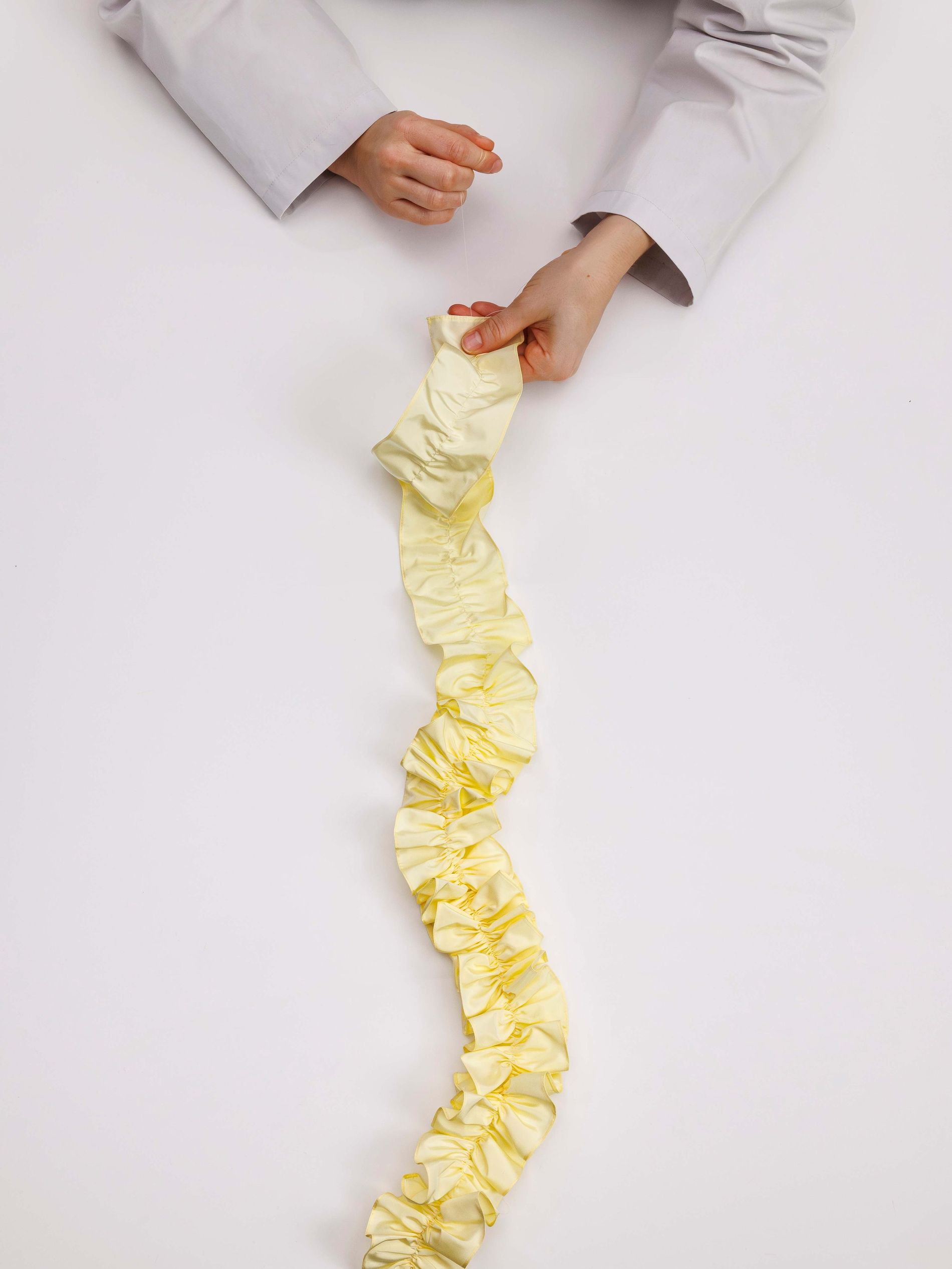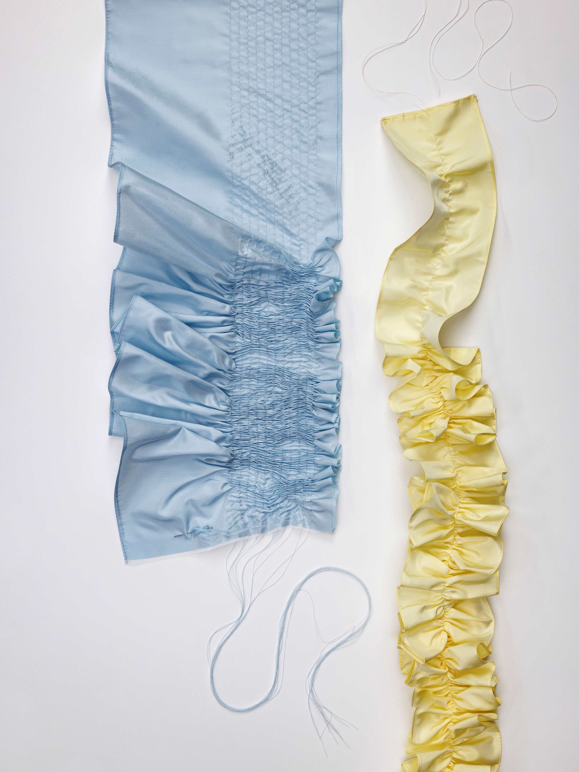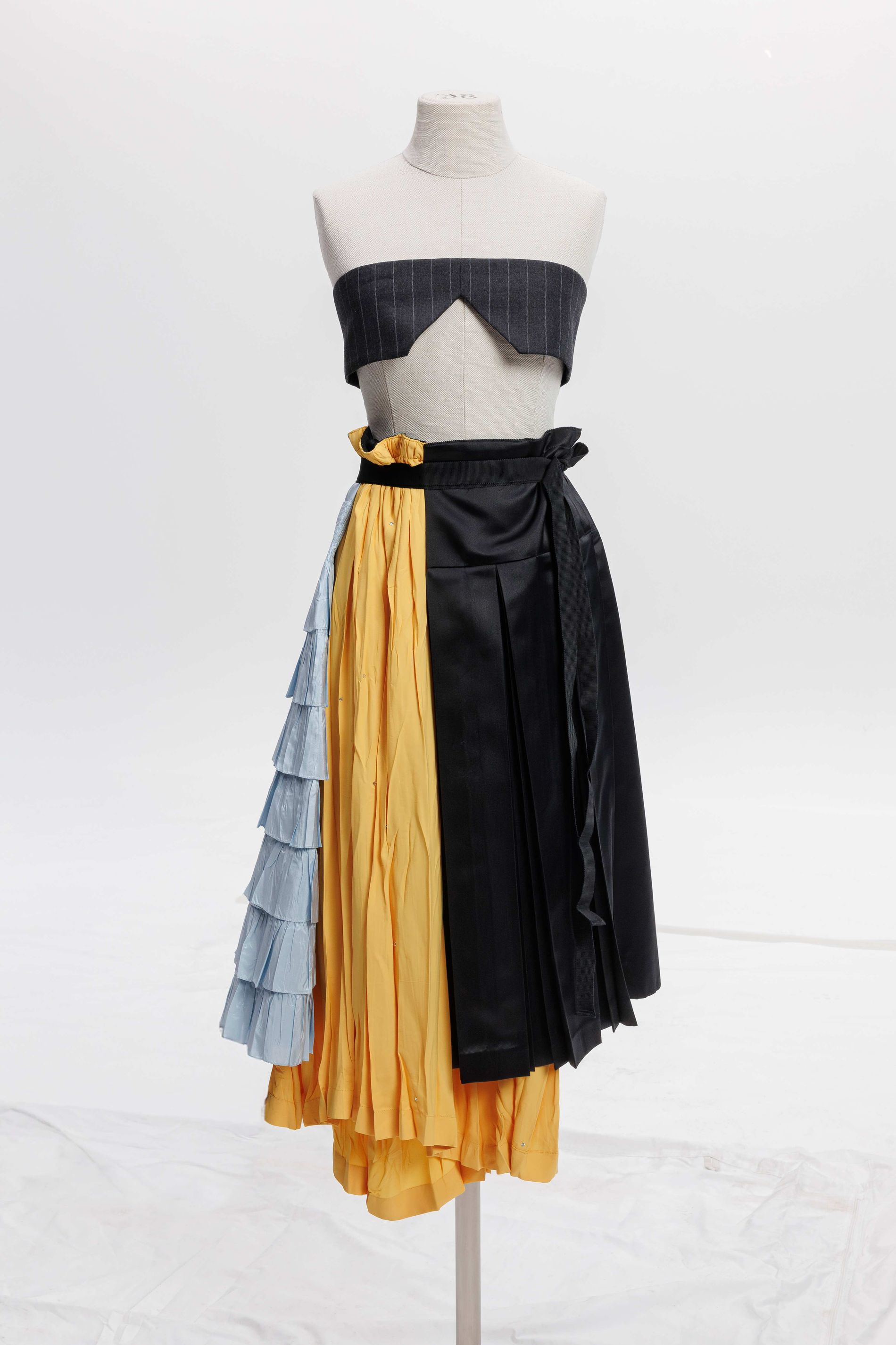 Elsewhere, a crepe de Chine back panel introduces softness and continuity, while at the hip a pleated poplin insert is deliberately worked to create an irregular crinkled surface. Each pleat is first topstitched by hand before being pressed into place, producing unexpected geometries that shift subtly as the wearer moves. As with Look 8, a grosgrain waistband acts as a fixed point within an otherwise changing structure. This version required 19 hours of work to complete.