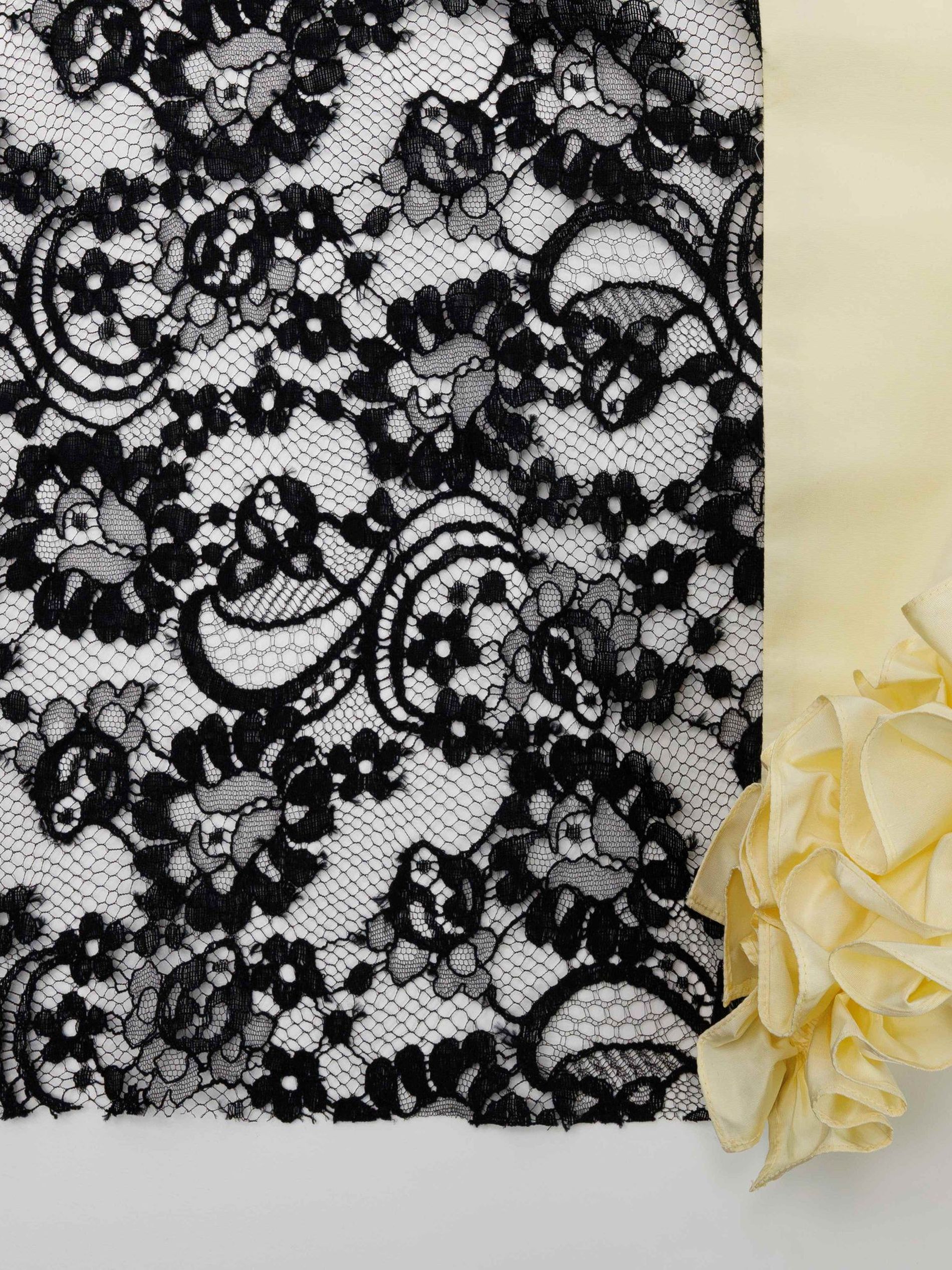 Look 36 approaches the same proposition differently, exploring the relationship between lightness and structure across four distinct fabrics. At the front, semi-transparent lace overlays taffeta to introduce depth without weight, while architectural pleats regulate the flare at the hem. Two rows of gathered ruffles, again applied by hand, extend the skirt’s dimensionality while maintaining its line.