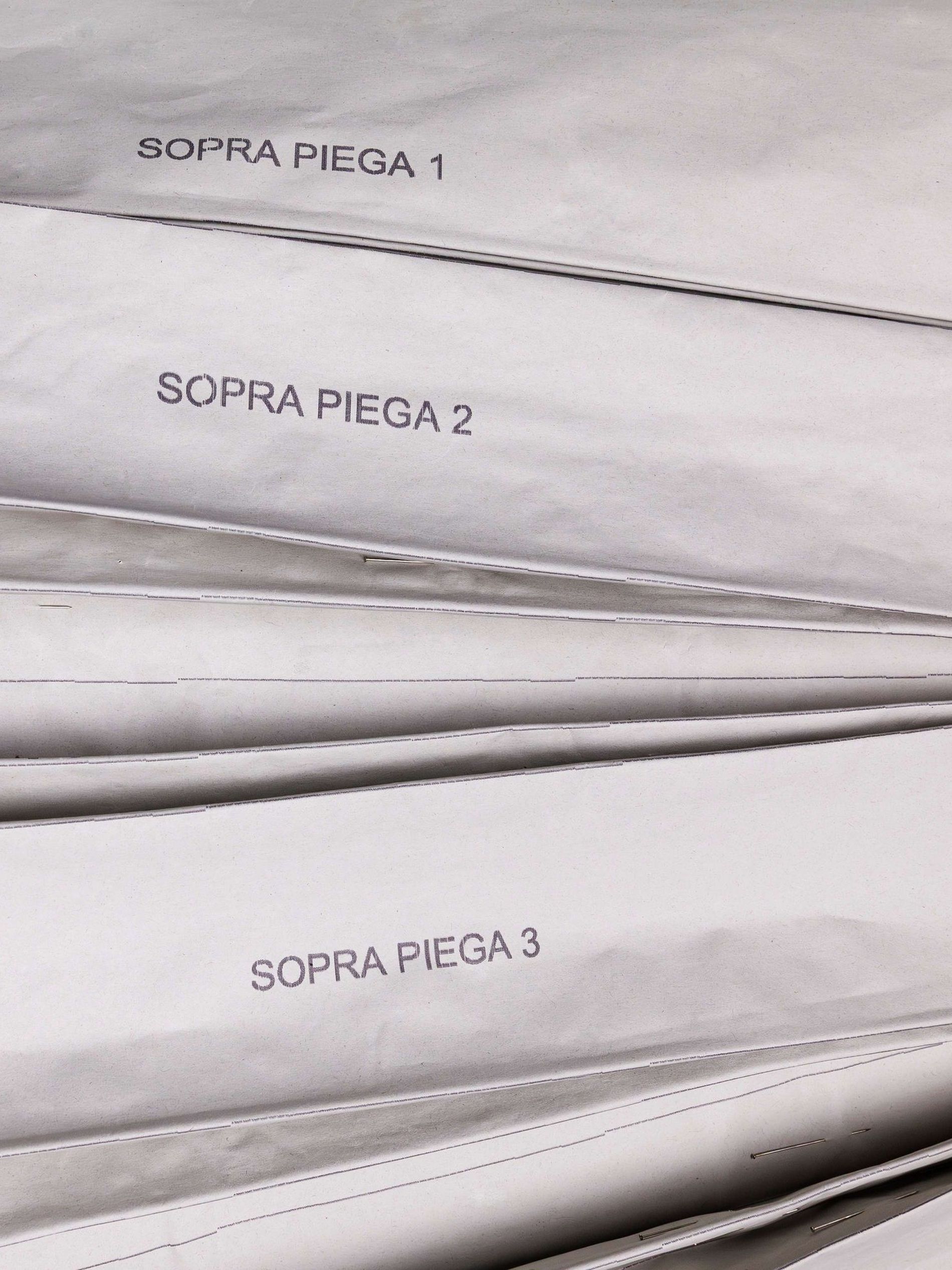 Look 8 began, as all Prada garments do, on the mannequin. Developed first through draping before being resolved through extensive pattern cutting, the skirt brings together fabrics with very different weights and behaviours. At the front, a duchesse panel structured with individually formed flat pleats creates a controlled, almost graphic surface. At the sides, embroidered crepe introduces another register entirely: crystals are applied one by one by hand, transforming the textile to catch the light with movement srather than relying on overt embellishments.