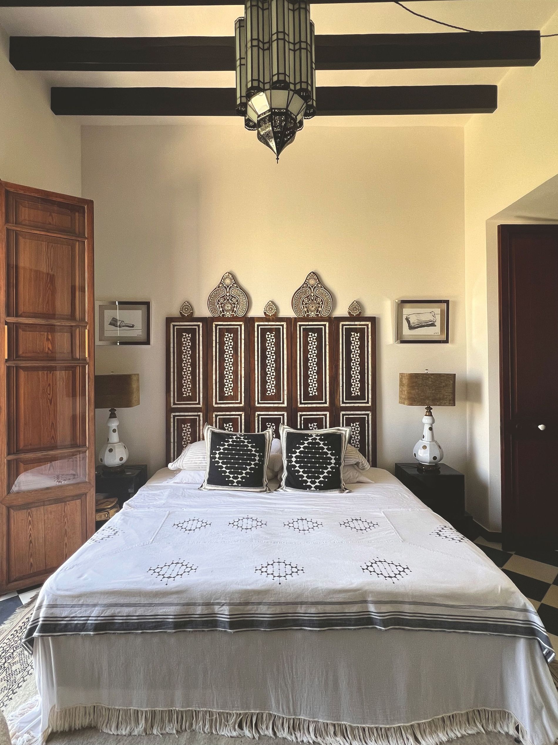 In addition to protecting the historic details, Birger also wanted to keep an authentic Mallorquín feeling. “The handmade glass lamps from the Gordiola factory add a strong sense of place,” she says. These light fixtures have been locally made since the 1700s and possess imperfections that Birger describes as particularly beautiful. “Also, for me, the combination of the original wooden double doors, inner wooden shutters, ceramic tiles – and the fabrics, cushions, and carpets – are all a tactile connection to Mallorca.”