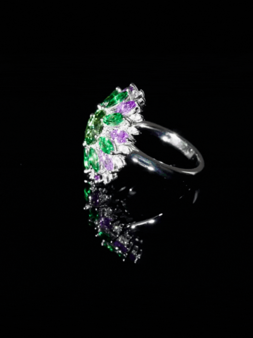 In this specific design, the green takes centre stage with a magnificent cushion-cut, vivid tourmaline at the core. Surrounding this central stone is a halo of 16 alternating marquise-cut tsavorites and lilac sapphires arranged to resemble delicate petals. “Together with the purple and the tsavorites, the piece gets such a depth,” says Bonnier. “That is also why we set it in white gold; it makes the green and the purple stronger.”