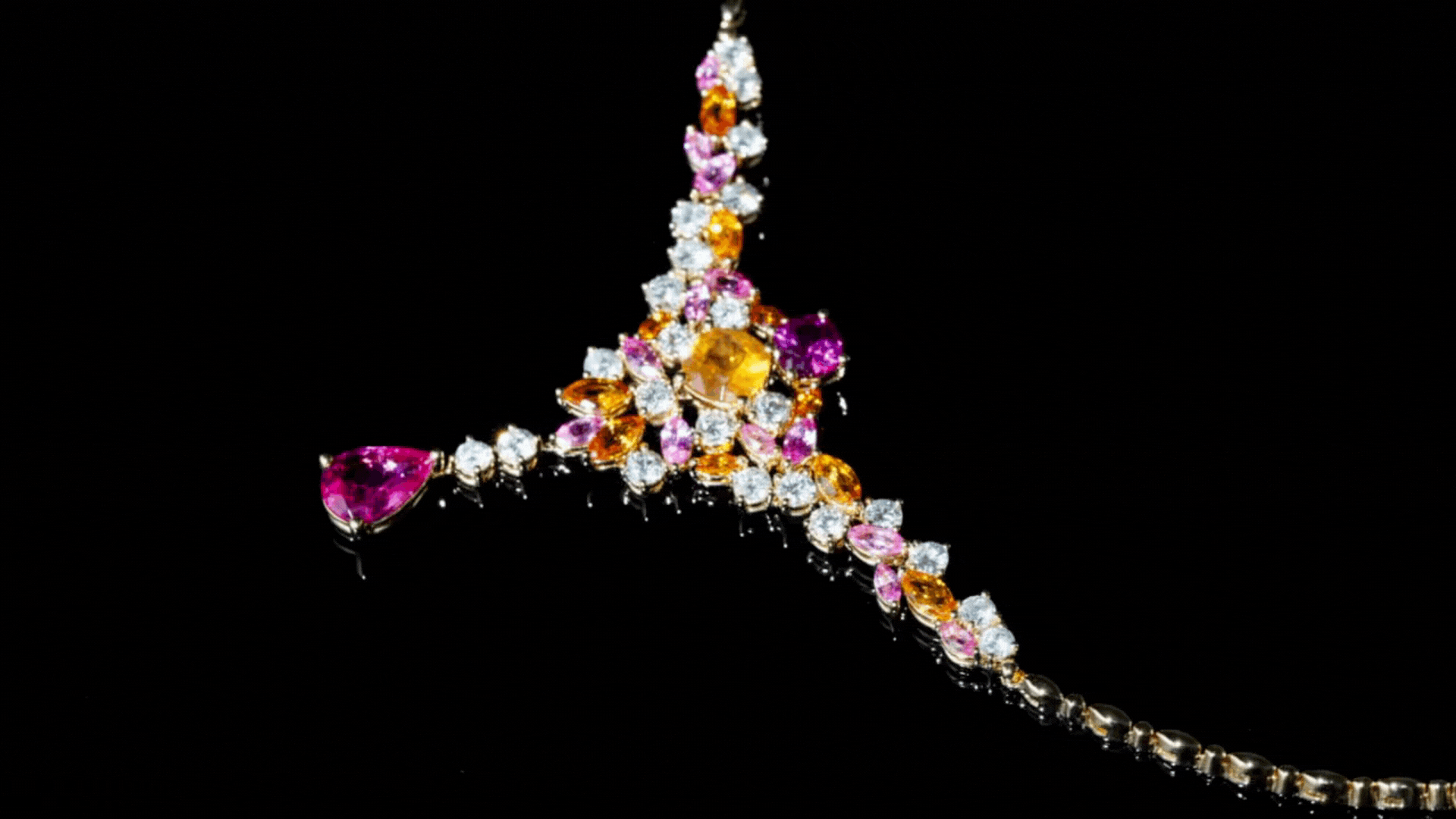 The final piece is a necklace that mirrors the palette of the second ring. Set in yellow gold, it features 13 marquise-cut pink sapphires and 10 marquise-cut orange sapphires leading toward a cushion-cut mandarin garnet and a cushion-cut pink sapphire drop. Twenty-three round brilliant-cut diamonds add lift without overtaking the colour.