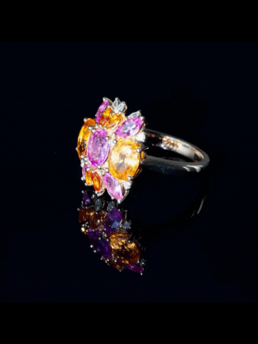 The second cocktail ring offers a softer scale and warmer tones. “In this case, we chose pink and orange stones and encased them in yellow gold,” Bonnier explains. “It gave a contrast to the other ring and brought warmth.” Three oval-cut centre stones anchor the design: a pink sapphire flanked by two mandarin garnets. Surrounding them are marquise-cut pink and orange sapphires, finished with a halo of six marquise-cut and 12 round brilliant-cut diamonds. “This ring, it's so feminine and sweet,” Bonnier says. “It’s almost like a little candy itself. And it's smaller, so maybe it's easier for people to wear.”