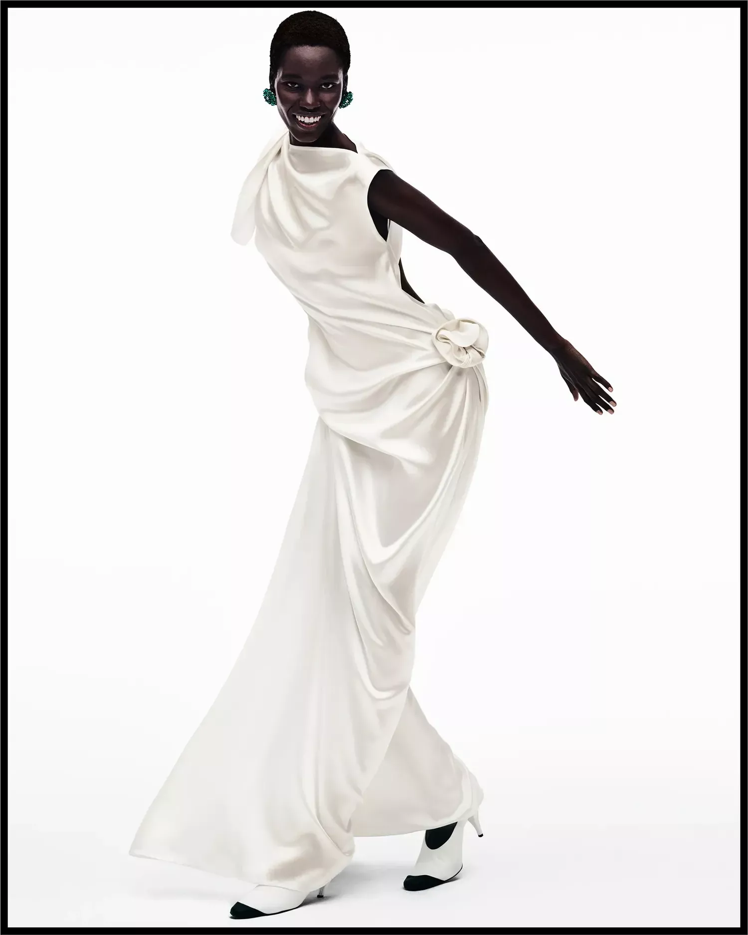 Awar Odhiang in a Blazy dress that hearkens back to the house’s early-20th-century origin story. Fashion Editor: Amanda Harlech. Photographed by Rafael Pavarotti. Vogue, December 2025.