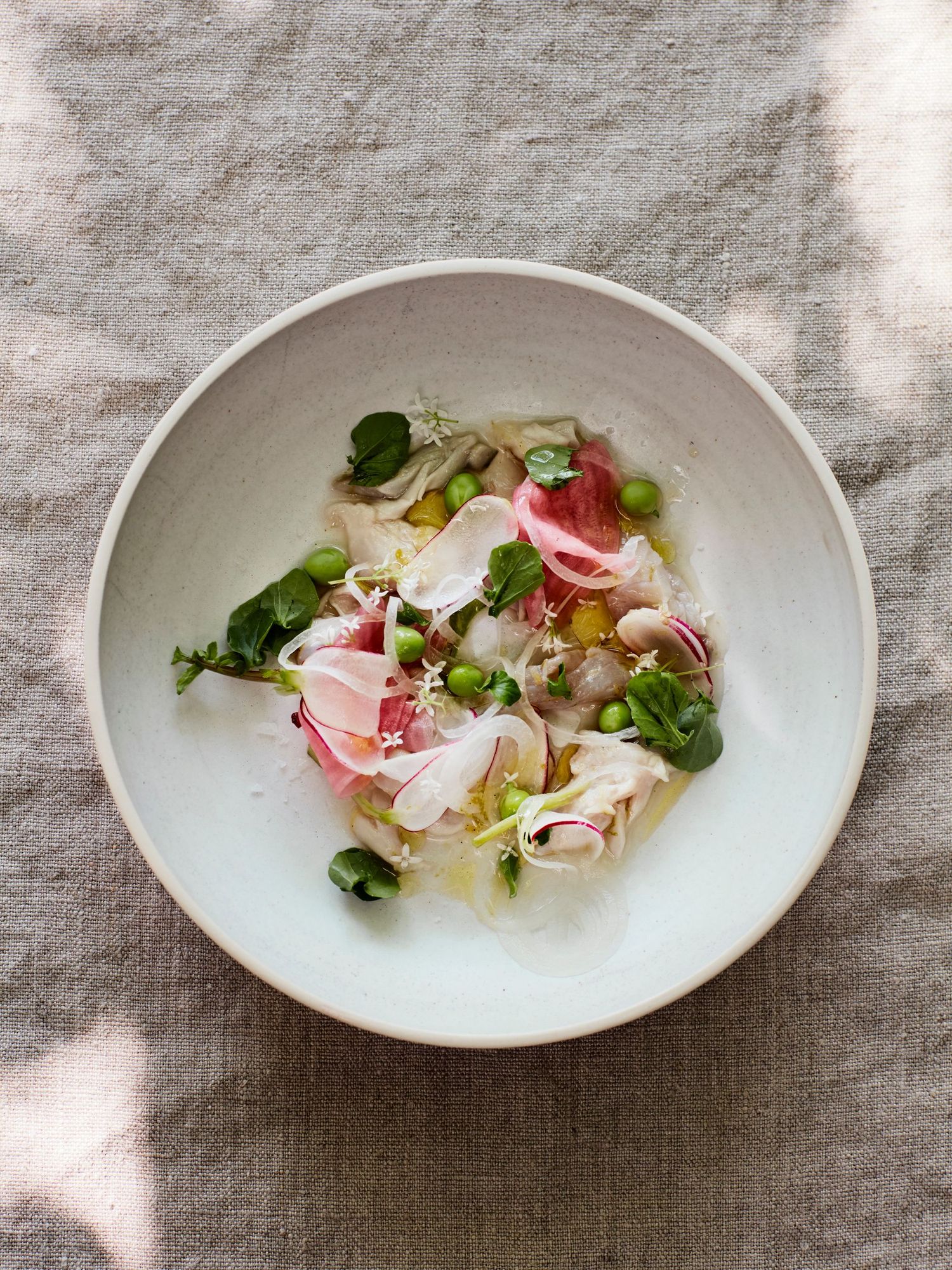Mackerel ceviche with new vegetables and elderflower