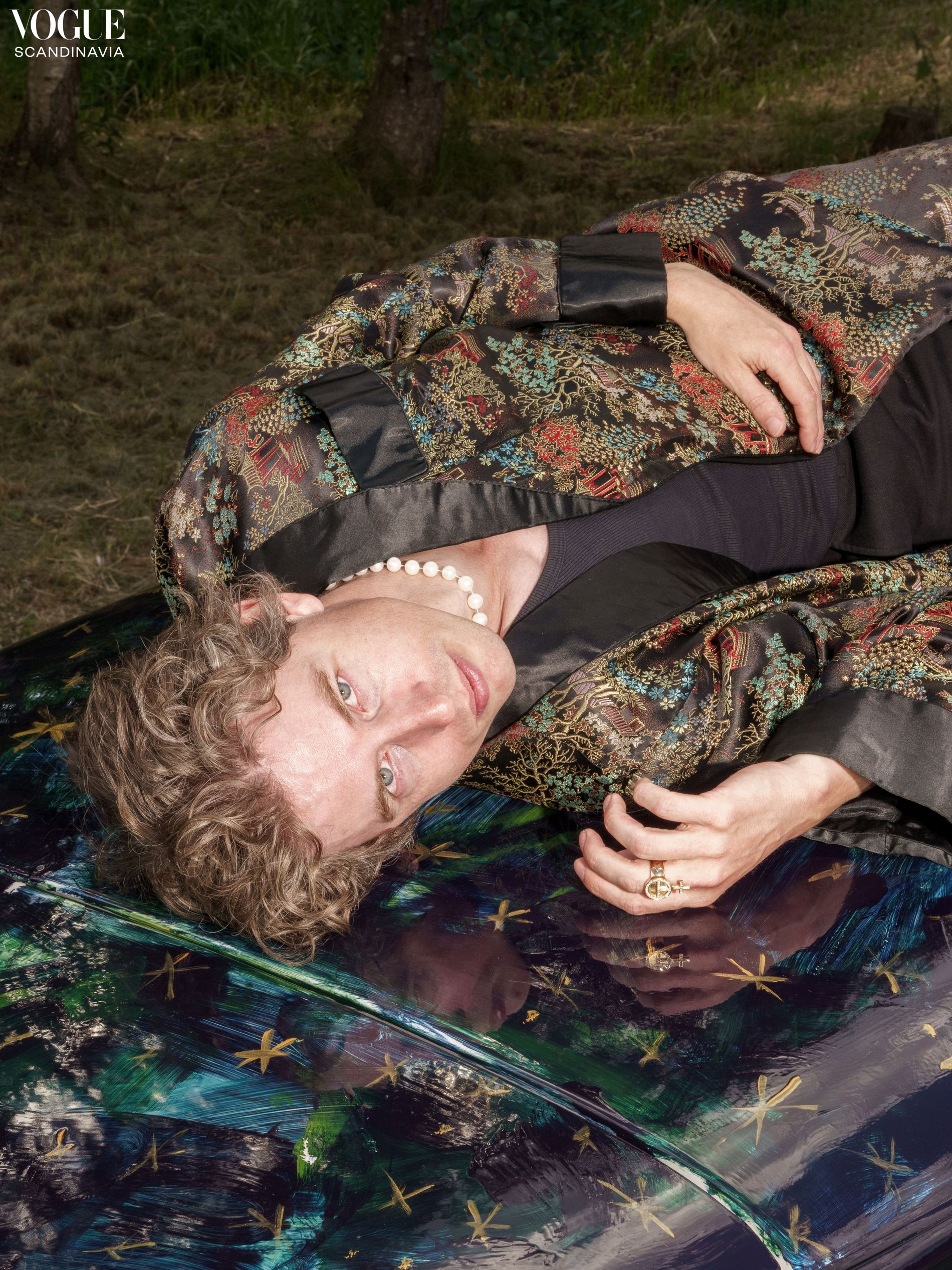 Robert enjoys the MINI’s Go-Kart mode, particularly due to its punchy sound effects. Silk coat. Talent’s own. Tank top, €100. CDLP. Cotton and wool trousers, €330. HOPE. Pearl necklace, Ring. Both Talent’s own. Photo: Kristian Bengtsson