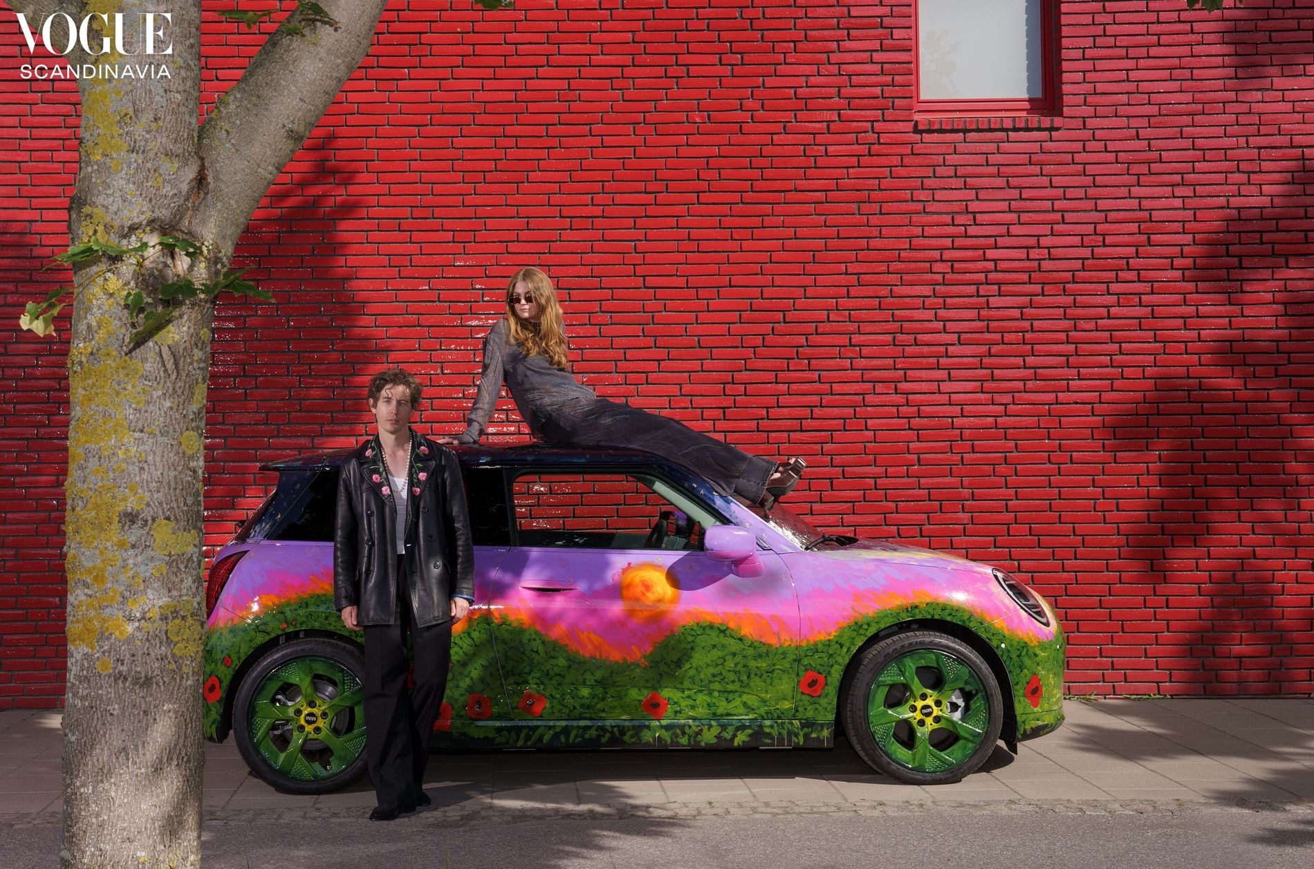 Set against a vibrant brick wall in Norra Djurgården, the car takes on a surreal quality. Madelen wears Viscose top, €200, Viscose maxi skirt, €290, Wide-leg jeans worn underneath, €280. All HOPE. Sunglasses, Platform shoes. Both Talent’s own. Robert wears Leather jacket. Talent’s own. Tank top, €100. CDLP. Cotton and wool trousers, €330. HOPE. Pearl necklace. Talent’s own. Suede loafers, €320. Morjas. Photo: Kristian Bengtsson
