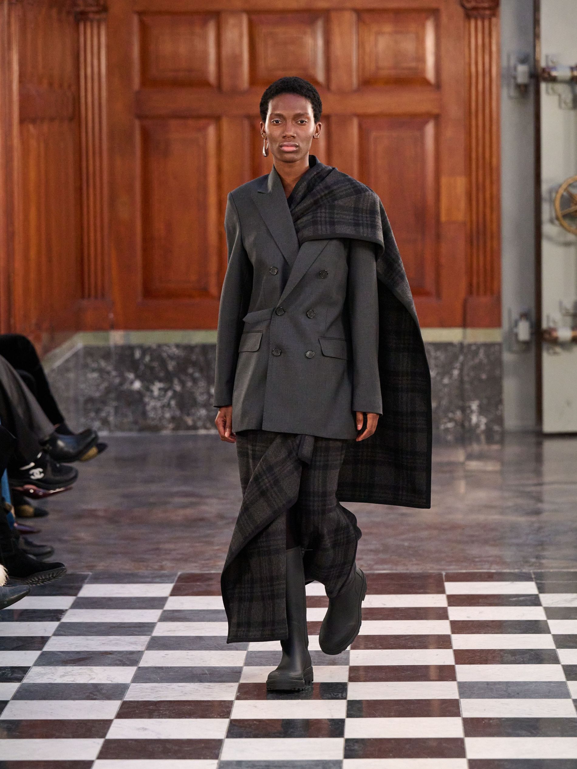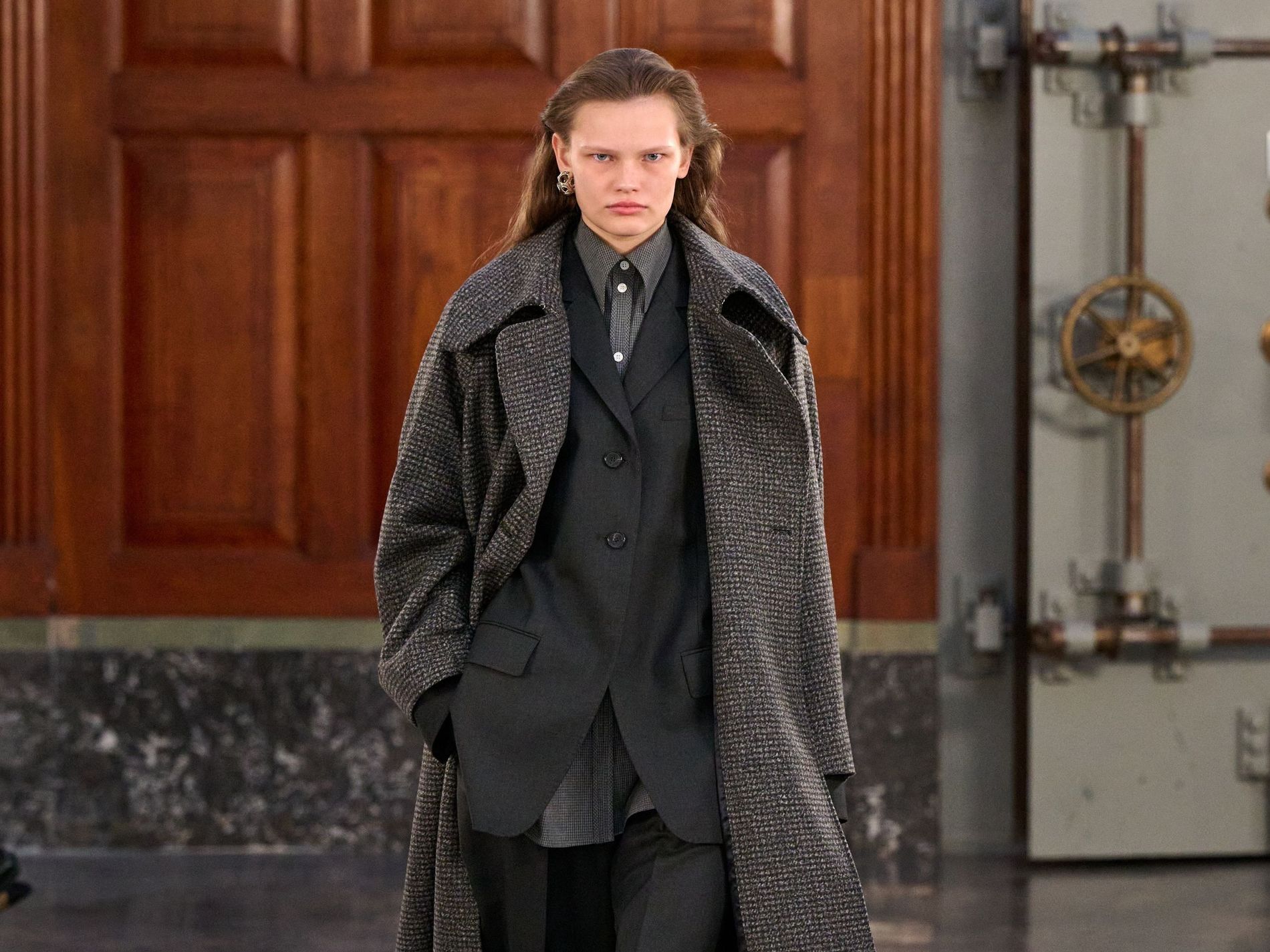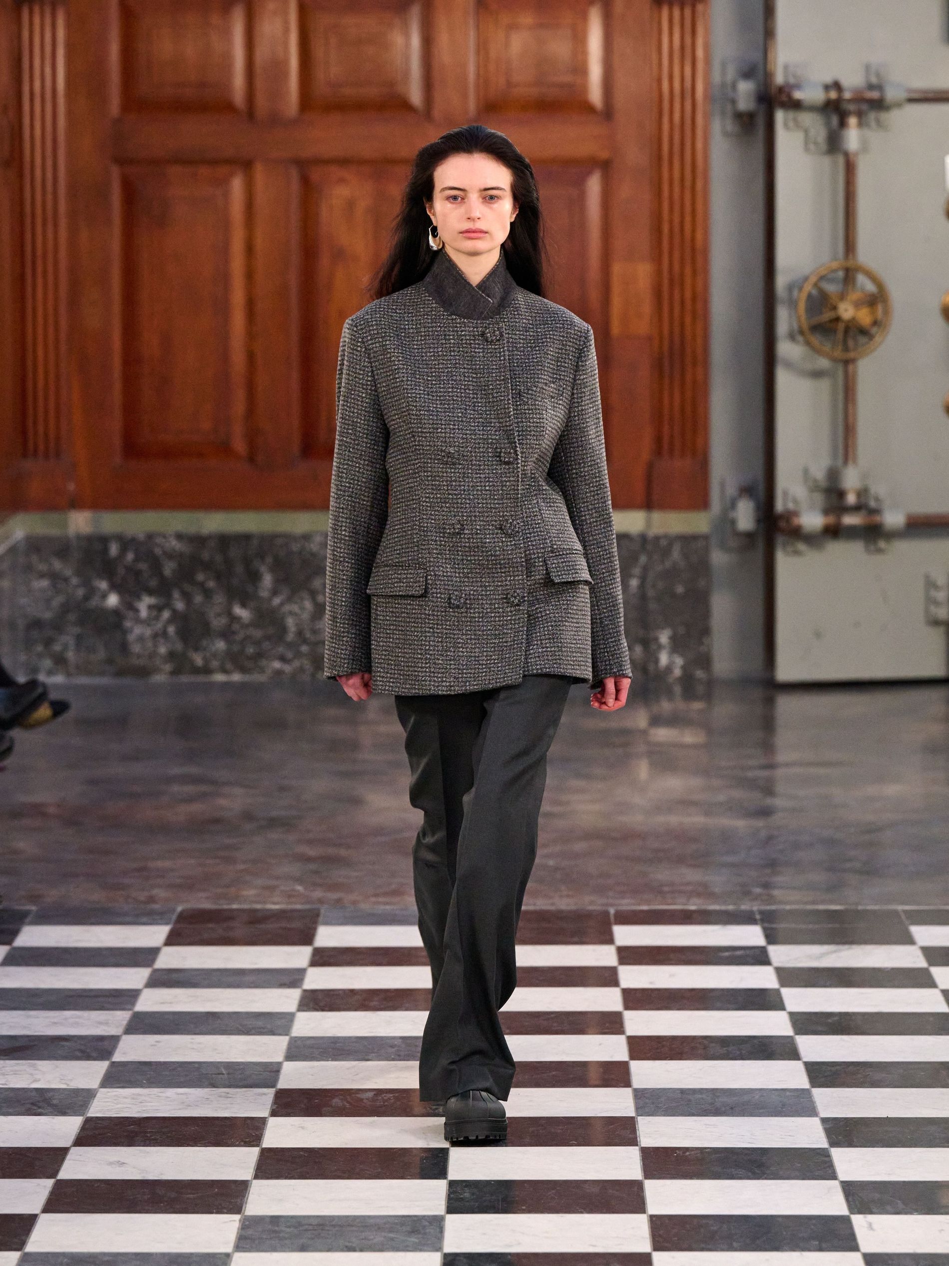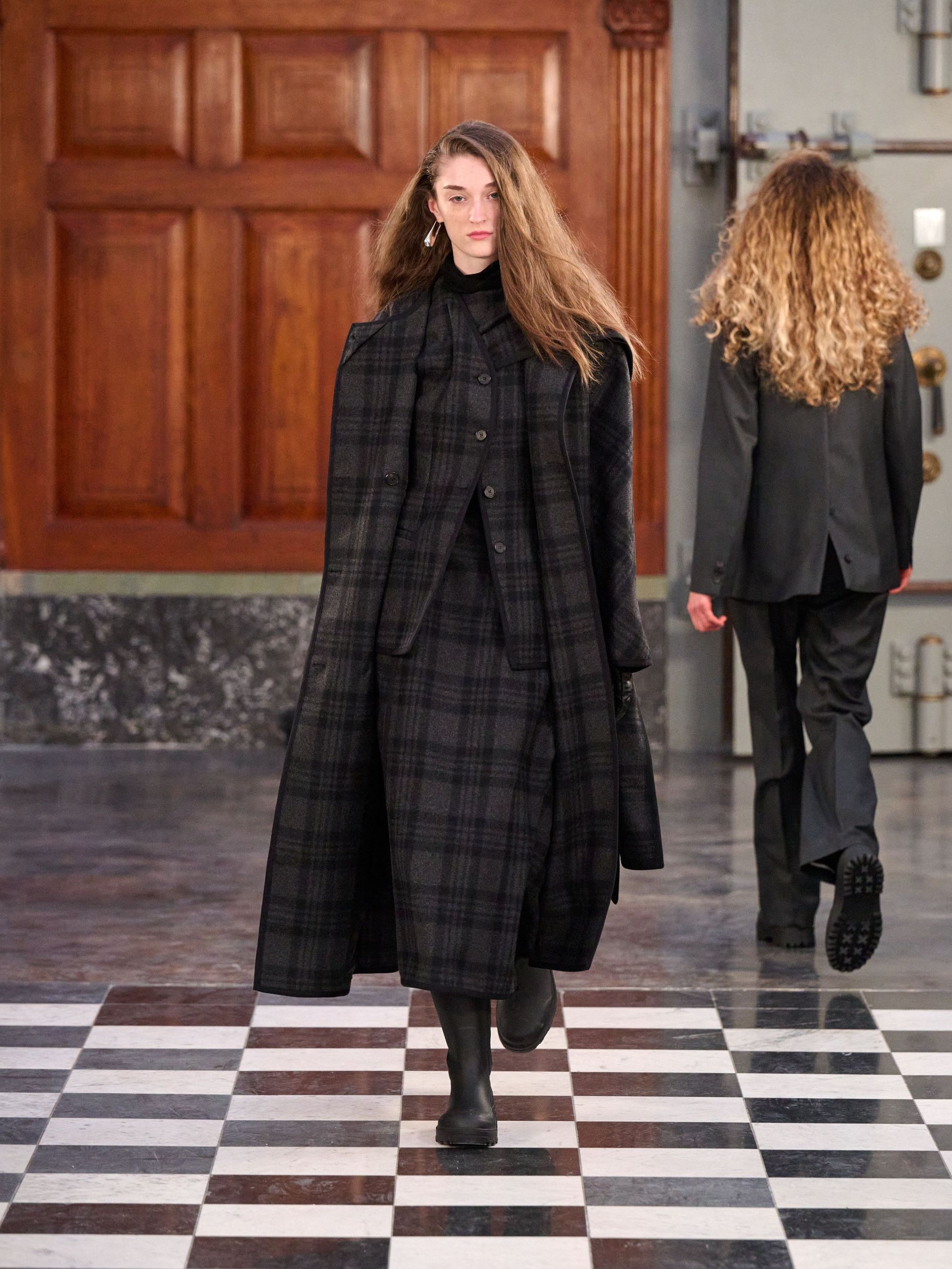 Outerwear grounded the collection with pragmatic elegance, presenting classic tartan and grey checks alongside solid blocks of black and rich praline. Waists were effortlessly defined by belts, while collars achieved generous, yet controlled, volume. Sculptural silhouettes emerged through considered shapes, offering a counterpoint to traditional rigidity. Knitwear acted as an essential anchor, with the introduction of yak fibres replacing conventional suiting in select ensembles, layered masterfully with jackets and delicate sheer organza for an elevated finish.
