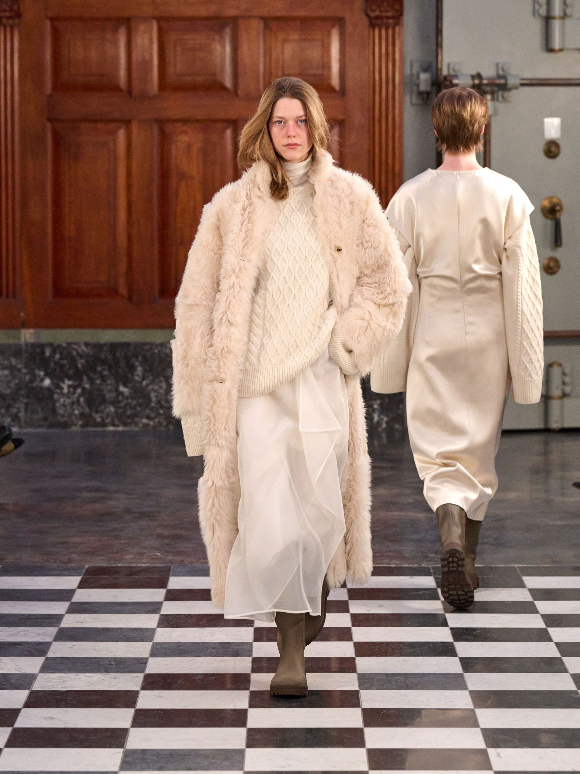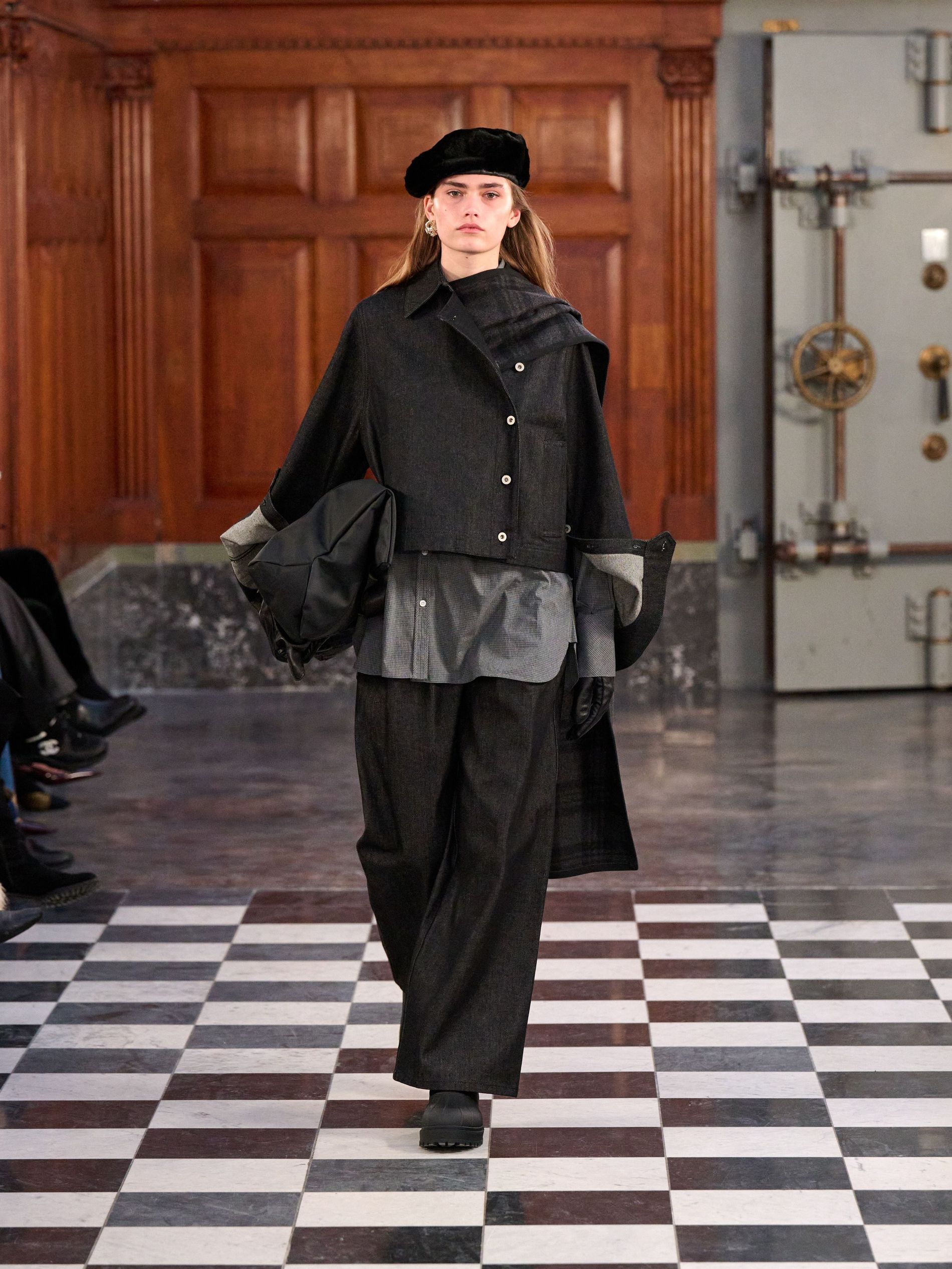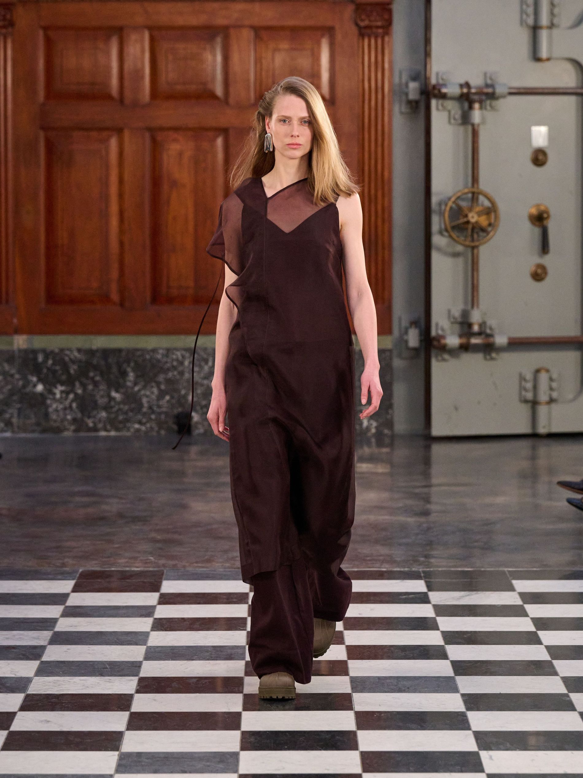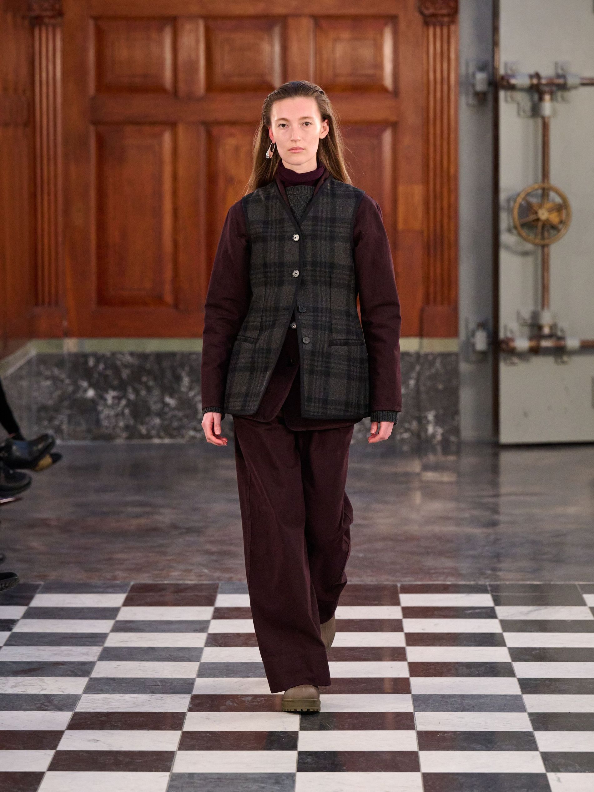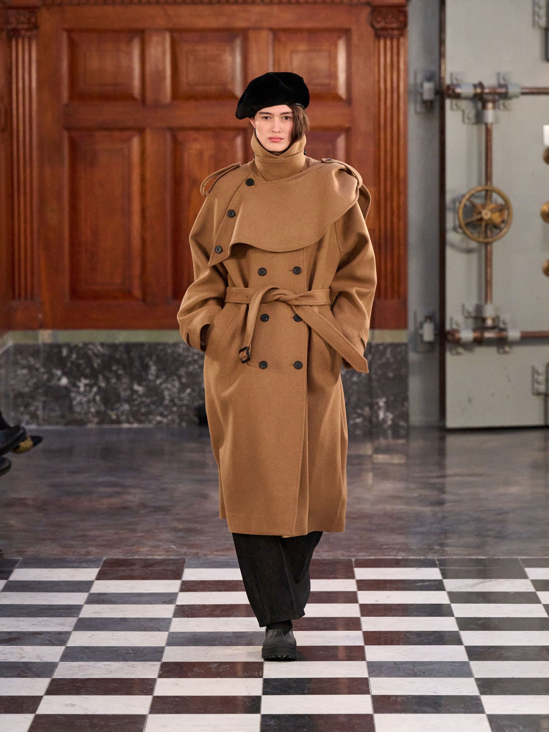 Outerwear grounded the collection with pragmatic elegance, presenting classic tartan and grey checks alongside solid blocks of black and rich praline. Waists were effortlessly defined by belts, while collars achieved generous, yet controlled, volume. Sculptural silhouettes emerged through considered shapes, offering a counterpoint to traditional rigidity. Knitwear acted as an essential anchor, with the introduction of yak fibres replacing conventional suiting in select ensembles, layered masterfully with jackets and delicate sheer organza for an elevated finish.