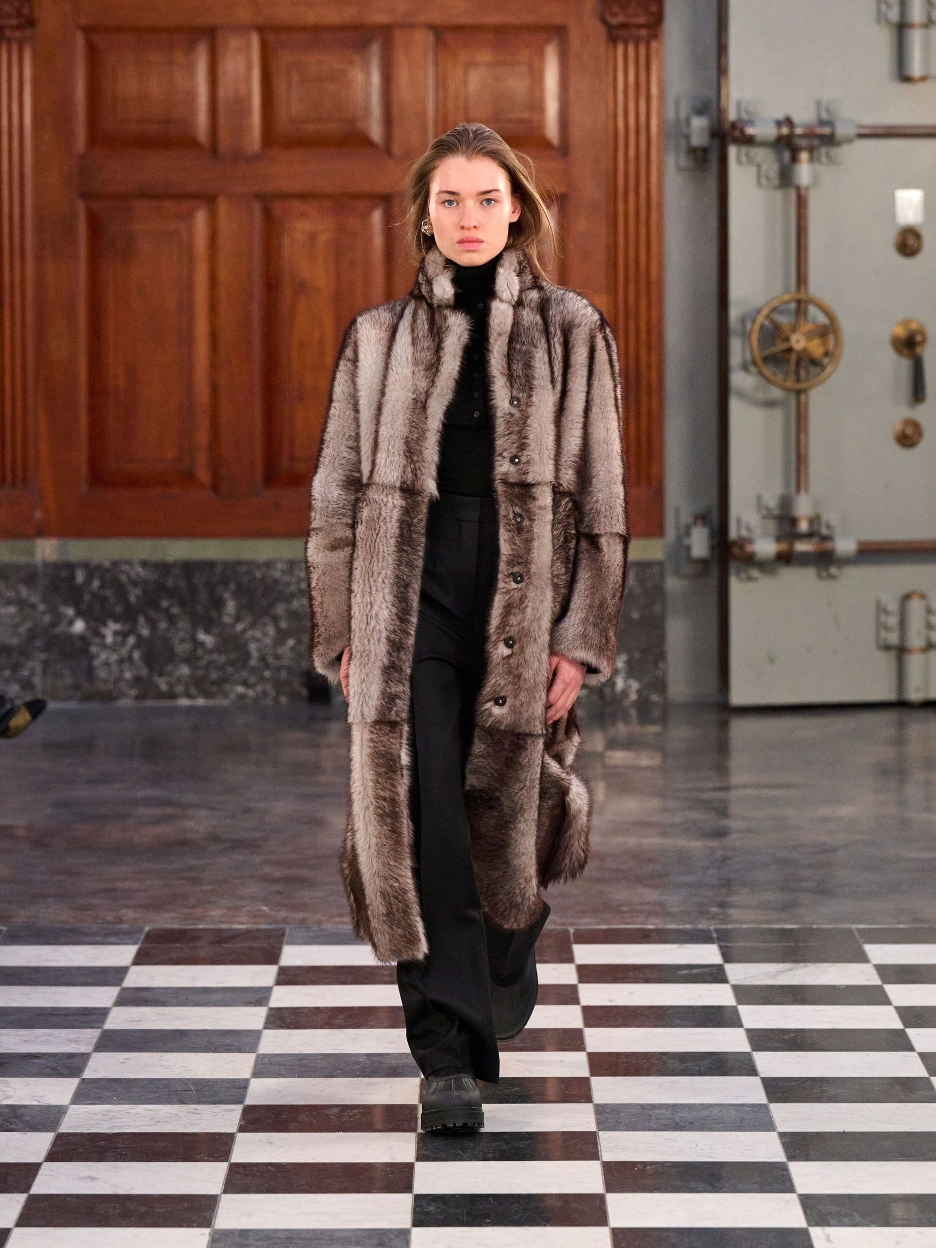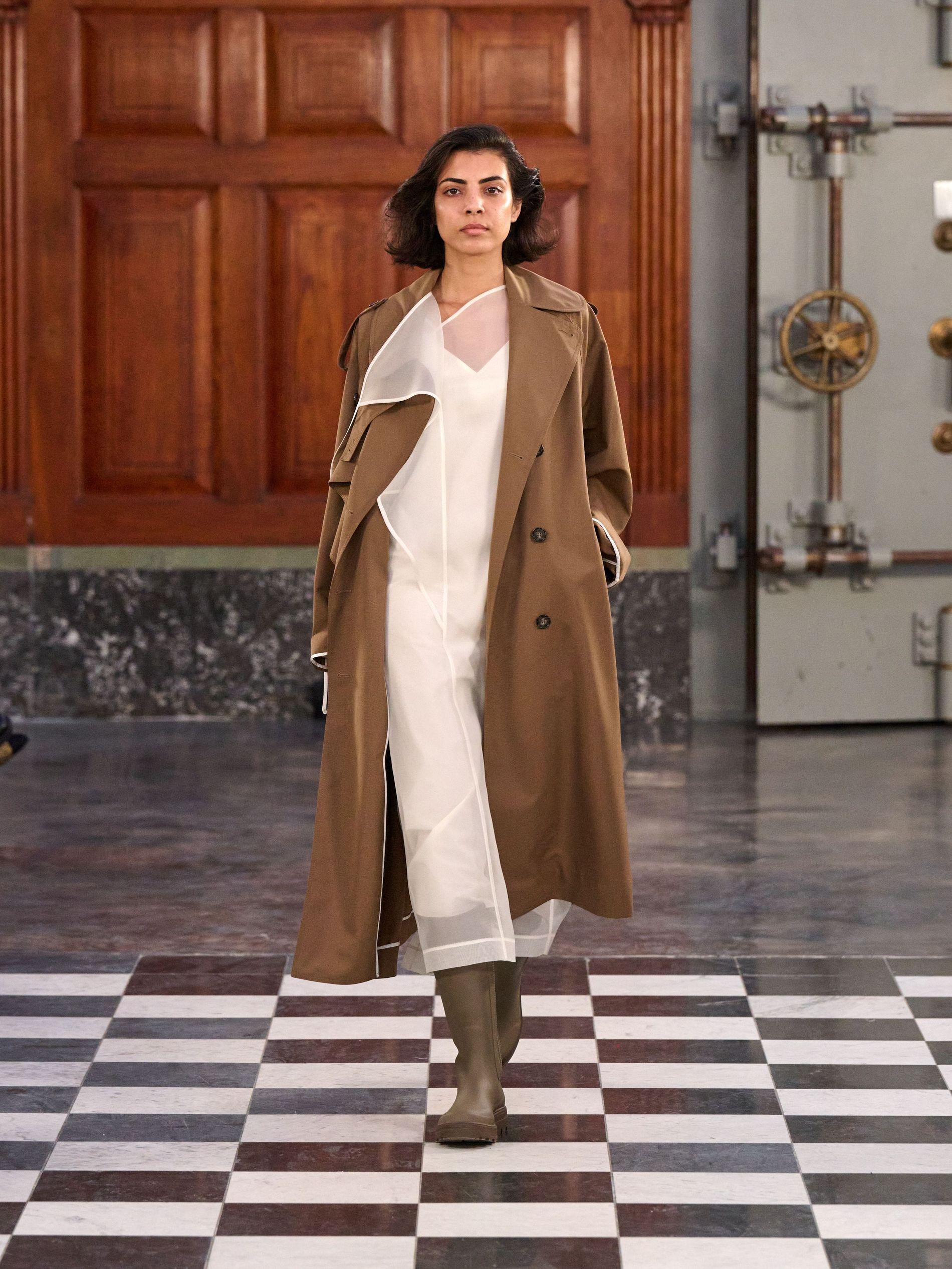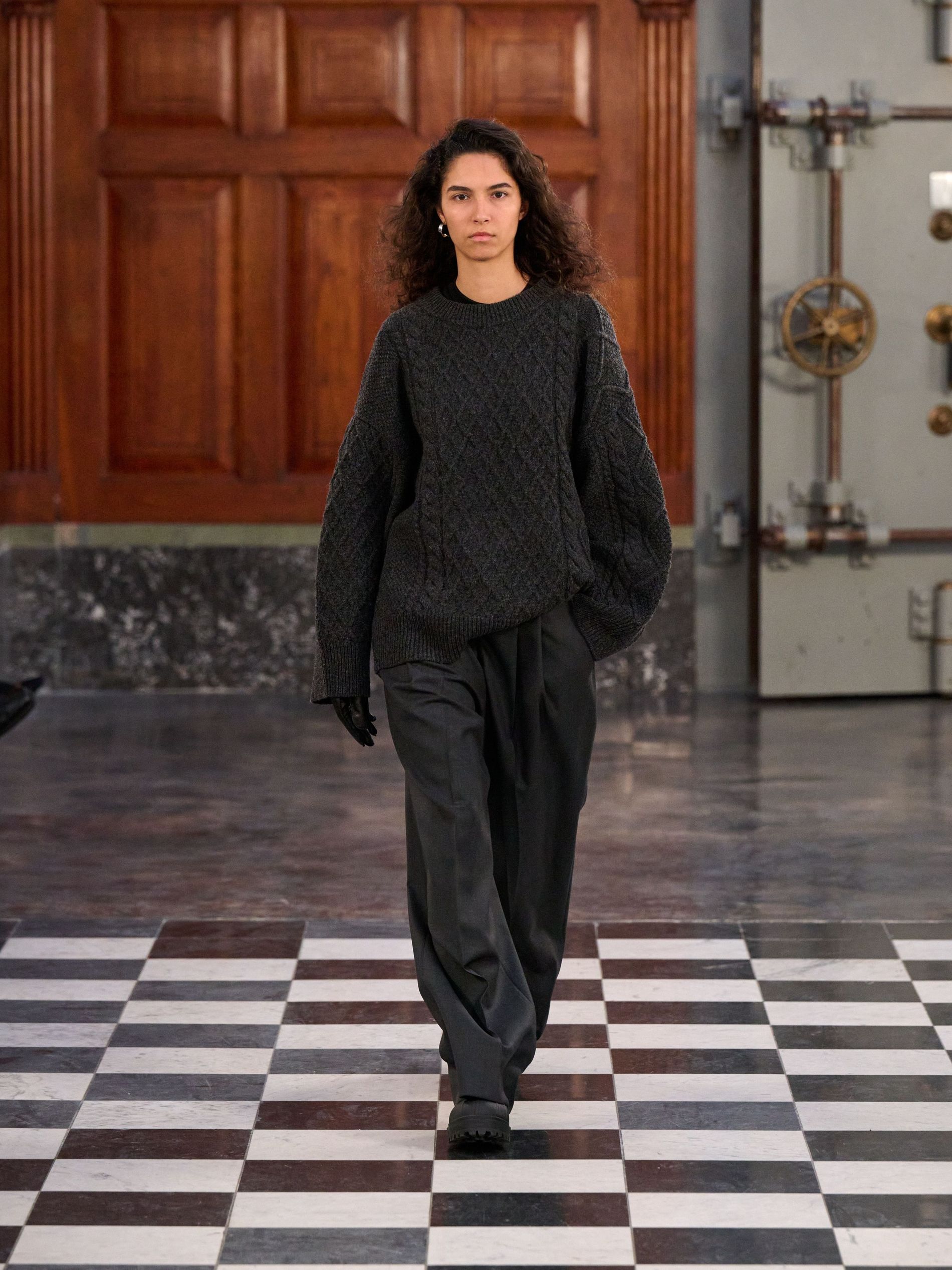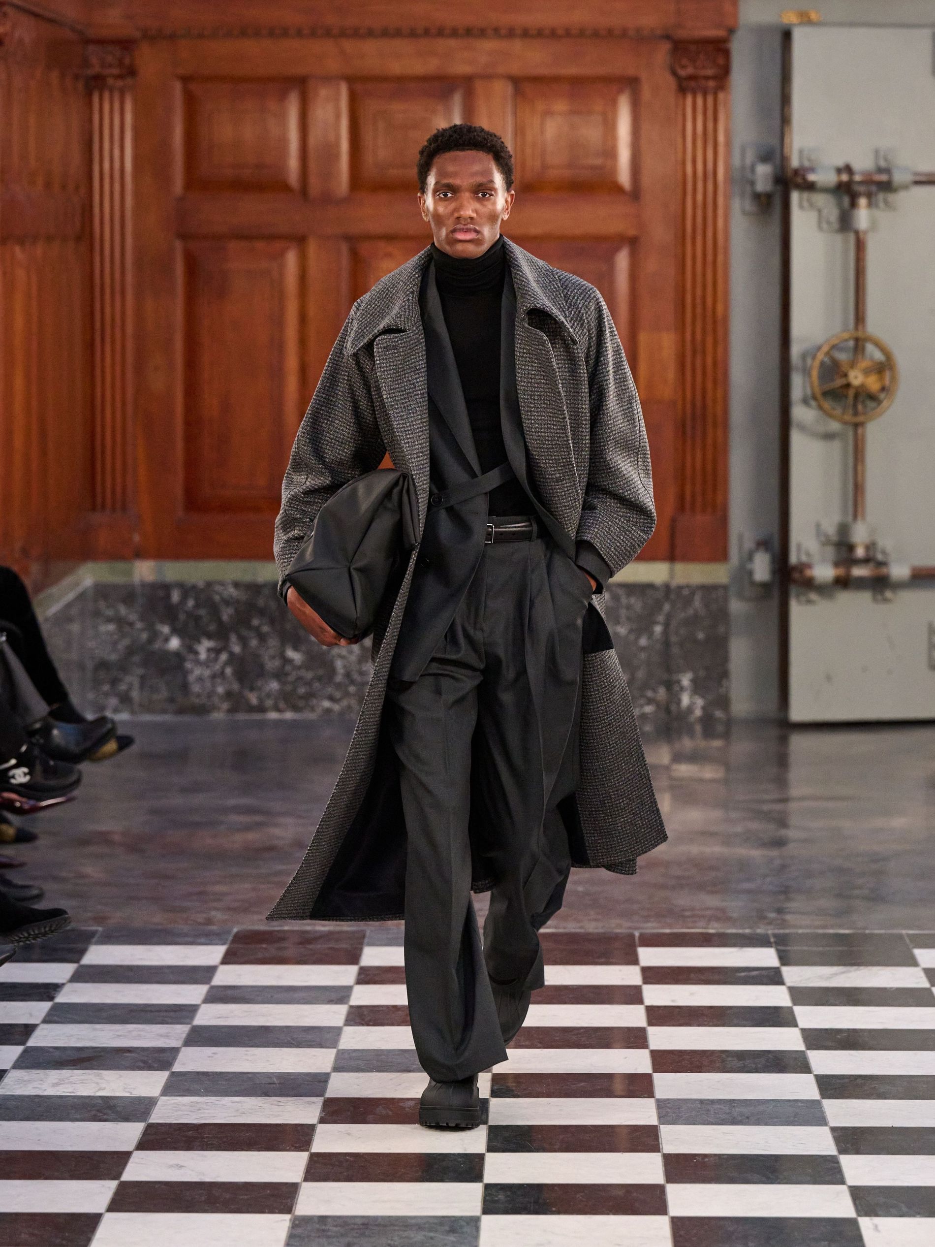 Outerwear grounded the collection with pragmatic elegance, presenting classic tartan and grey checks alongside solid blocks of black and rich praline. Waists were effortlessly defined by belts, while collars achieved generous, yet controlled, volume. Sculptural silhouettes emerged through considered shapes, offering a counterpoint to traditional rigidity. Knitwear acted as an essential anchor, with the introduction of yak fibres replacing conventional suiting in select ensembles, layered masterfully with jackets and delicate sheer organza for an elevated finish.