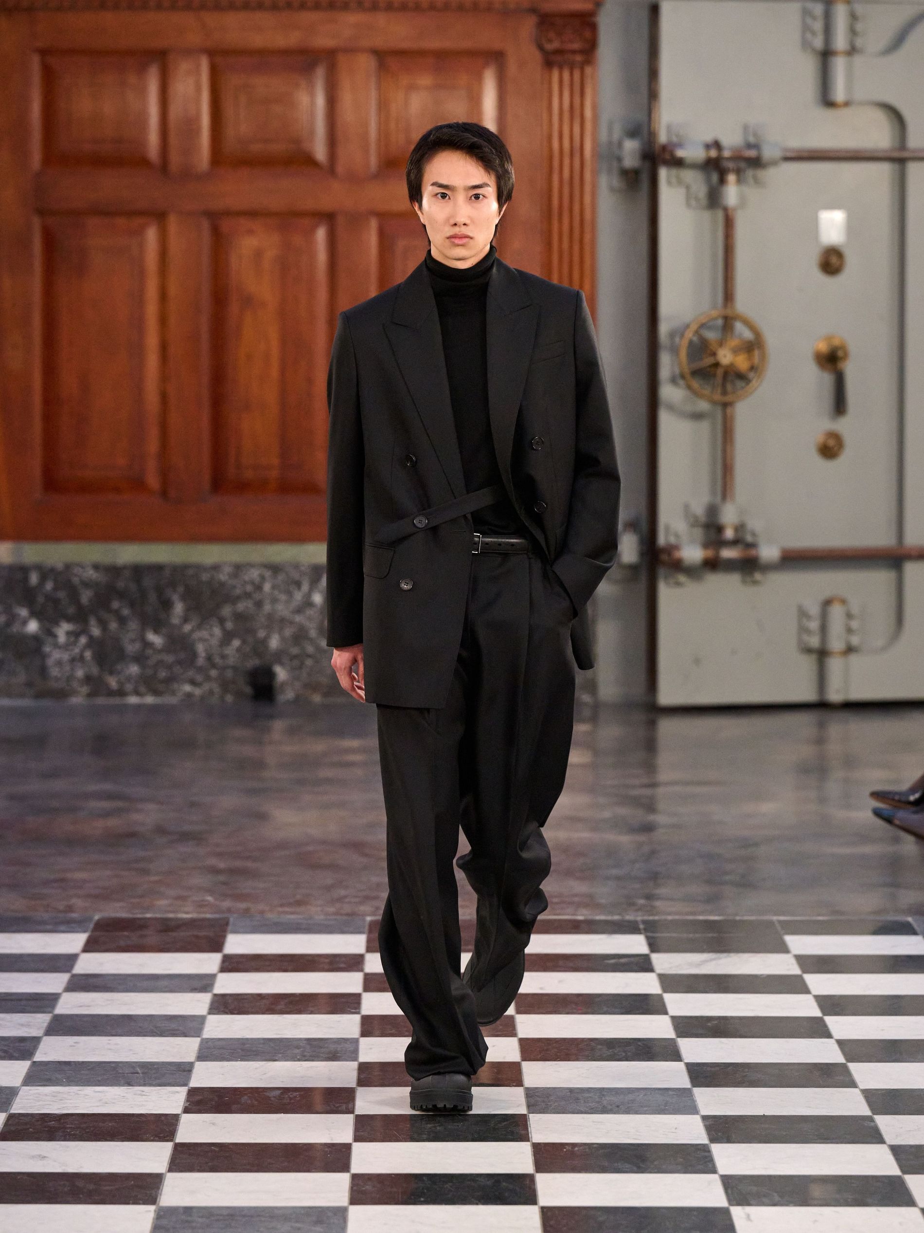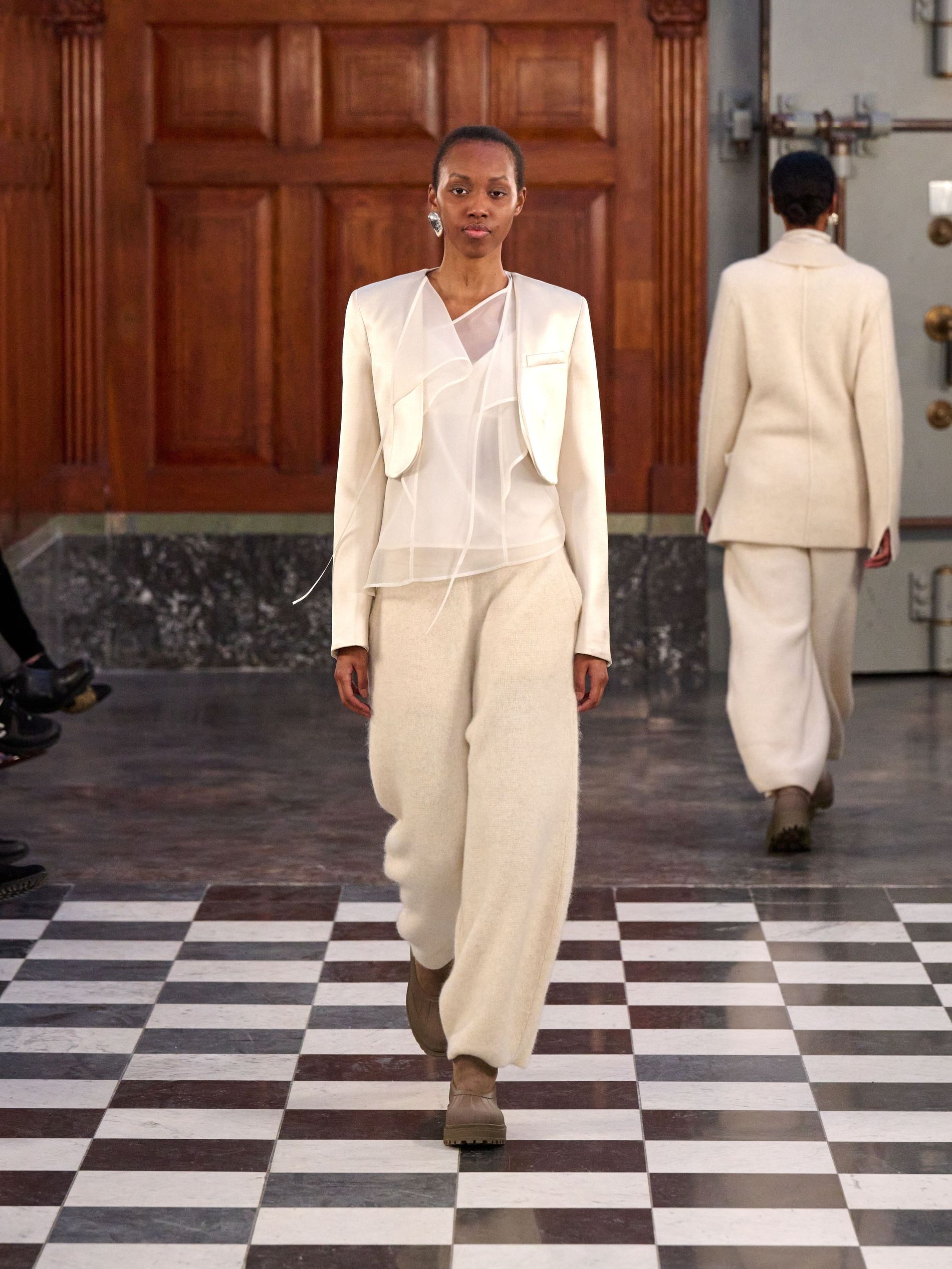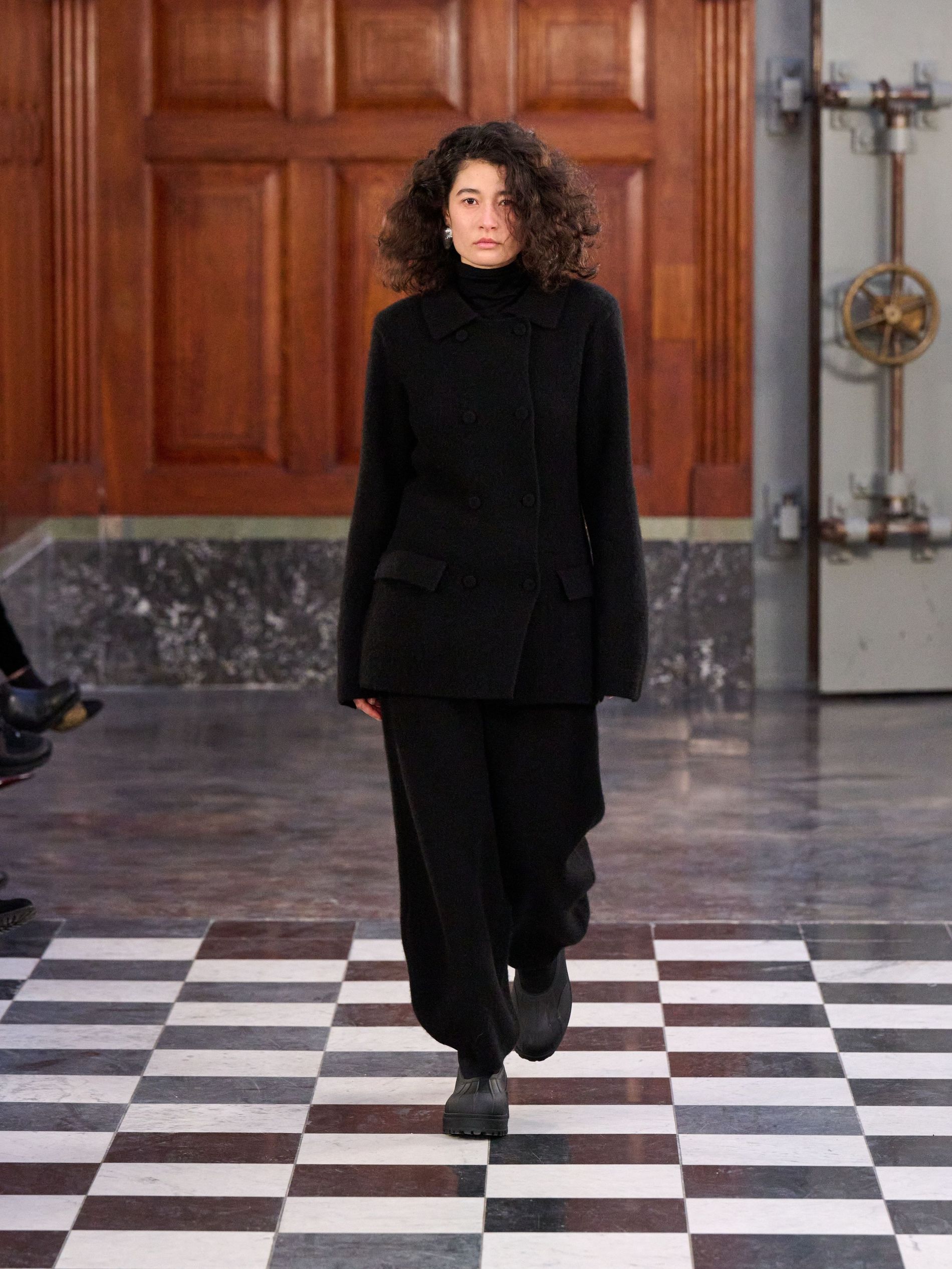 The expected central code of MKDT tailoring was certainly present, yet for autumn/winter '26, it felt imbued with a welcome softness. Double-breasted blazers, often layered over high-neck knits, maintained their sharpness through considered proportion rather than rigid structure. Tailored trousers fell with a relaxed, straight grace, moving seamlessly with the wearer. The overarching approach saw corners rounded, proportions elongated, and a subtle play with asymmetry, ensuring the garments worked with the body.