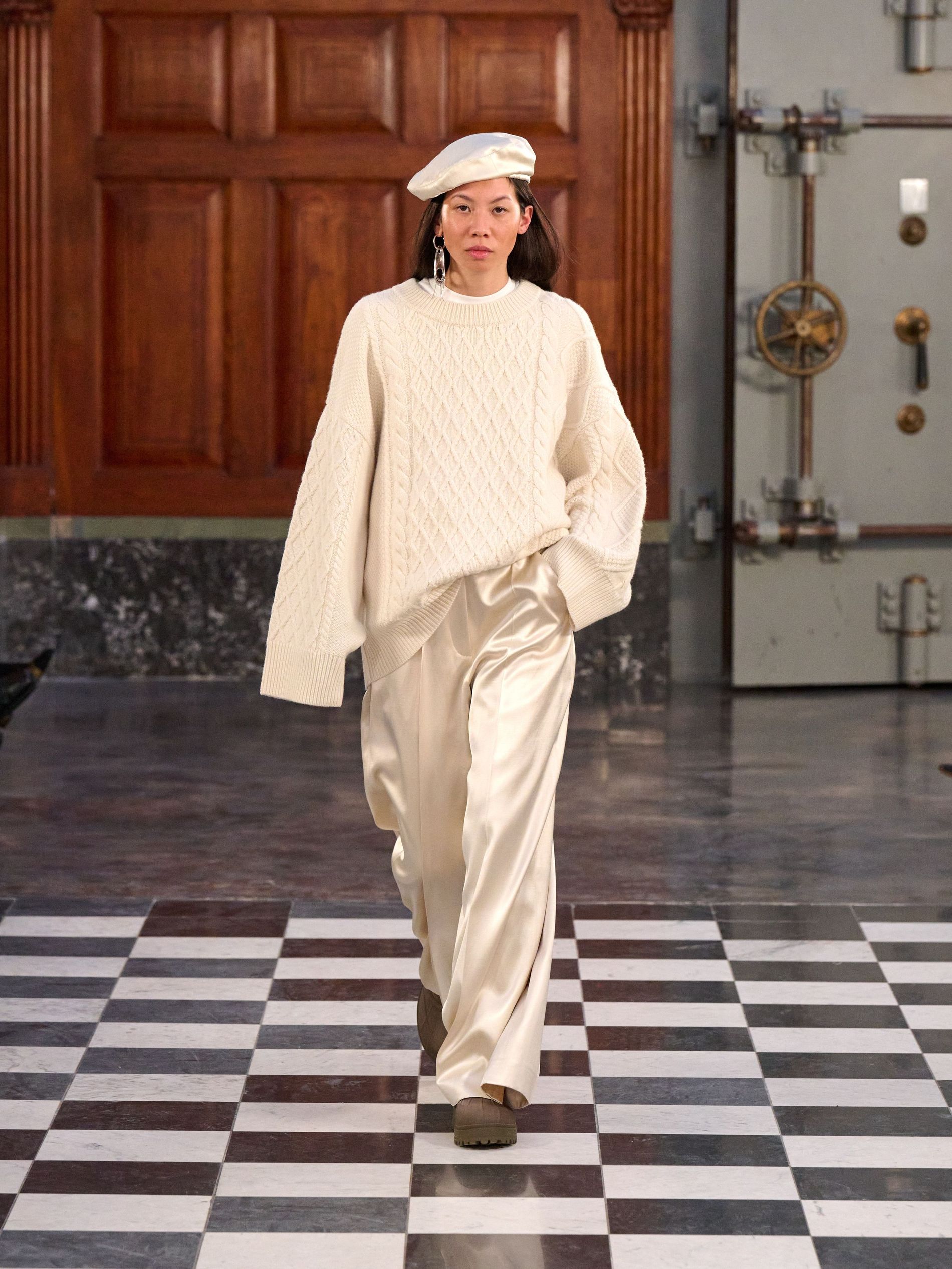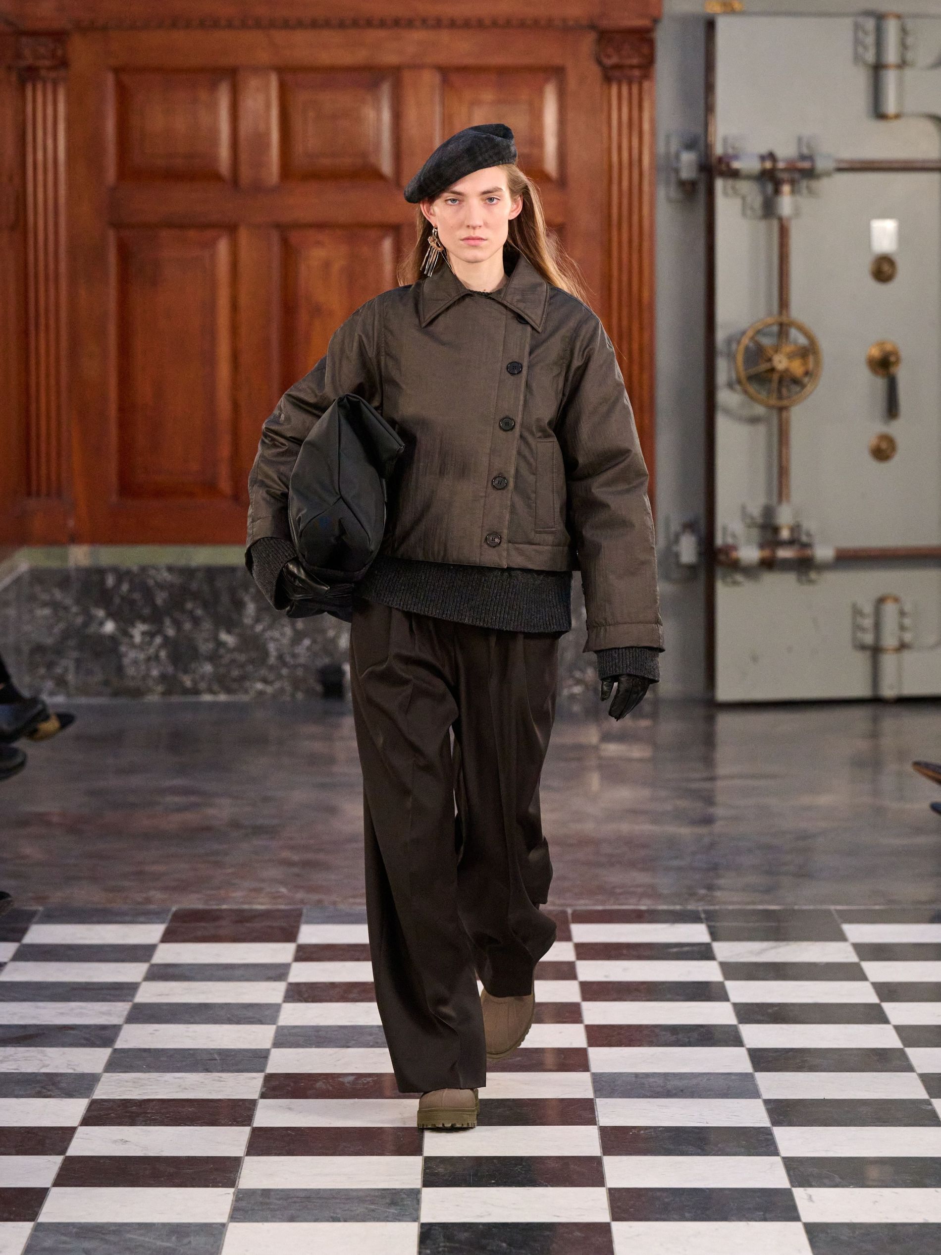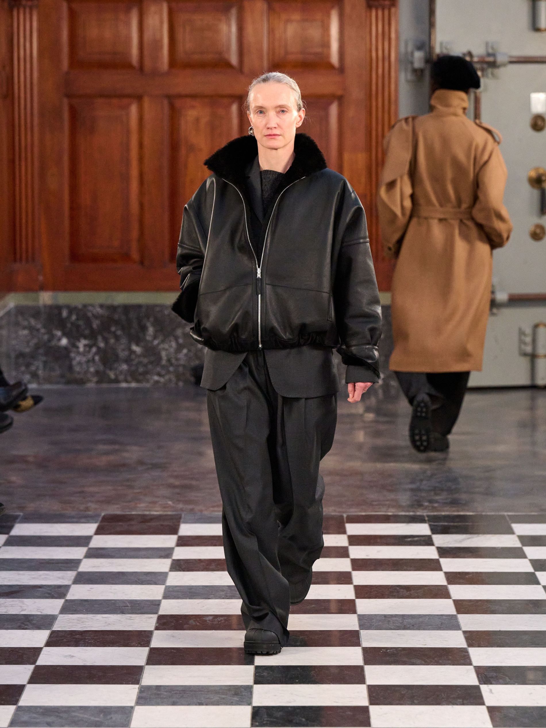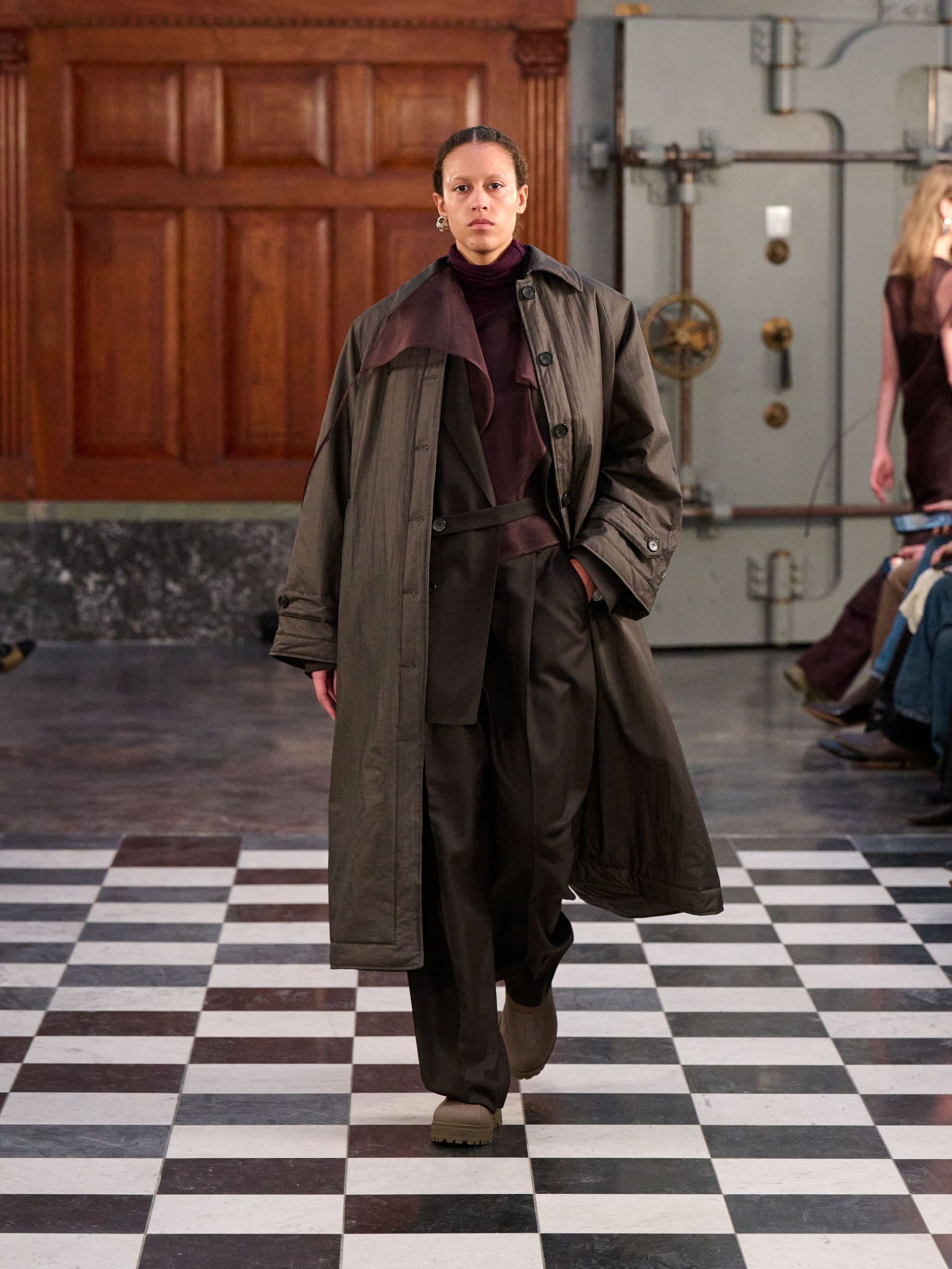 The expected central code of MKDT tailoring was certainly present, yet for autumn/winter '26, it felt imbued with a welcome softness. Double-breasted blazers, often layered over high-neck knits, maintained their sharpness through considered proportion rather than rigid structure. Tailored trousers fell with a relaxed, straight grace, moving seamlessly with the wearer. The overarching approach saw corners rounded, proportions elongated, and a subtle play with asymmetry, ensuring the garments worked with the body.