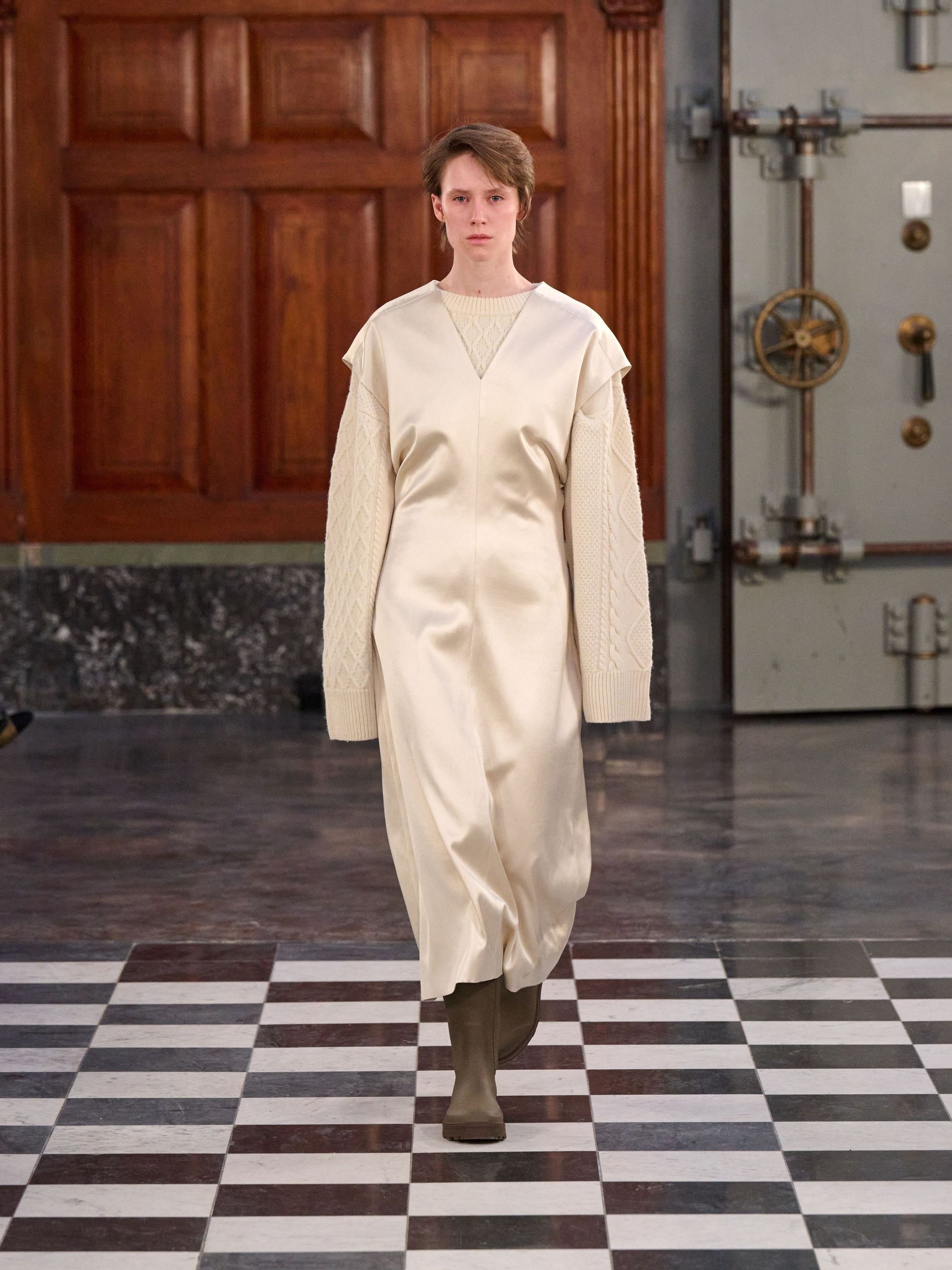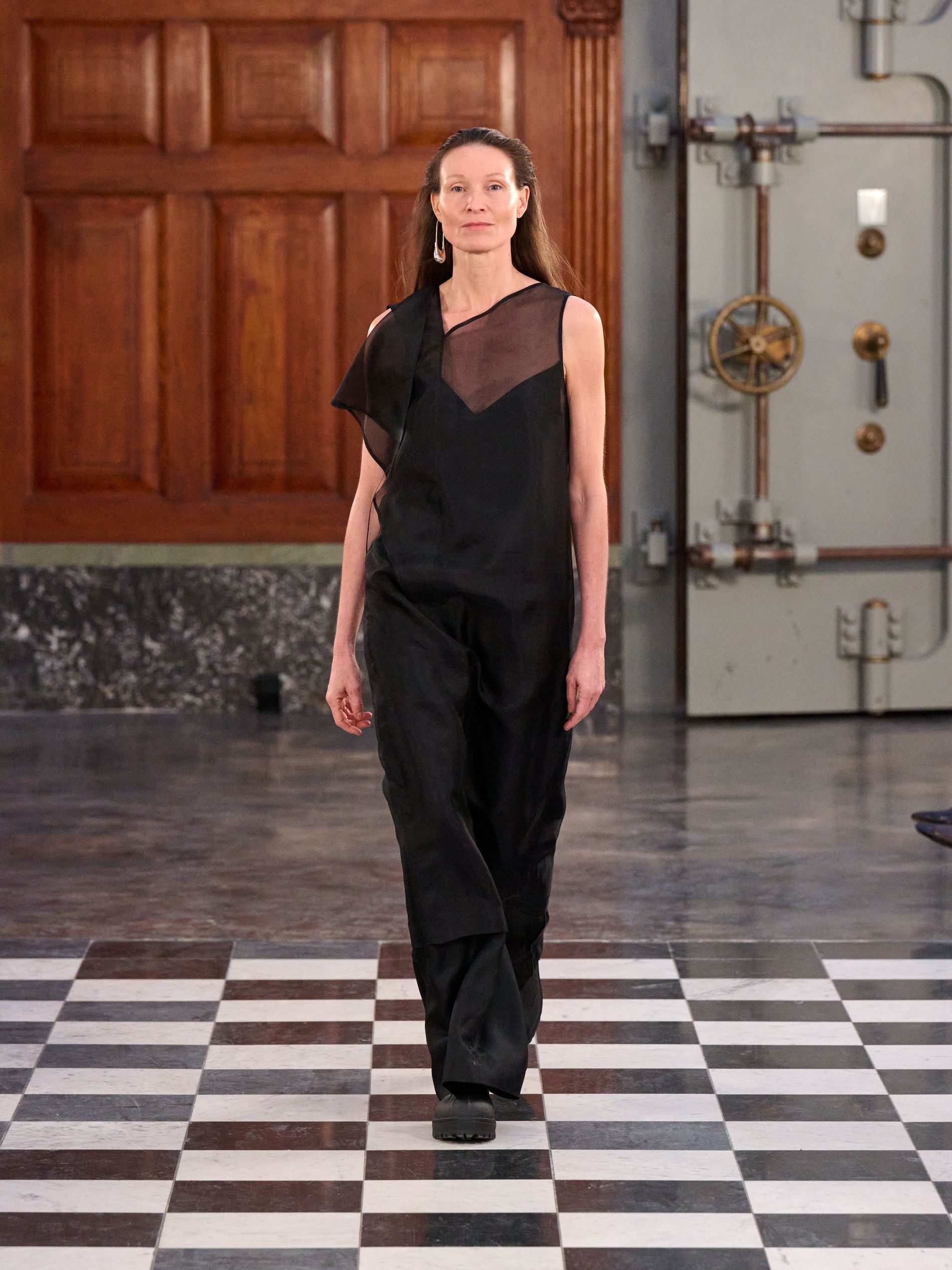 The introduction of dresses added lift to the entire collection. Sheer black and ivory styles, often layered over trousers, utilised mixed materials to create depth without sacrificing lightness. Asymmetry, once again, translucence, and soft draping subtly emphasised the body and positioned the dresses as integrated layers within a modern wardrobe rather than distinct, separate garments.