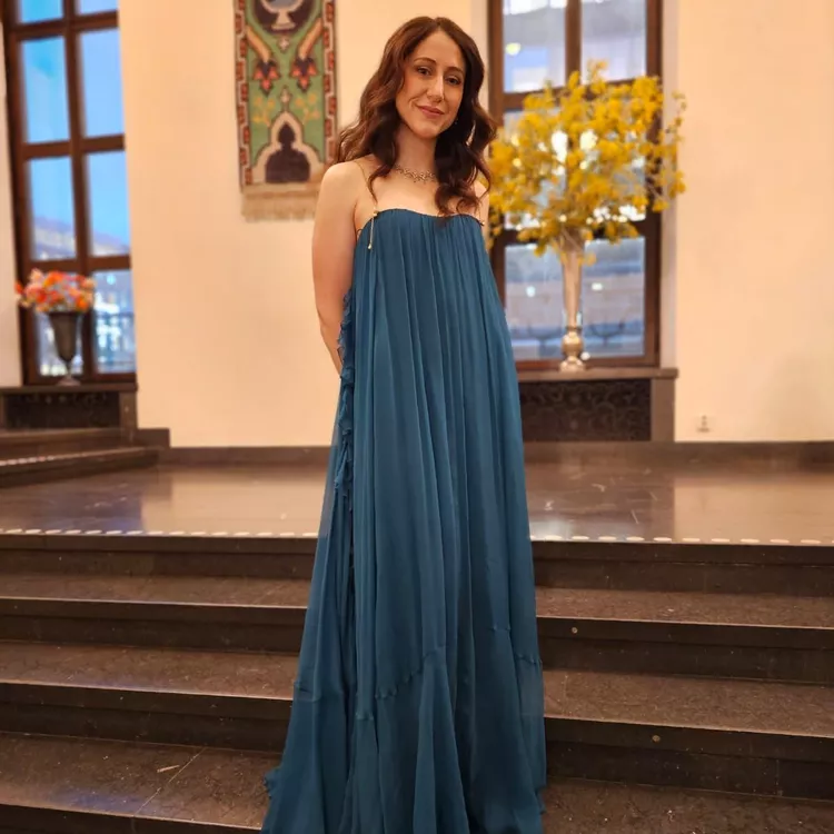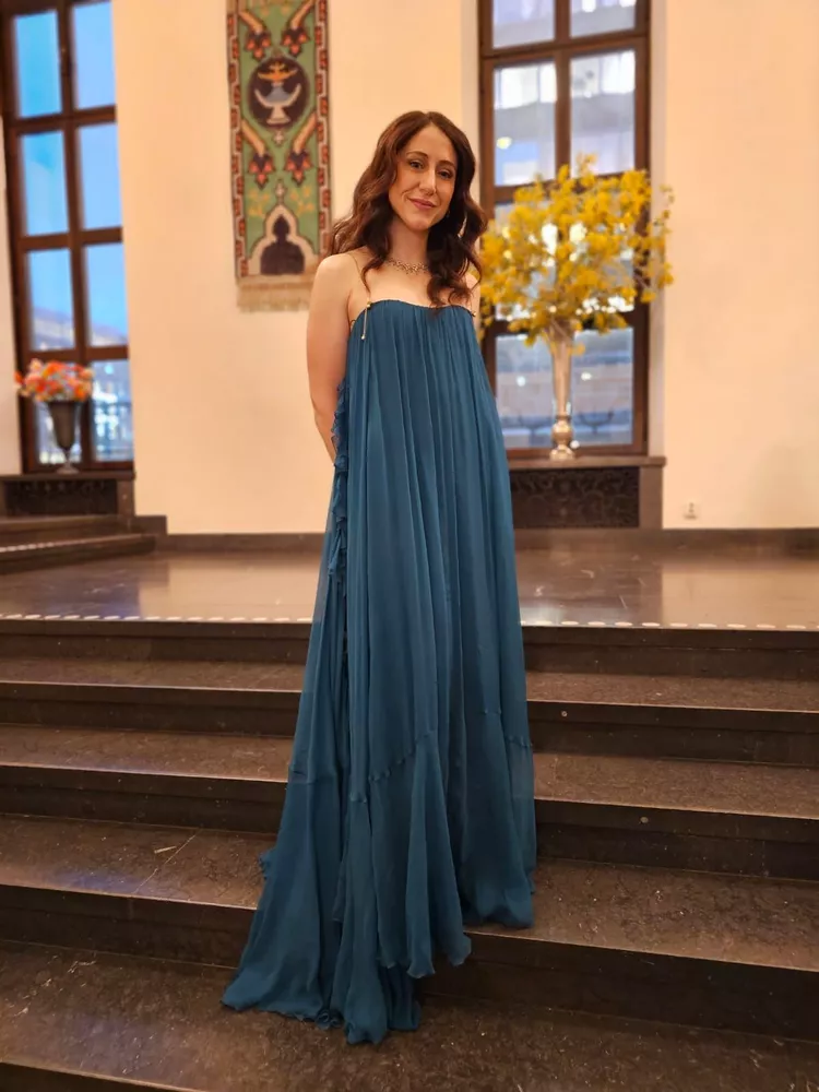 The gown she wore was from the brand’s SS26 collection: a rich teal, asymmetrical, ruffled silk crepe gown finished with gold embellishments. “I am so thankful to Chemena and Emily [Harris, creative director of See by Chloé] who have made all of this happen,” she adds. “To be wearing Chloé is like wearing my family, and like bringing them along to celebrate today.”
