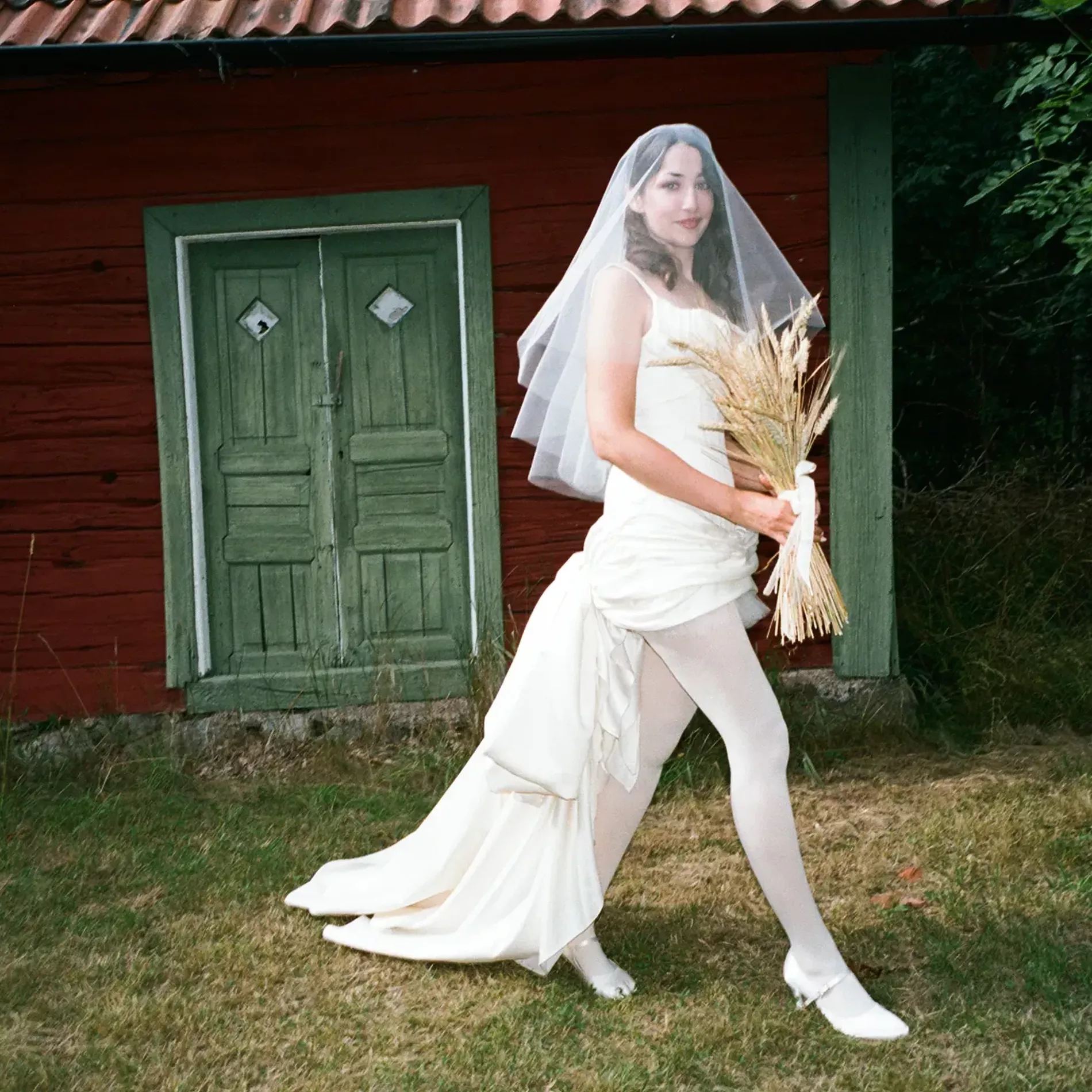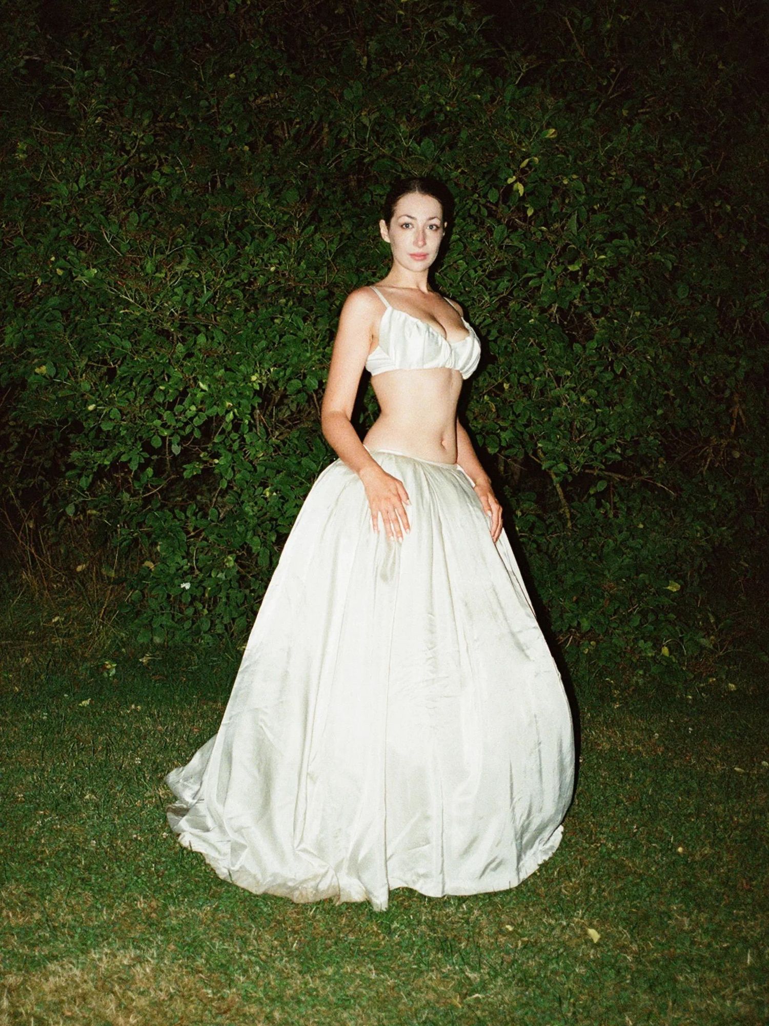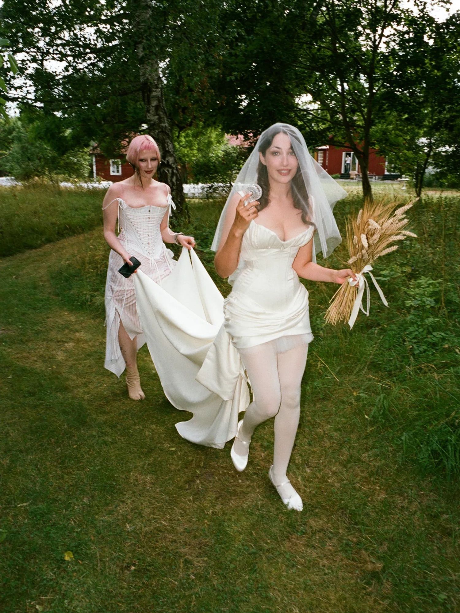 Feeling crafty, the bride made her own veil – as well as the bra top – for the dance outfit that came together with the help of Nicole Walker, an in-demand stylist who works with Yung Lean. “I wouldn’t have been able to do anything without her,” says Hagdahl. “She was the perfect guide. The last look was all her, it was her skirt. It’s an old skirt from the opera house, I think it’s from [a production of] Swan Lake in the ’90s. The top I made, [as] Nicole is always like, ‘You have to go sexier.’ Obviously, this skirt is ridiculous and really fun, but also very beautiful.”