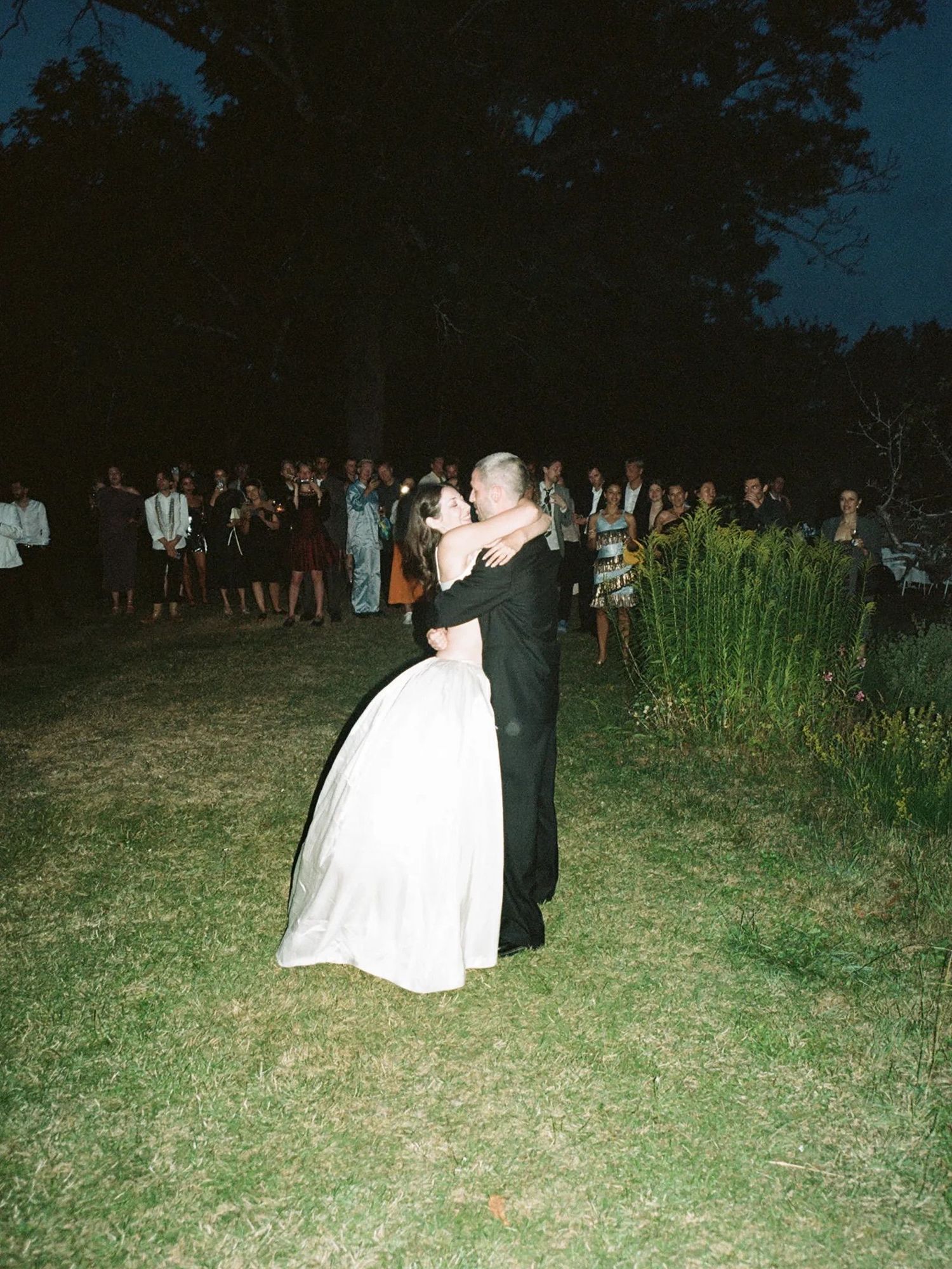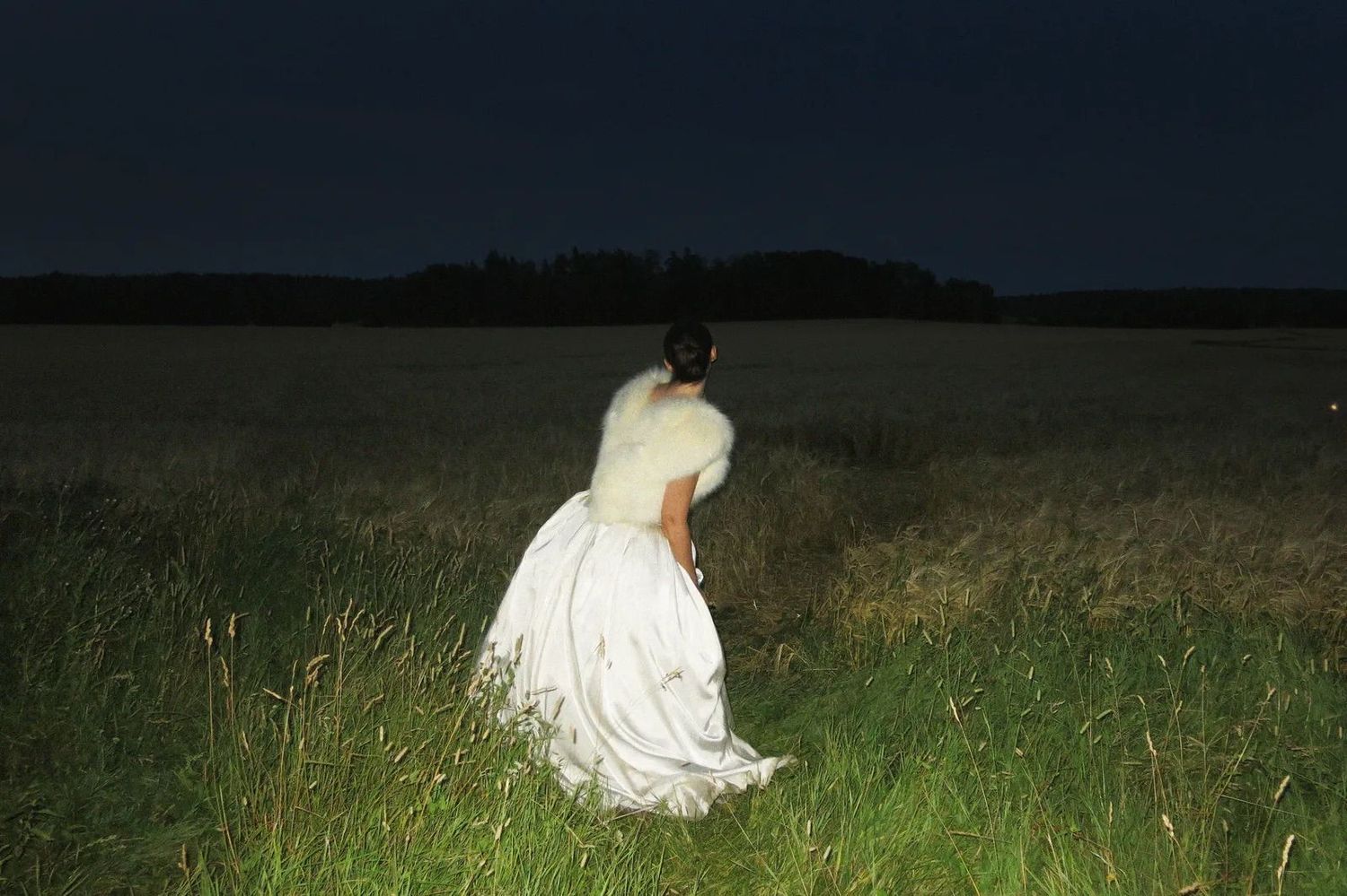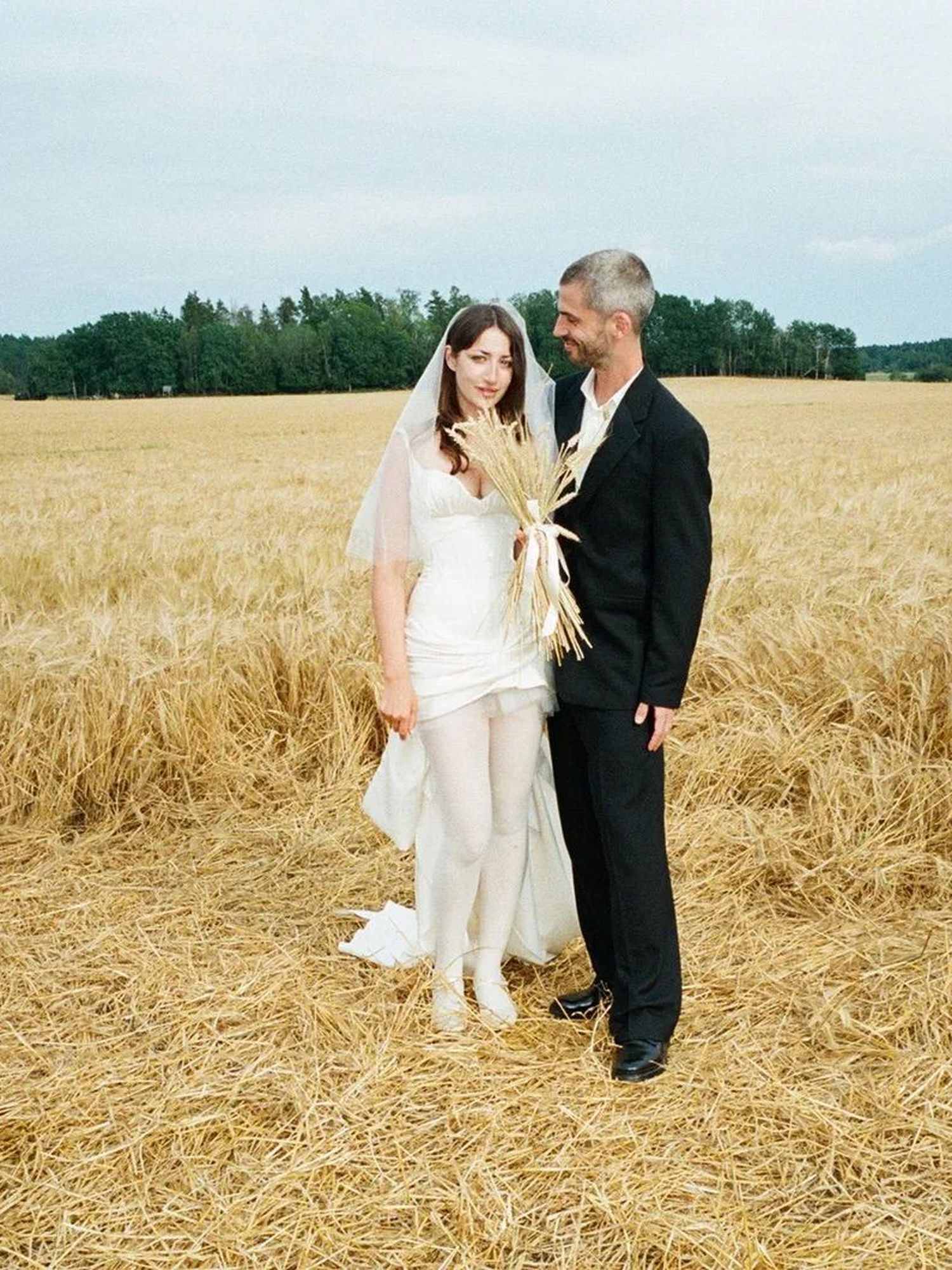 Feeling crafty, the bride made her own veil – as well as the bra top – for the dance outfit that came together with the help of Nicole Walker, an in-demand stylist who works with Yung Lean. “I wouldn’t have been able to do anything without her,” says Hagdahl. “She was the perfect guide. The last look was all her, it was her skirt. It’s an old skirt from the opera house, I think it’s from [a production of] Swan Lake in the ’90s. The top I made, [as] Nicole is always like, ‘You have to go sexier.’ Obviously, this skirt is ridiculous and really fun, but also very beautiful.”