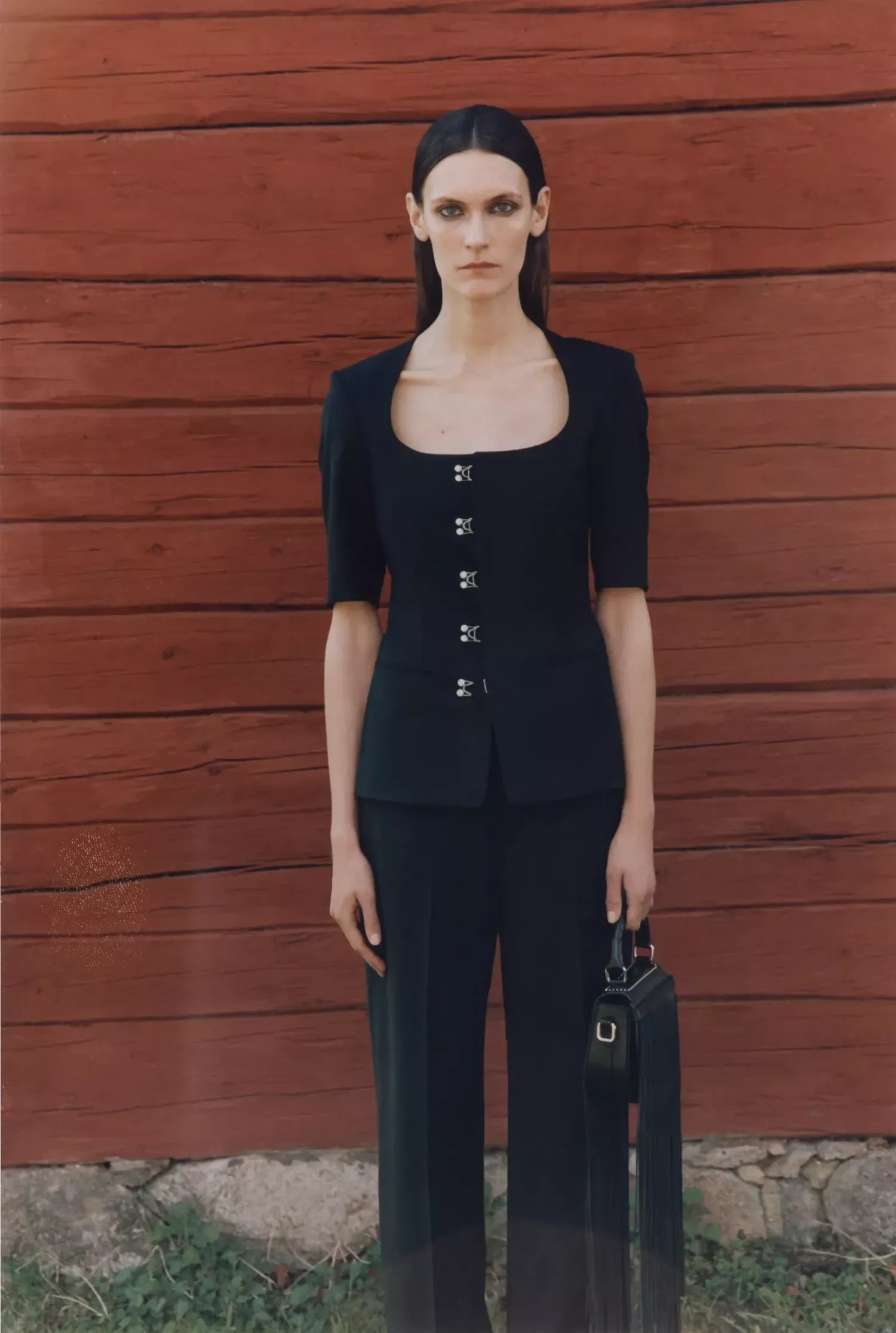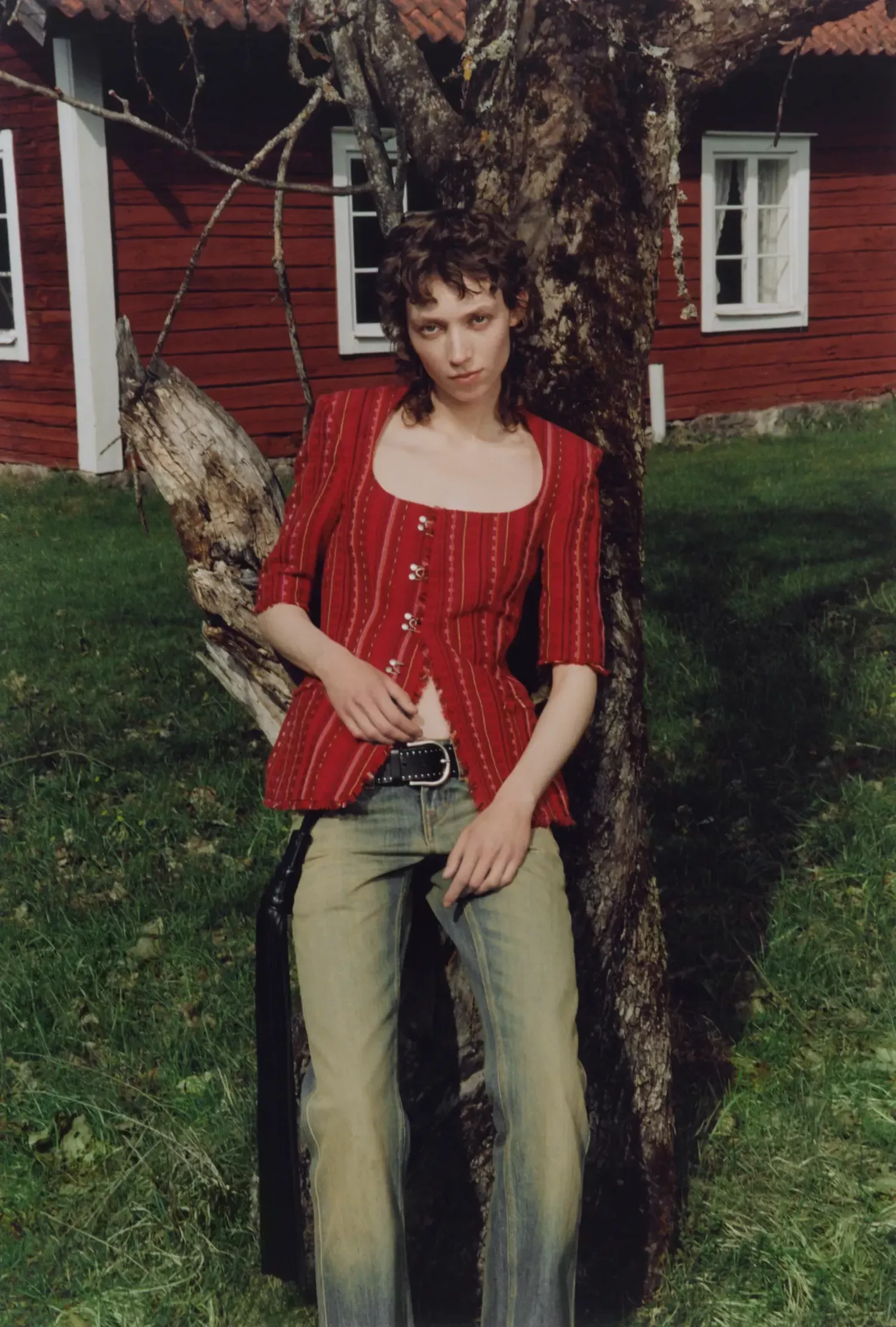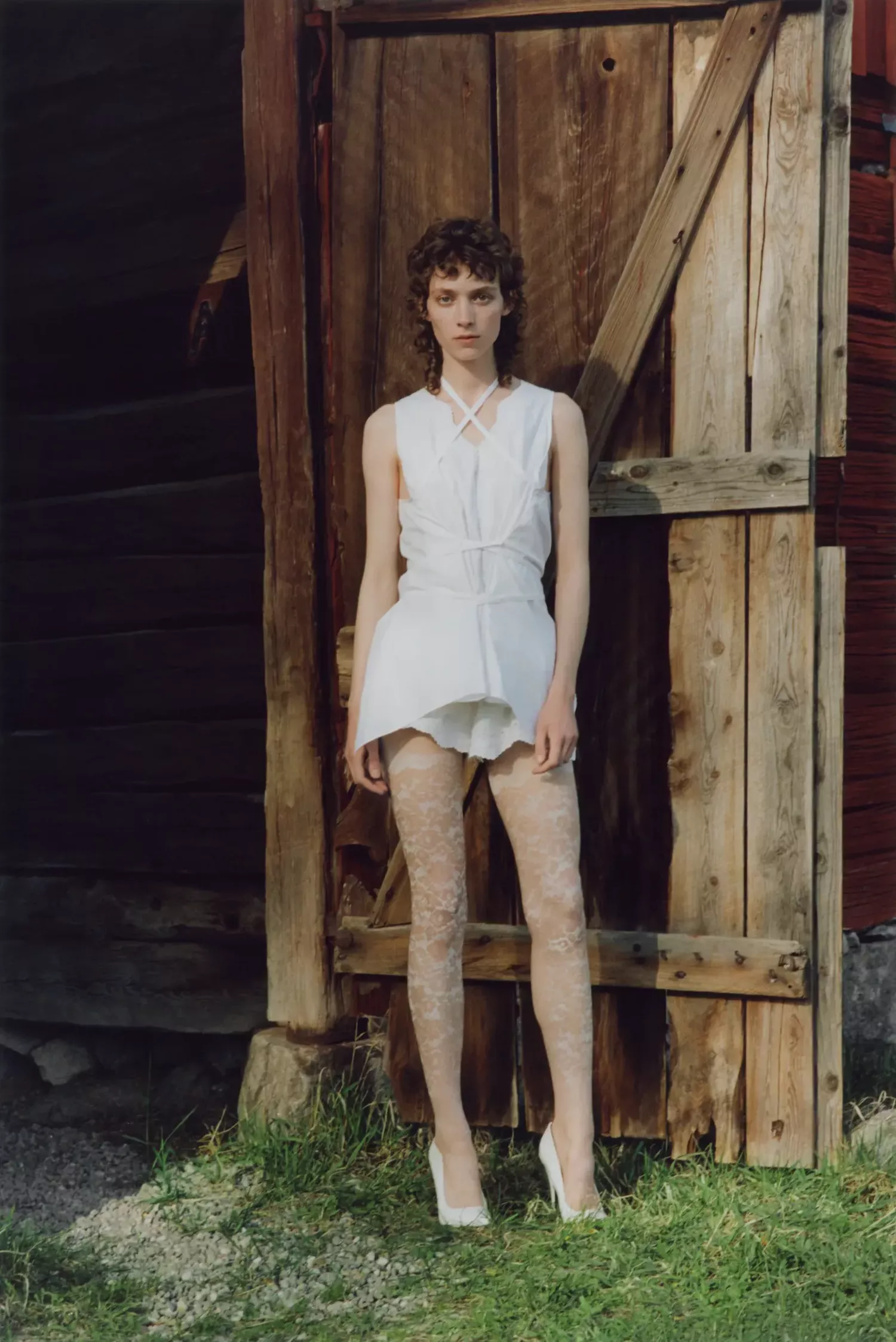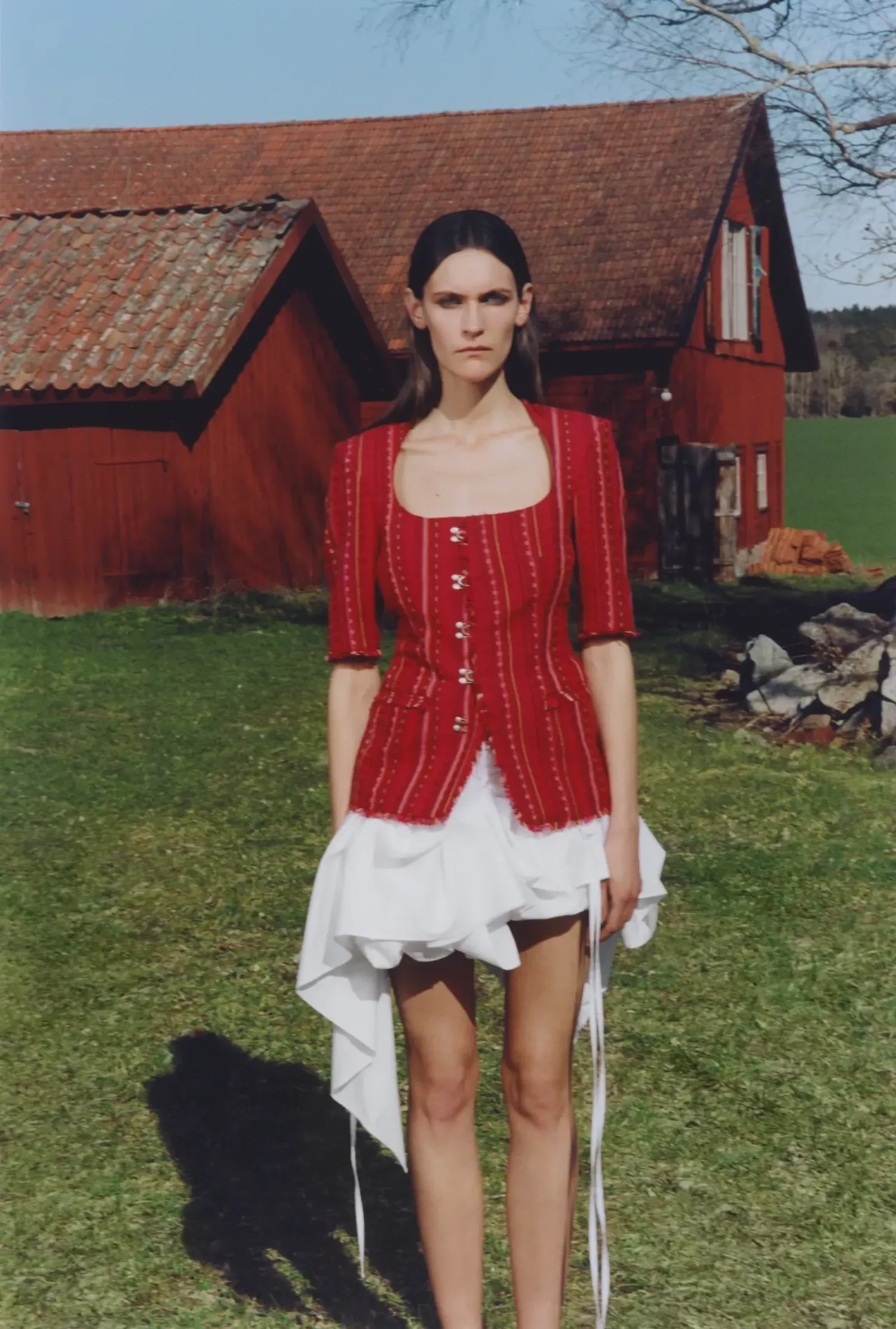 Together with Conway, the duo delighted in blurring lines between real and imagined, new and old, making white cotton pieces inspired by the movie’s negligees. The campaign was photographed at Hagdahl’s red summer house in Stallarholmen, about an hour from Stockholm. They also traveled by train deep into the countryside of Värmland to work with Britt-Marie, a weaver who uses old wooden looms to make fabric for traditional garb. She produced the same material in a pattern the team designed. This is cut into a fetching, trim jacket with hook-and-eye hardware.