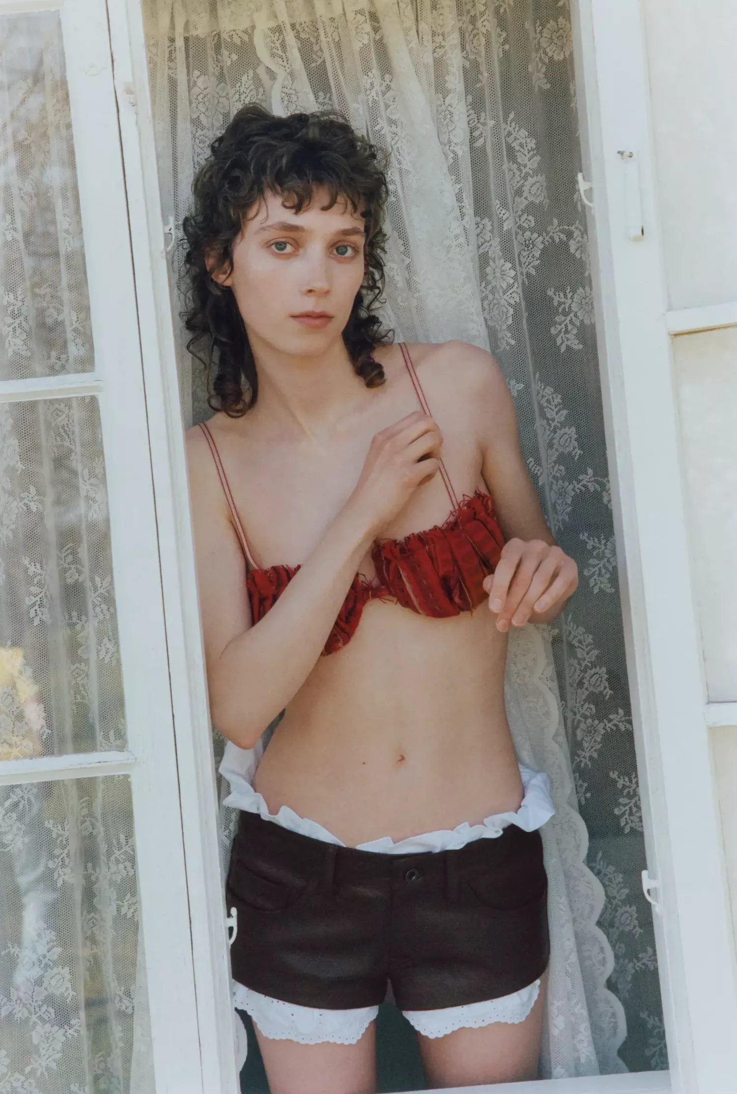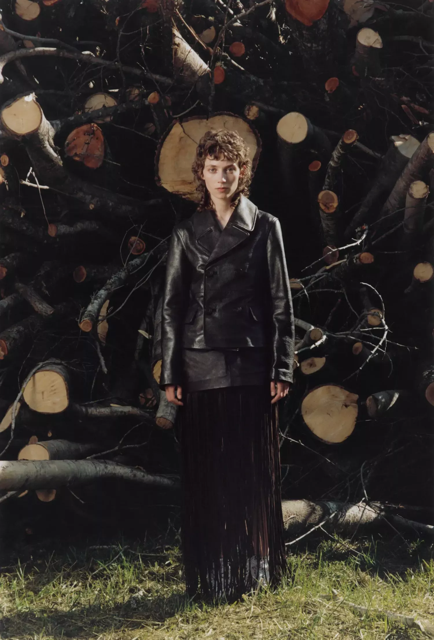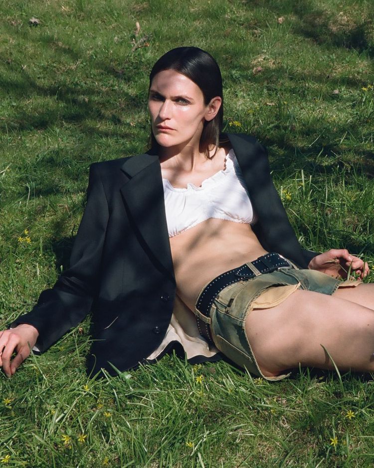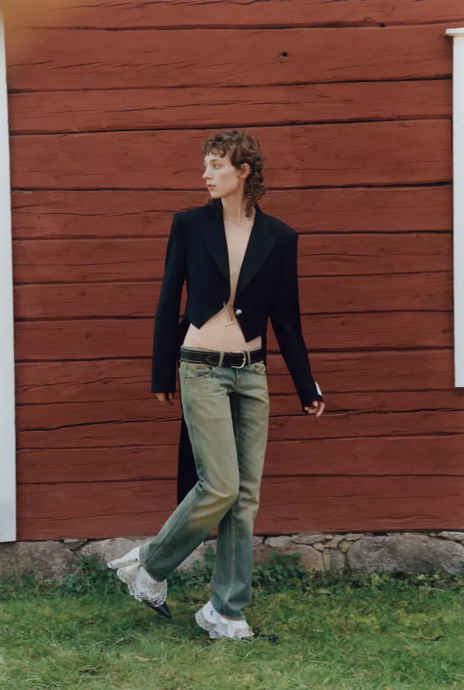 Together with Conway, the duo delighted in blurring lines between real and imagined, new and old, making white cotton pieces inspired by the movie’s negligees. The campaign was photographed at Hagdahl’s red summer house in Stallarholmen, about an hour from Stockholm. They also traveled by train deep into the countryside of Värmland to work with Britt-Marie, a weaver who uses old wooden looms to make fabric for traditional garb. She produced the same material in a pattern the team designed. This is cut into a fetching, trim jacket with hook-and-eye hardware.
