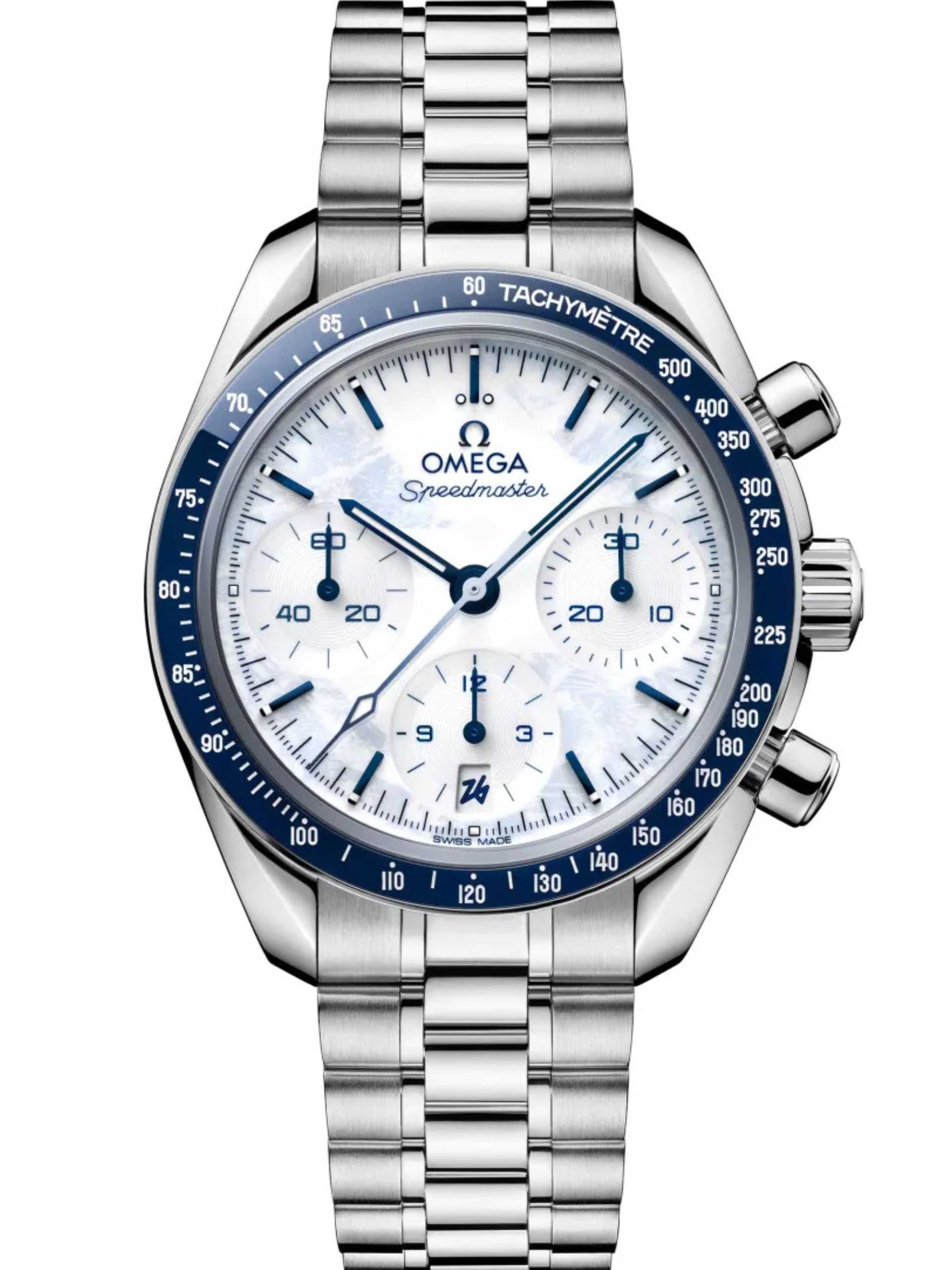 To usher in the Winter Olympics season, Omega have unveiled an exclusive, limited-edition chronograph that's sure to make you freeze in your tracks: the Speedmaster Milano Cortina 2026. As anticipation is beginning to mount, so too is the snow on the peaks of the Dolomites, with just short of 100 days until the quadrennial games kick off once again (the competitions commence soon after the Opening Ceremony lights up Milan’s Stadio Giuseppe Meazza on 6th February). Furnished with a frosted baby-blue dial, a ceramic bezel ring, and a chalk-coloured enamel tachymeter scale, Omega's new design derives inspiration from the emblem of the Games, translated through a 38mm case complete in polished stainless steel.