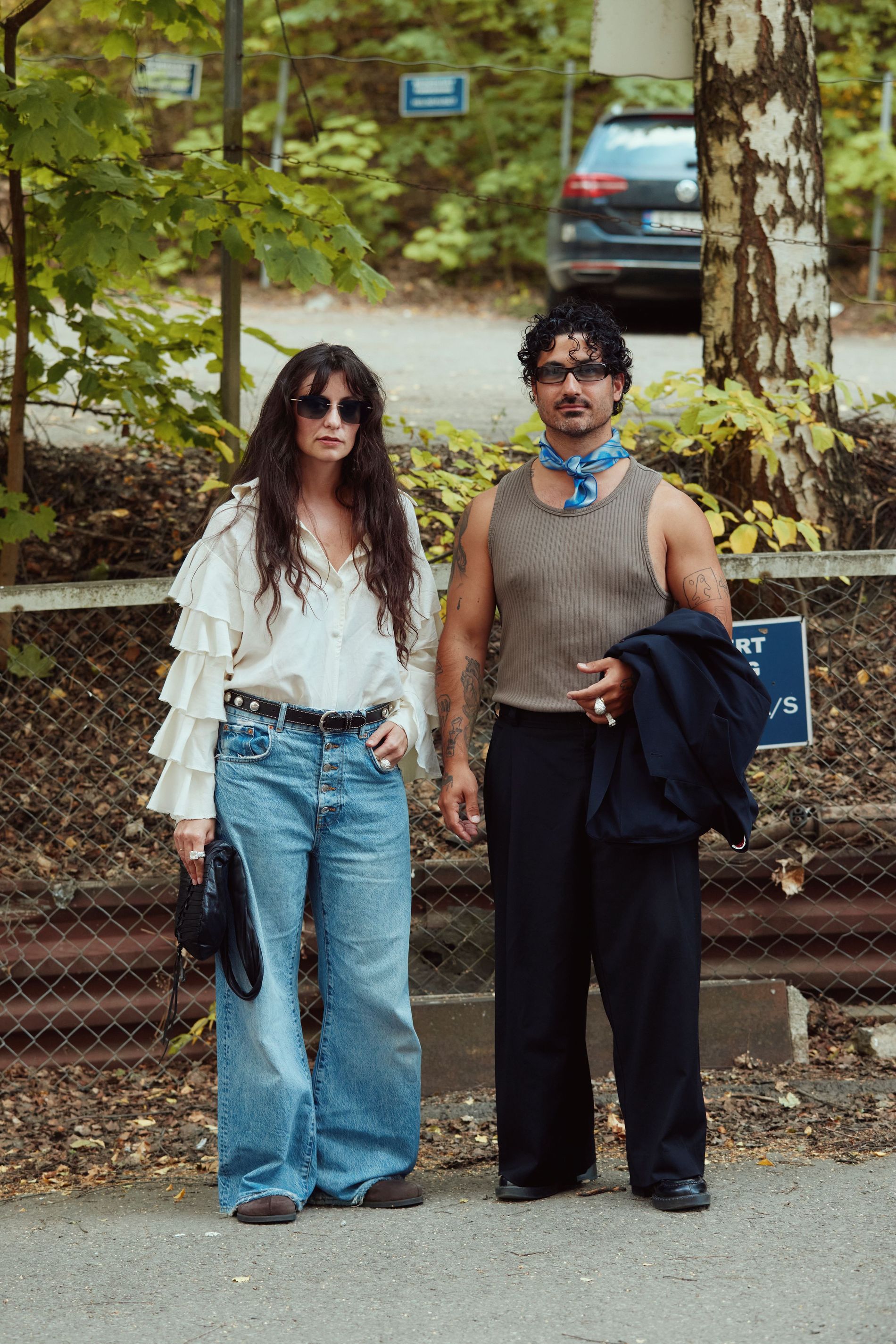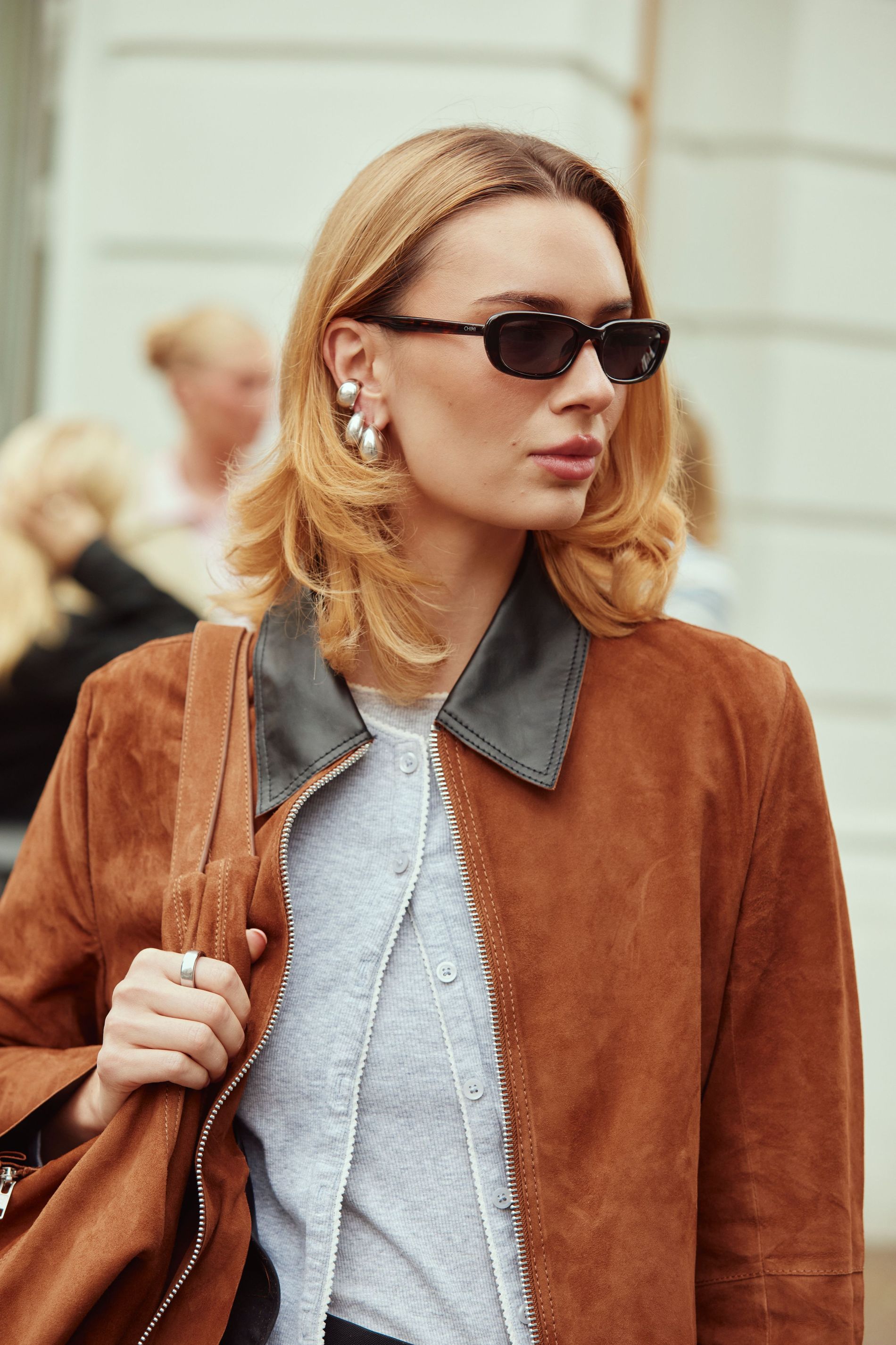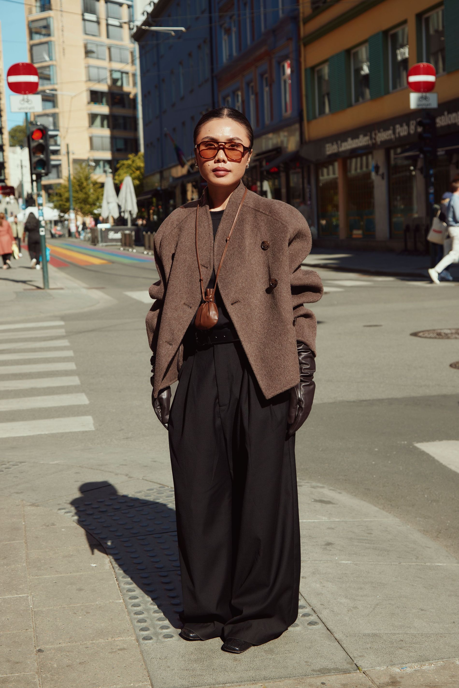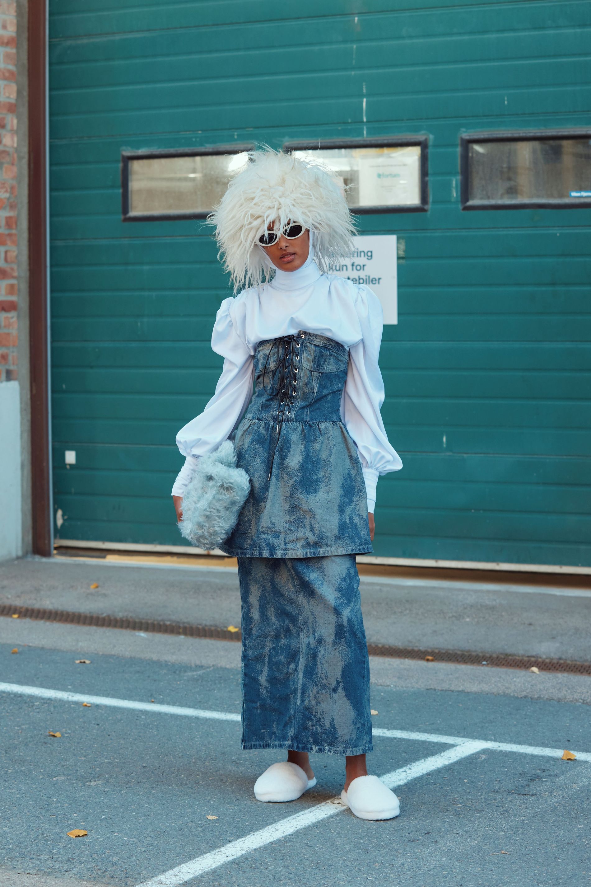 Autumn has arrived early on the streets: suede coats and tan brown hues set the tone, a warm counterpoint to Oslo’s unpredictable mix of sun and rain. Amongst the show-goers, there’s a confidence in mixing codes: denim with opera gloves, ruffles with biker jackets, punk-spiked hair set against clean Scandinavian minimalism.