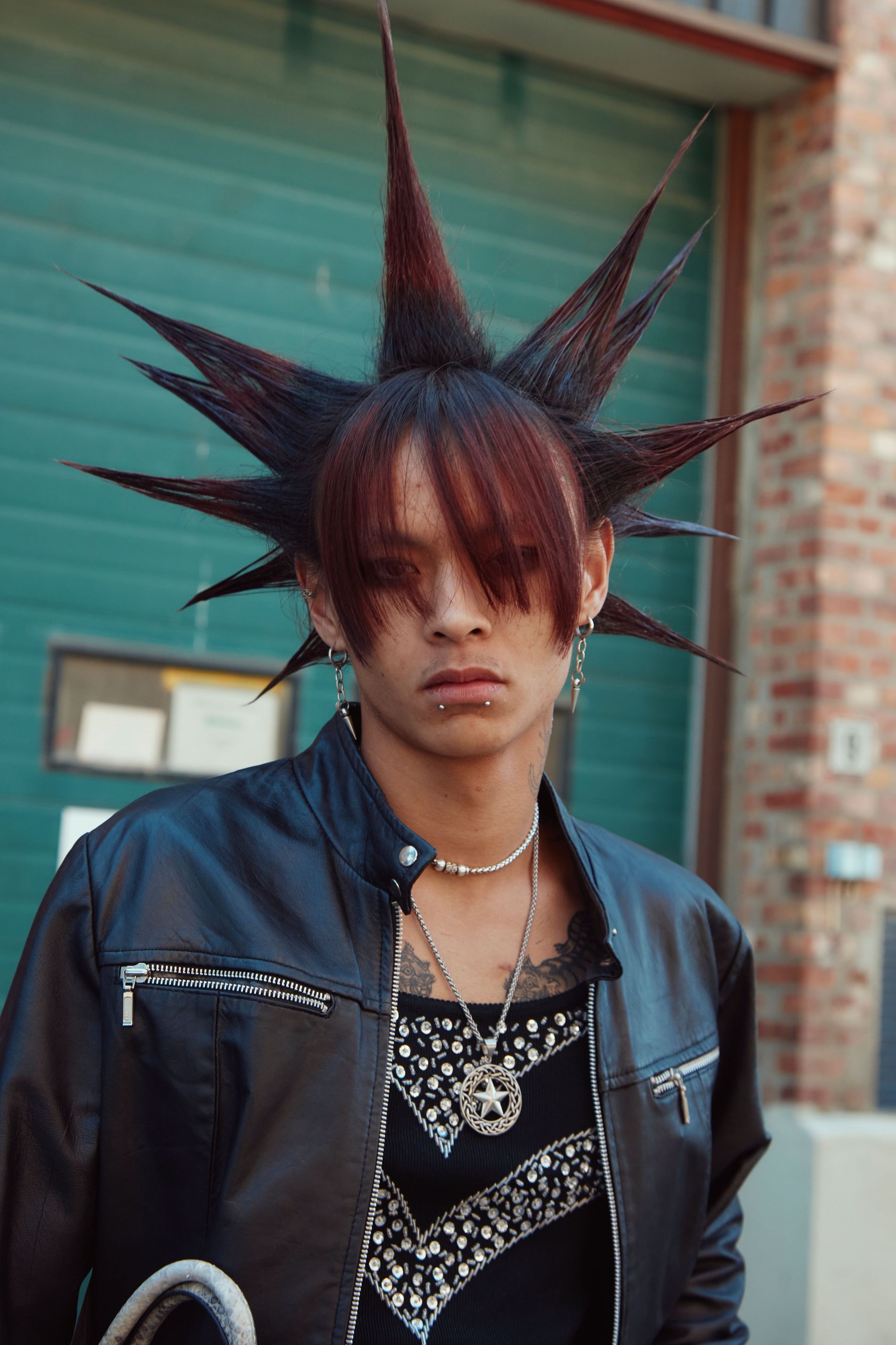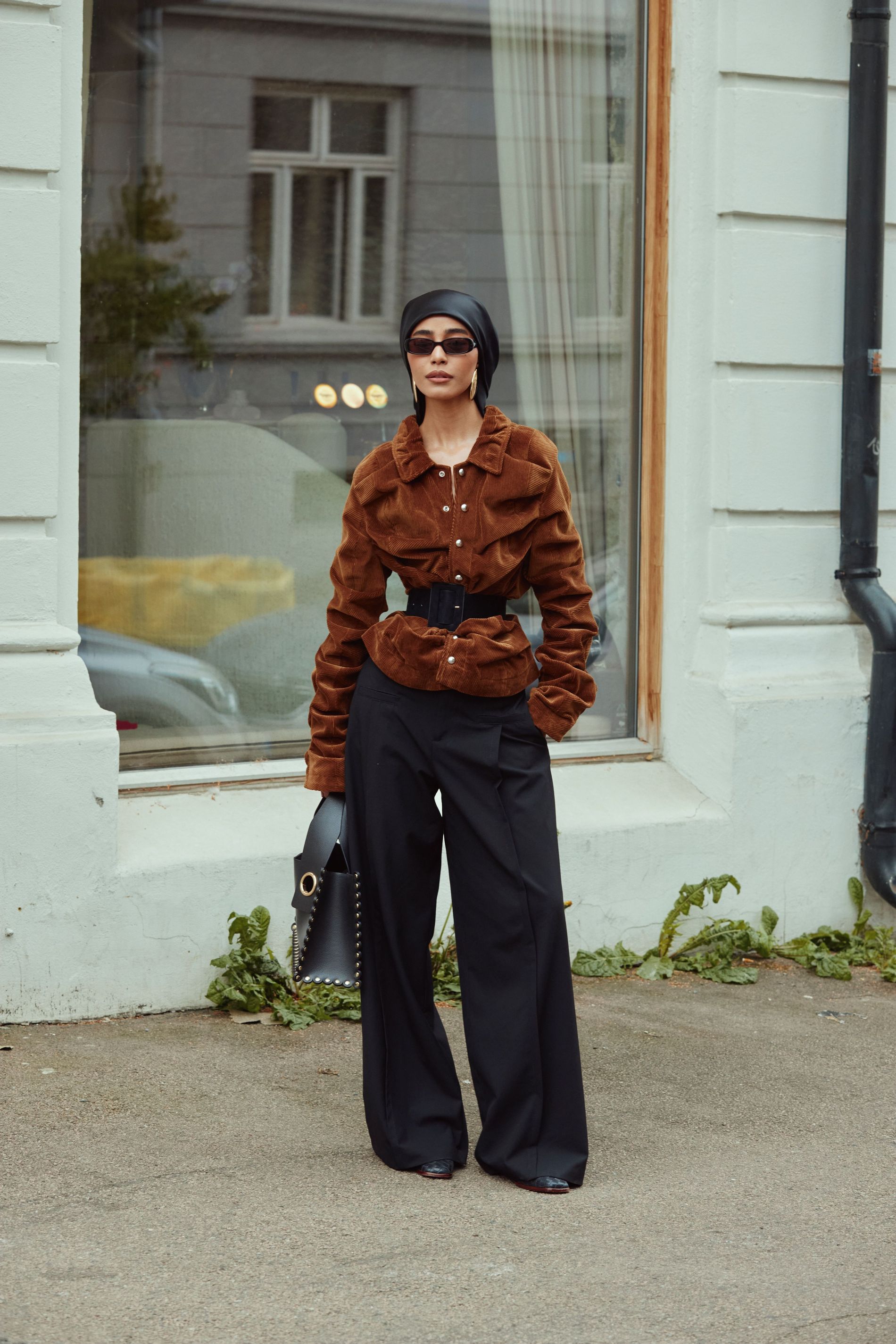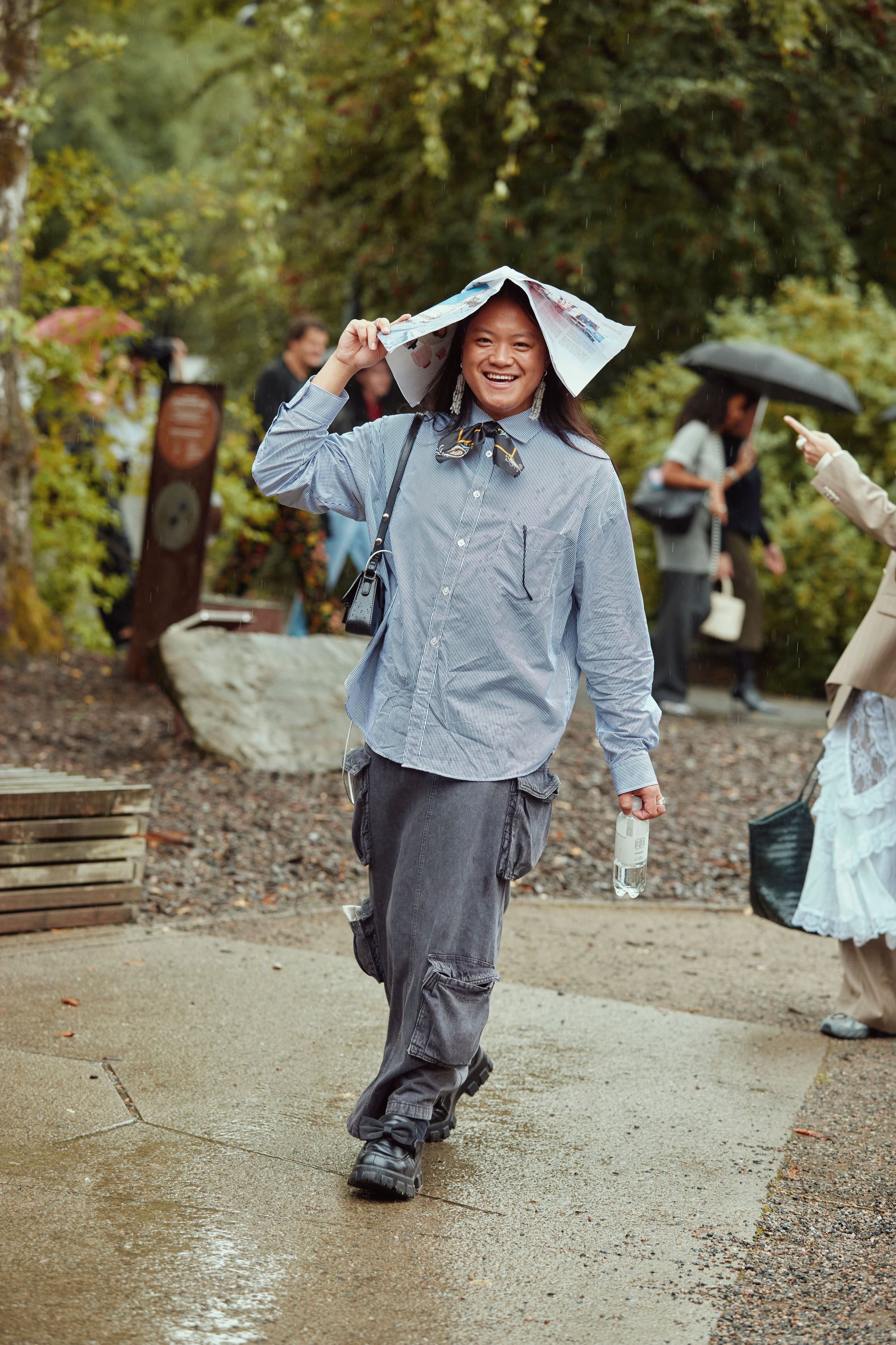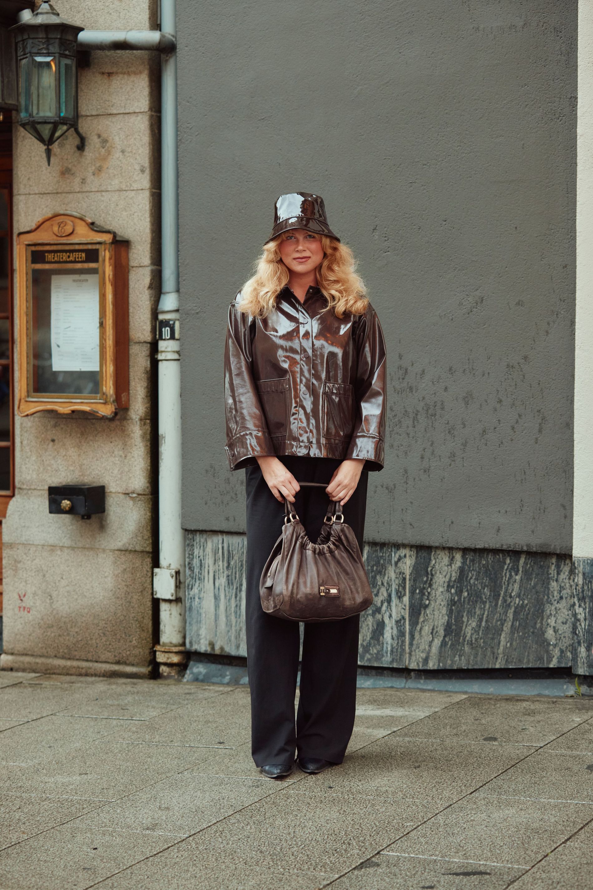 Autumn has arrived early on the streets: suede coats and tan brown hues set the tone, a warm counterpoint to Oslo’s unpredictable mix of sun and rain. Amongst the show-goers, there’s a confidence in mixing codes: denim with opera gloves, ruffles with biker jackets, punk-spiked hair set against clean Scandinavian minimalism.