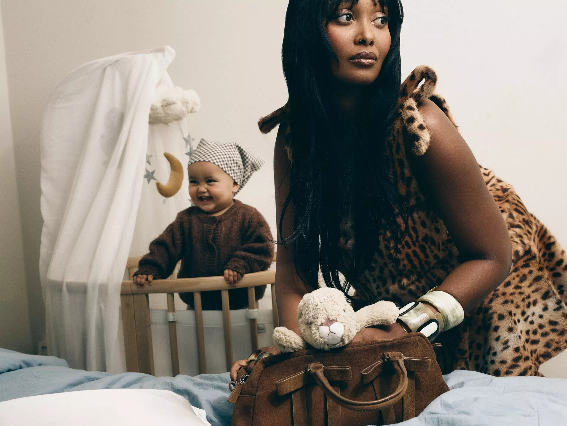 On Mona: Dress, Bag. Both Stand Studio. On Nile: Cardigan. Get Spilled Milk. Head scarf. Petit Stockholm. Baby Crib. Stoke. Baby Mobile. Petite Stockholm. . Photo: Illya Ovchar