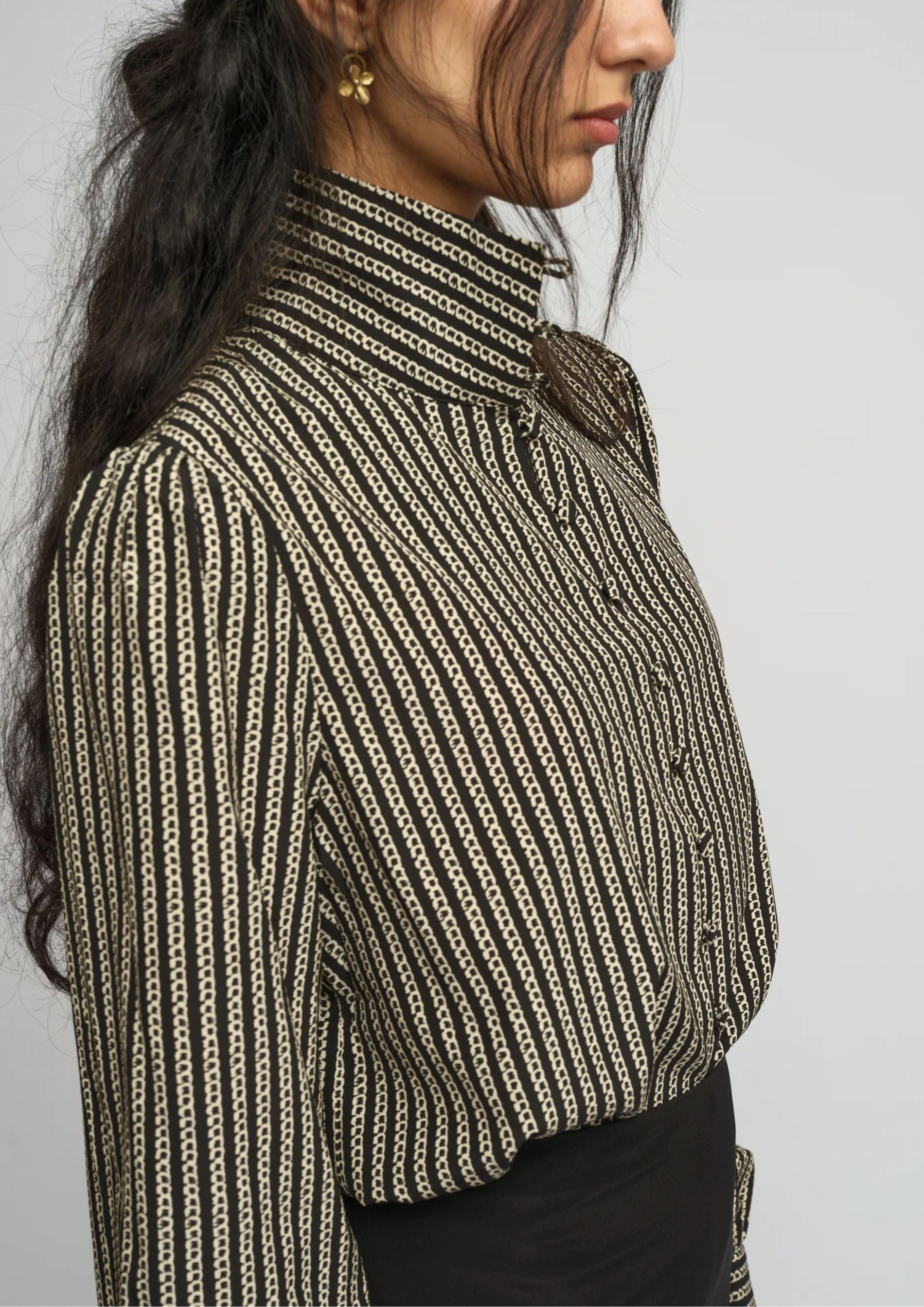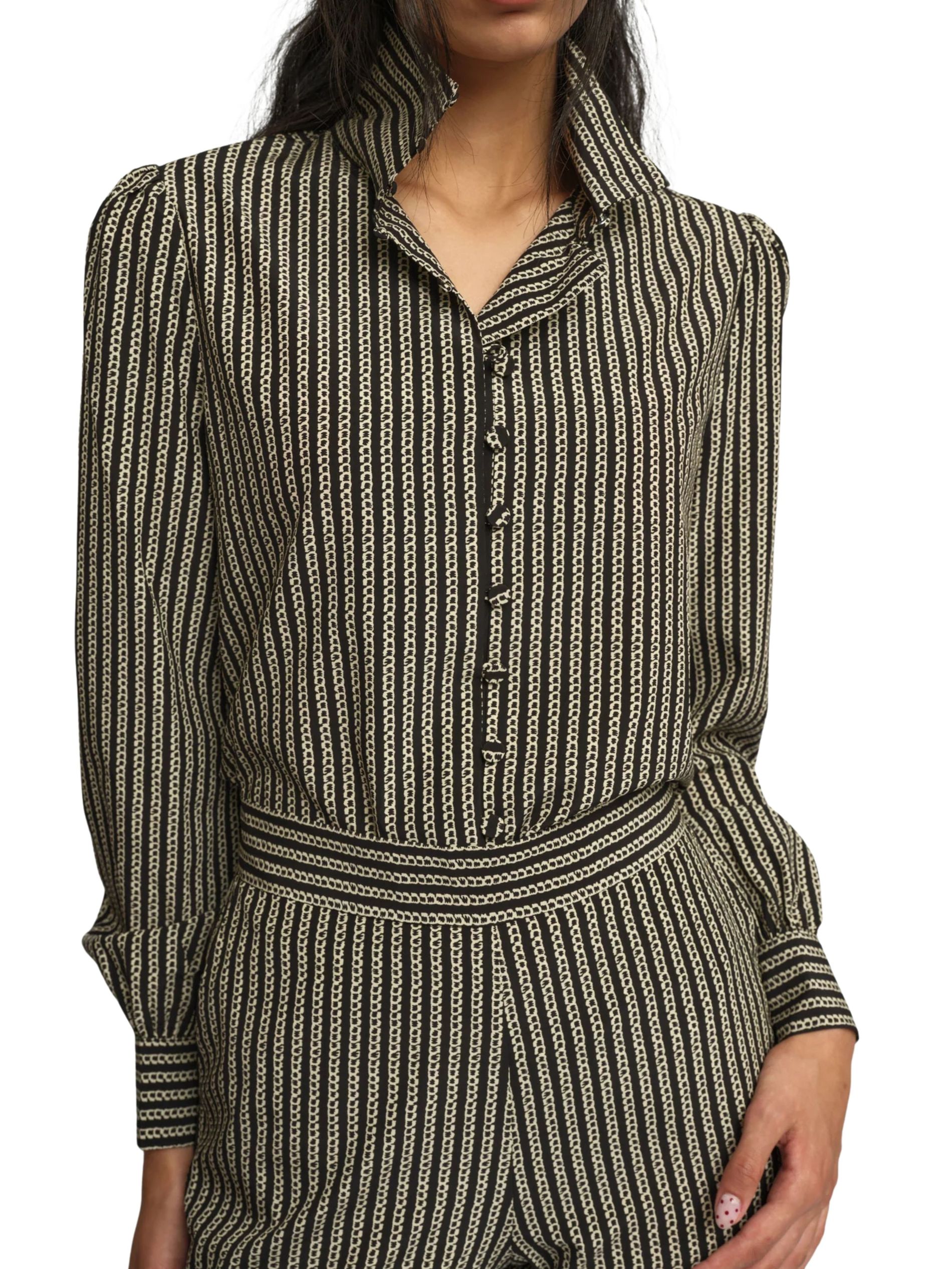 At first glance, the neck-hugging top appears deceptively simple. But on closer inspection one can appreciate its polished row of silk-enrobed buttons, striking feminine silhouette and subtly structured shoulders. Another desirable quality is its versatility, an apt choice for more conservative dress codes, as for an elegant dinner party. As proven by the princess, it can be successfully teamed with loosely tailored trousers (or perhaps tucked into a pair of tapered black jeans) and bolstered further by way of gleaming gold accessories.