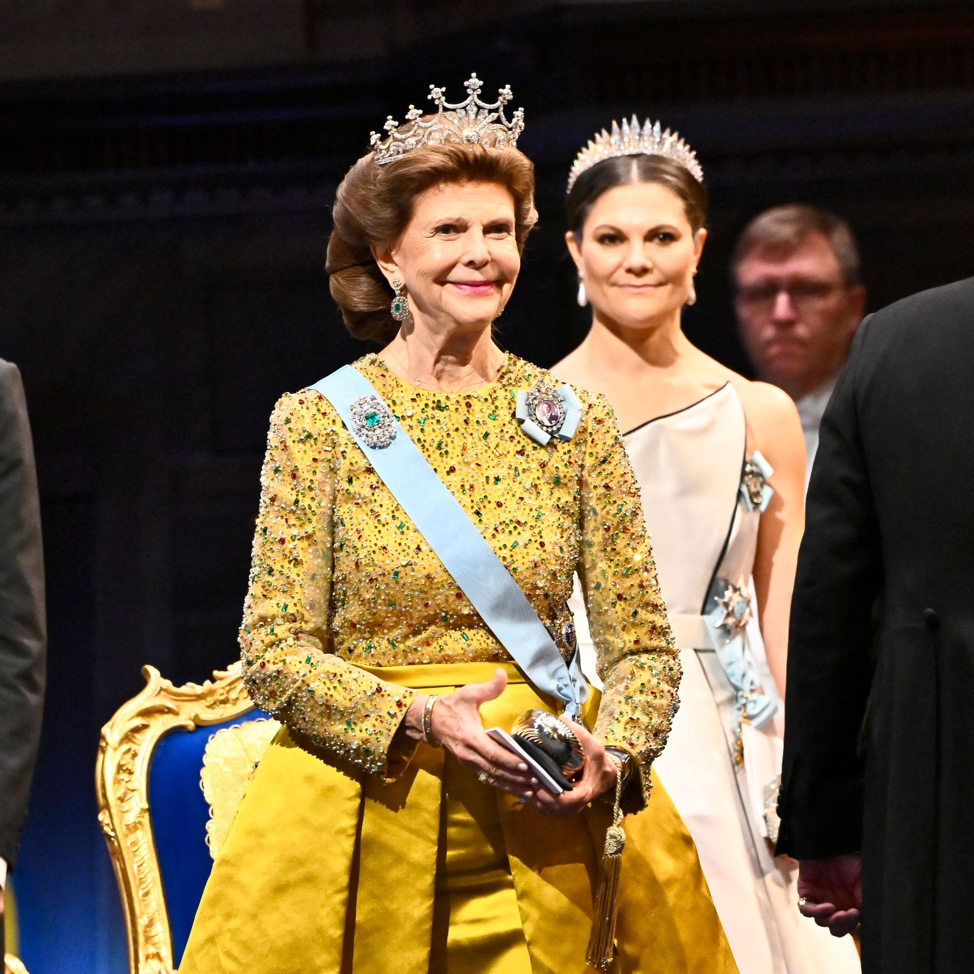 Seeing it again at Nobel tied her look neatly to Her Royal Highness Crown Princess Victoria, who arrived wearing Queen Silvia’s own 1994 Nobel gown. With the Her Majesty in Jubilee gold, and the Crown Princess in Nobel ’94, it seems the Queen's fashion archive did a lot of heavy lifting this Nobel night.