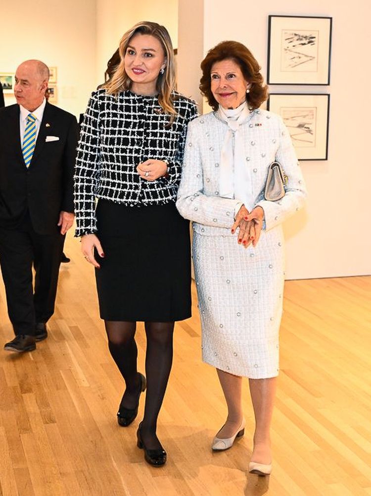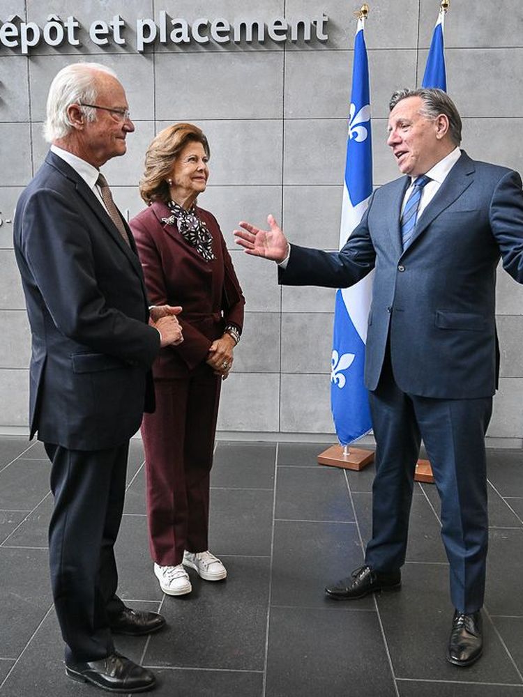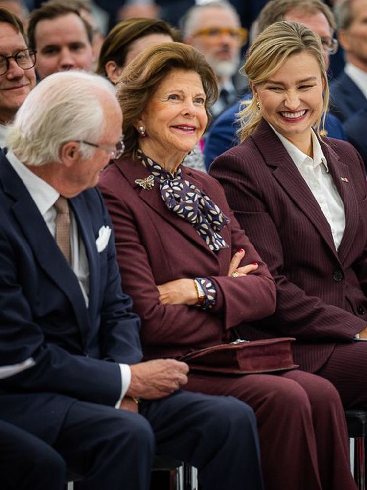 On the final day of the visit, while touring aircraft manufacturer Bombardier Aerospace, Queen Silvia delivered a refined take on office-casual dressing. The monarch wore a burgundy suit by German label Georg et Arend, paired with a geometric-print blouse from the same brand. She added a contemporary, street-smart twist by grounding the tailored ensemble with crisp white Rieker trainer.
