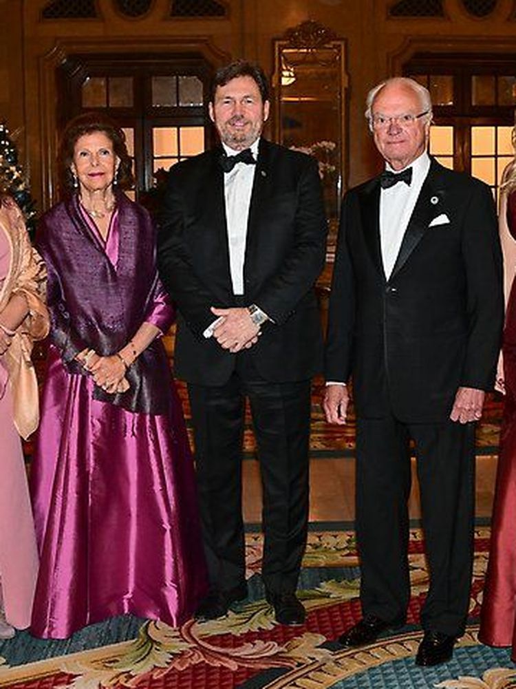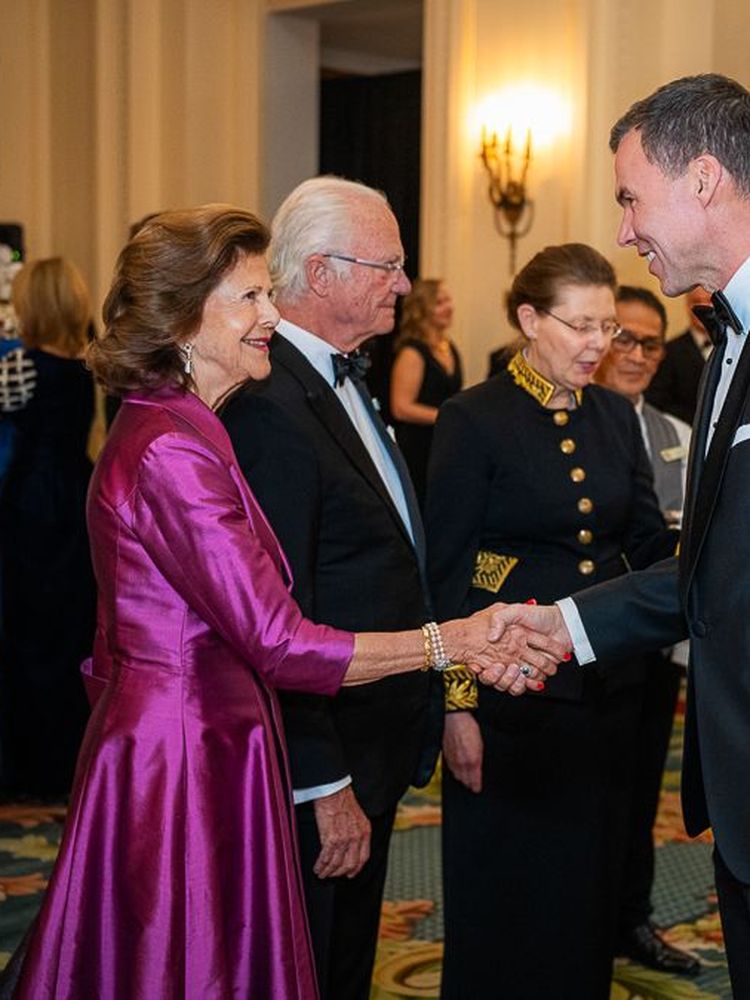 The traditional reciprocal dinner, hosted by the King and Queen on the second night of their visit, unfolded at the iconic Fairmont Château Laurier hotel. For the black-tie affair, Queen Silvia opted for a striking fuchsia, floor-length wrap gown by Swedish label Thalia, distinguished by its crystal-button detail. She layered the look with a soft mauve pashmina, and once again wore the King’s Royal Family Order.