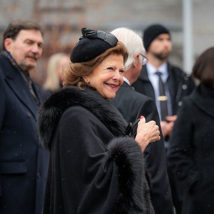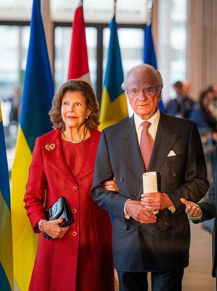 Upon arrival in Canada, King Carl Gustaf and Queen Silvia were welcomed with full ceremonial honours at Rideau Hall. For the occasion, Queen Silvia made a considered tribute to her hosts through her attire, opting for a striking red dress and matching coat in a clear nod to the Canadian flag. To face the northern chill, she draped a black faux-fur cape coat over her shoulders, finishing the ensemble with a chic Philip Treacy beret and a statement Joan Rivers bow brooch.