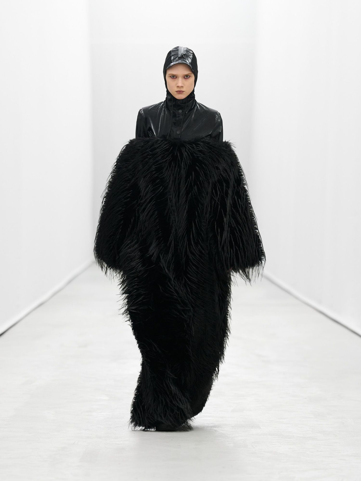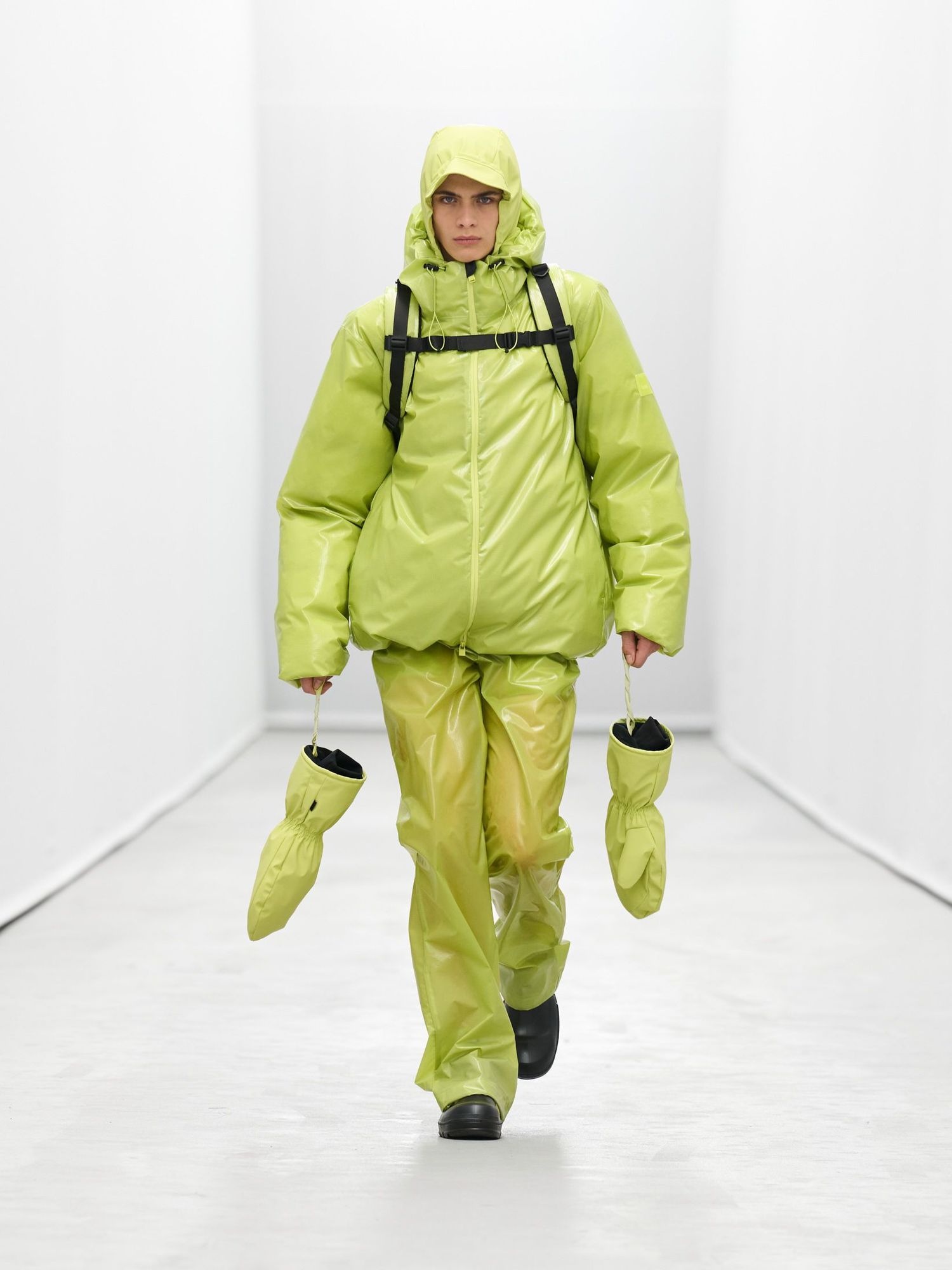 Looking to what was presented on the runway, Rains proposes facing the elements with a little humour. Accessories that swallow the wearer entirely in sensorial materials. At other times, garments were blown up to the extreme. Extreme pieces for extreme turbulence.
